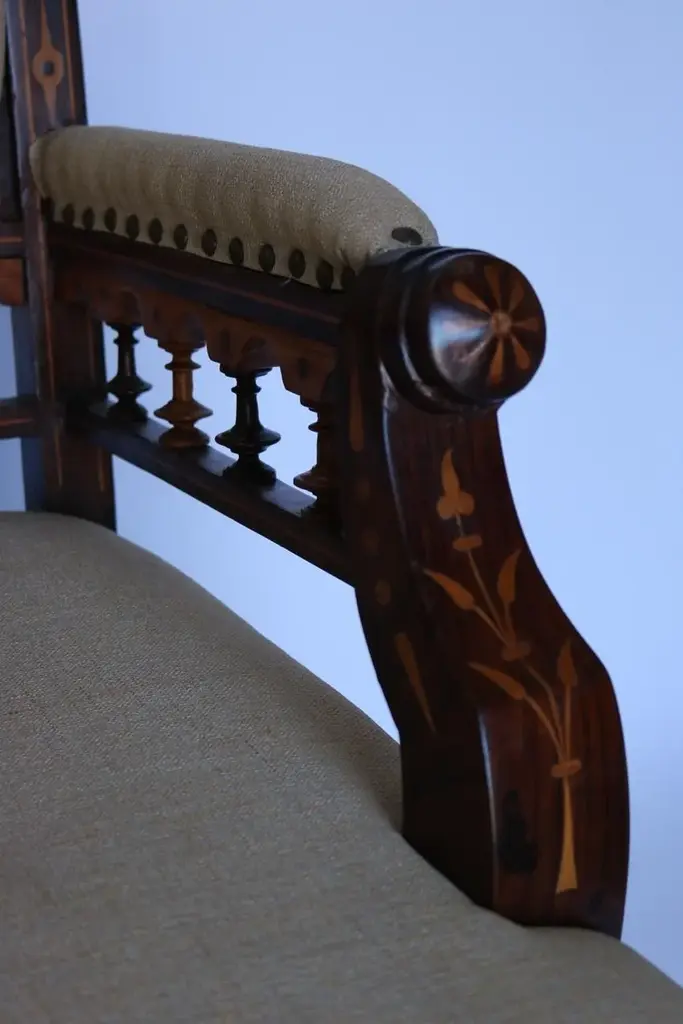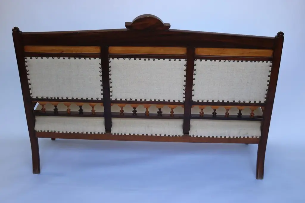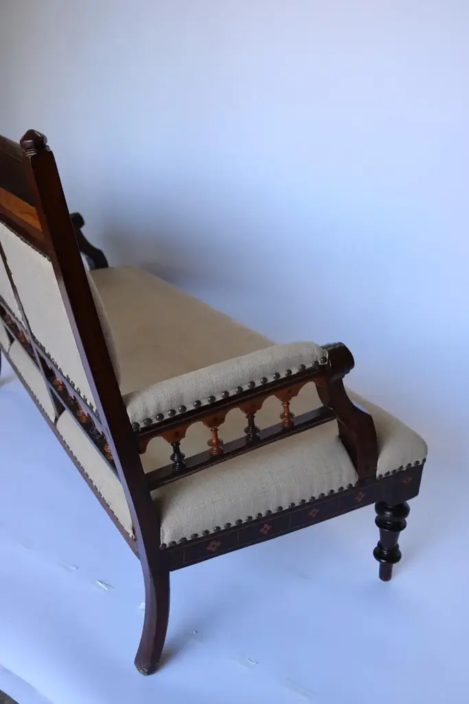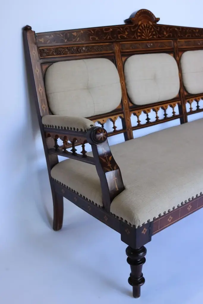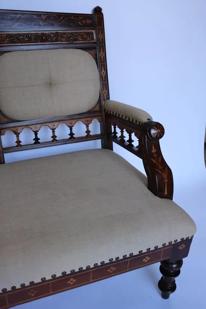 Pair of satin Wood beautiful inlaid love seat from India. With hand carved panels. early 20th century. We found the pair in New Delhi India. Needs to be re upholstered