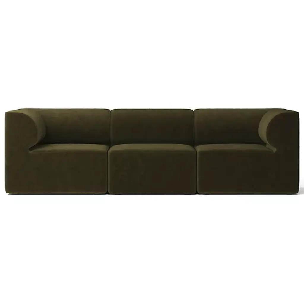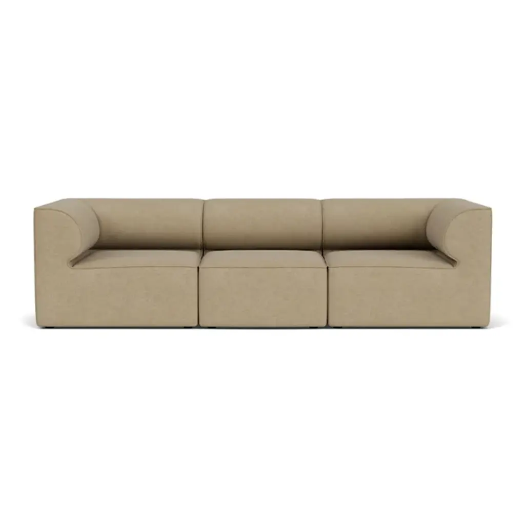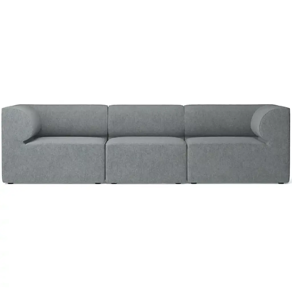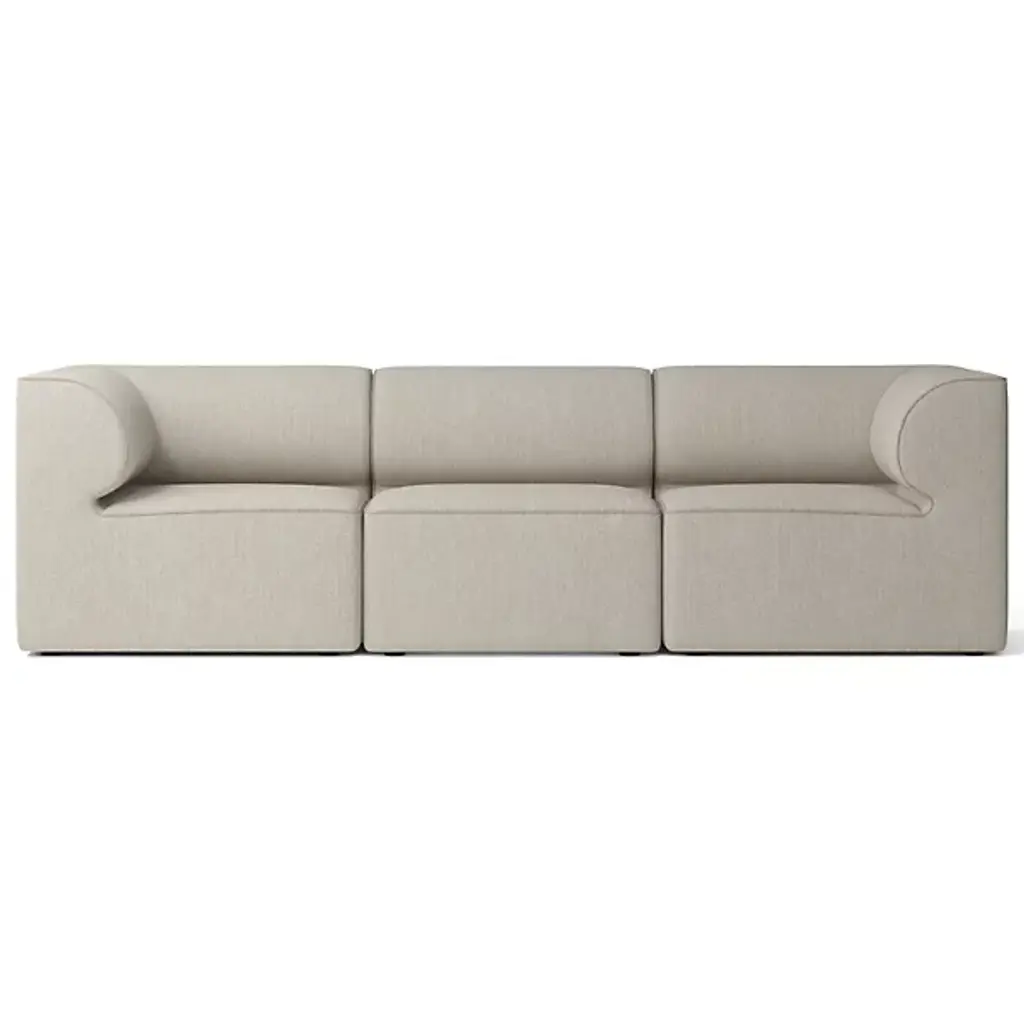 Quiet yet expressive. The Eave 3-Seater Sofa Combination from Audo Copenhagen, formerly known as Menu, is a Scandinavian-style, contemporary seating solution. It engages the senses with a lovely set of curves whose depth recalls the jutting eave of a roof. The sofa’s architectural inspiration is fitting for the multi-faceted designers of Norm Architects. The studio uses a ‘soft minimalism’ approach that makes it so that each piece leaves nothing to add or subtract. This piece does so with an engineered wood geometric framework. The position of the seat and backrest gives the user a stately posture with a slight lean. The body leans into the curving back and armrests, whose depth evokes the hanging character of an architectural eave. High resilient foam pairs with fine upholstery to fill out the sofa’s ample comfort.