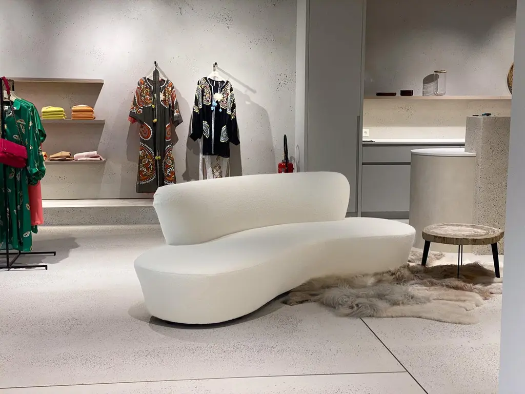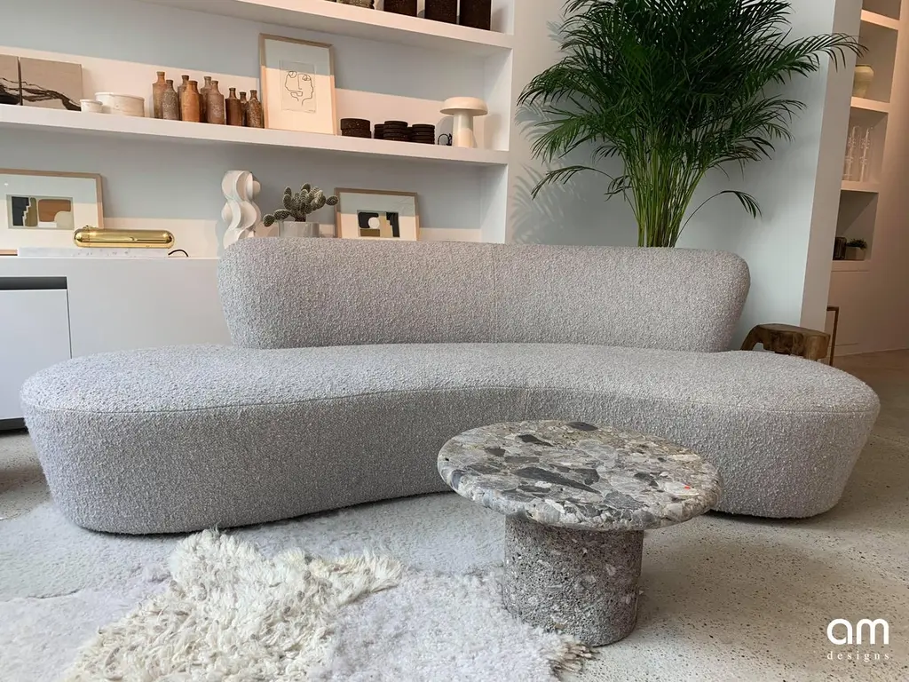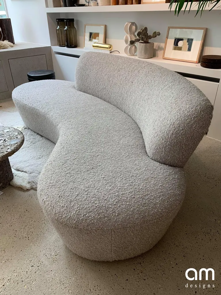 The Eclipse Sofa by am designs is a bold, sculptural statement piece that merges comfort with contemporary design. Handmade in Belgium with fixed upholstery, its organic curves and rounded volumes evoke a sense of softness and fluidity, bringing both visual interest and relaxed elegance to any interior. Available in a variety of sizes and fabrics, the Eclipse can be tailored to fit your aesthetic. The fabric as shown here is Bouclé Grey (71% Linen). Whether placed in a residential lounge or a refined public space, the Eclipse Sofa reflects am designs’ dedication to high-end craftsmanship, material richness, and sculptural clarity. Made to order.