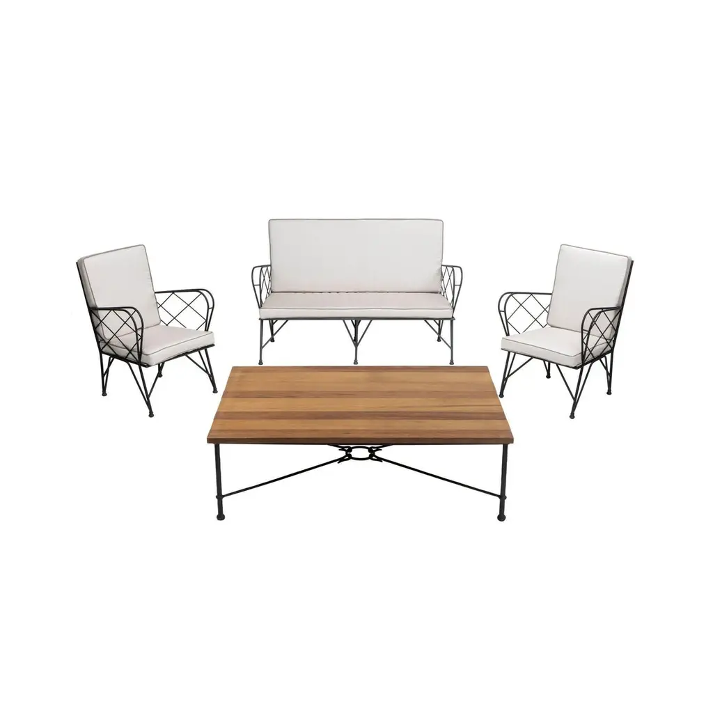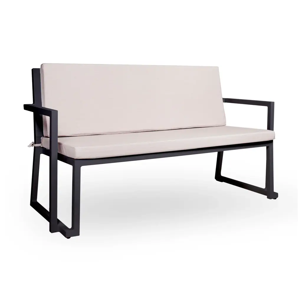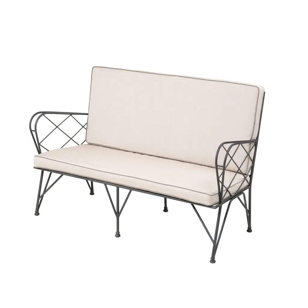 Made of high-quality materials, this sofa provides a cozy place to relax and entertain outdoors. Add a touch of elegance to your patio or garden with our iron sofa, perfect for creating a cozy and inviting atmosphere for guests during afternoon teas or summer evenings, the Eden bench comes complete with outdoor cushions in cream tones with gray piping.