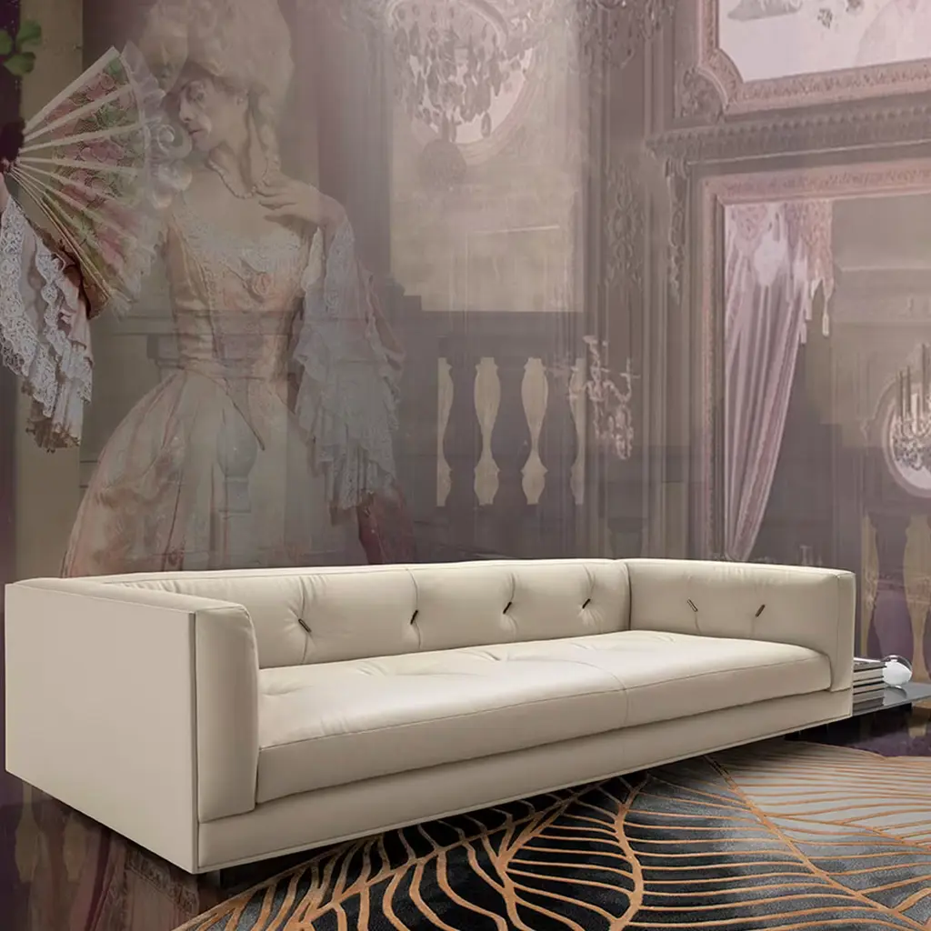Modern sophistication and timeless versatility characterize this exquisite sofa, ideal for a contemporary interior. Made of multilayered poplar plywood with a front metal frame and elastic straps, it features a padded backrest enriched with an elegant tufted motif on the beige leather upholstery and a softly padded seat filled with double-density polyurethane foam, covered with a memory foam sheet and an acrylic layer. It rests on short feet in lacquered steel.