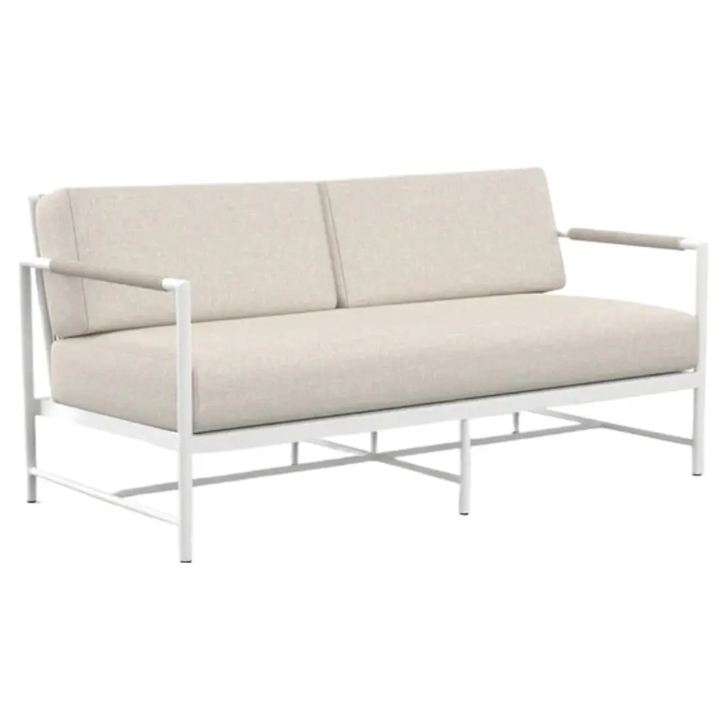 Informed by mid-century design, the Eleandra Sofa incorporates the best of classic proportions with modern materials. Inspired by the subtle tones of natural stone, this piece features a rounded tube frame and mid-rise back, perfectly scaled for smaller spaces and casting a compelling profile. It boasts a fully welded, scratch-resistant powder-coated aluminum frame and is wrapped in weather-resistant colorfast rope. The sofa includes weather-resistant, high-resiliency foam cushions and non-marking plastic glides. With commercial quality construction,
