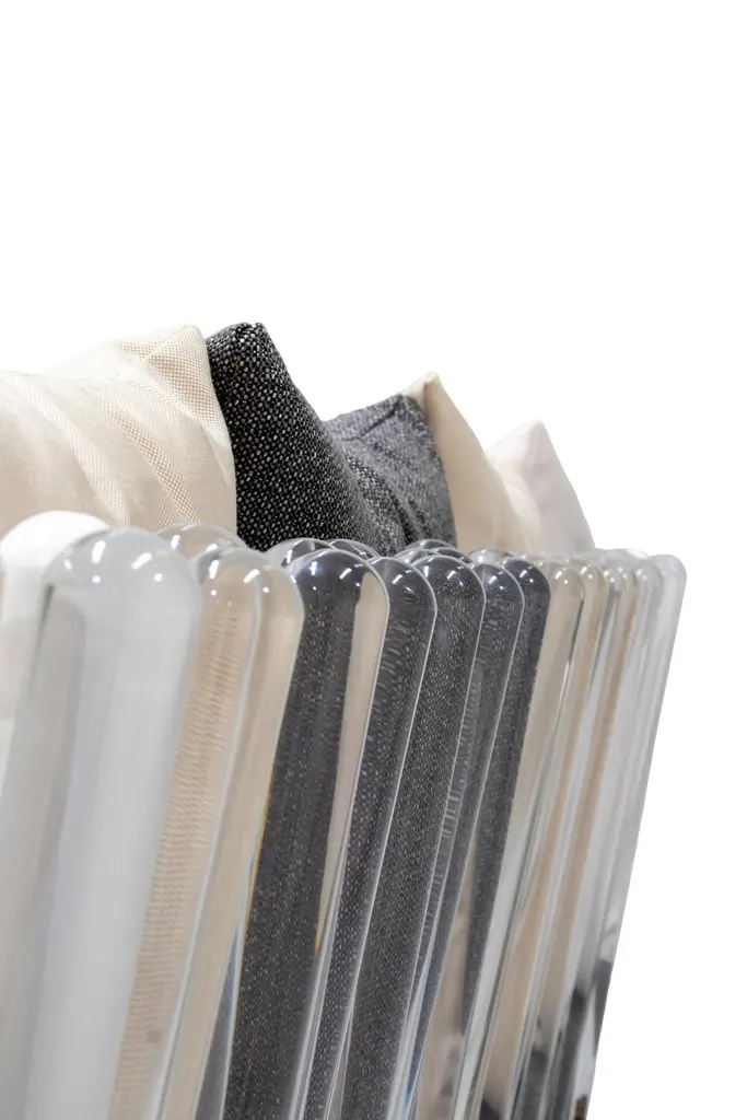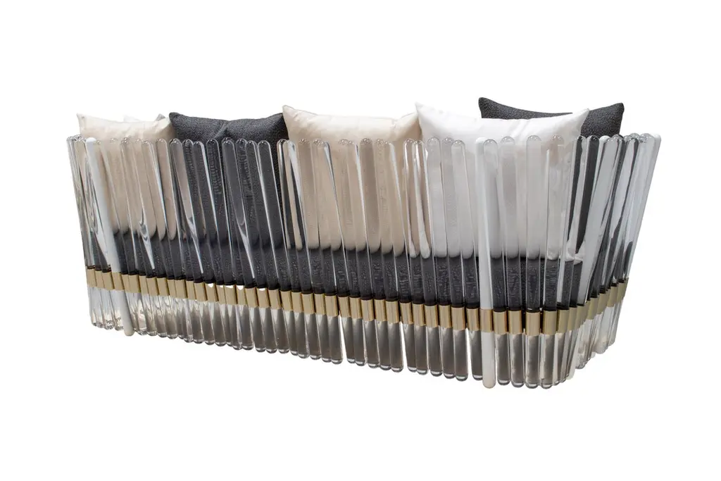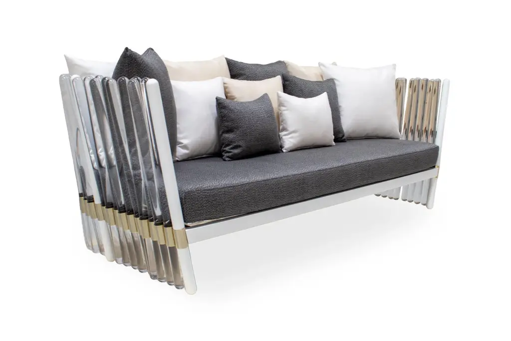 Houdini Sofa Where the magic of sunsets and dawns come alive in bold, innovative forms. The Houdini sofa is a masterpiece where modern elegance meets visionary design. As light and shadow play through the acrylic waves, the chair blends effortlessly with its surroundings, creating a harmonious fusion of timeless design and outdoor allure. The whole design of this contemporary outdoor sofa was developed according to the following structure: - Metallic Structure: Black matte stainless steel;- Metallic details: Gold-plated stainless steel;- Rods: clear acrylic;- Upholstery: Beige and white acrylic fabric;All Myface materials are from premium suppliers, engineered to offer the best performance possible outdoors.Water, Mold, Mildew, UV, and Fading resistance are some of the characteristics that you can expect from both materials, which are available in a wide array of colors and patterns.The elegant but comfortable design of the Houdini sofa transforms the outdoor moments into a magical scene and the composition and materials of this furniture piece allow it to blend into any type of outdoor or even indoor space. Pillows included.