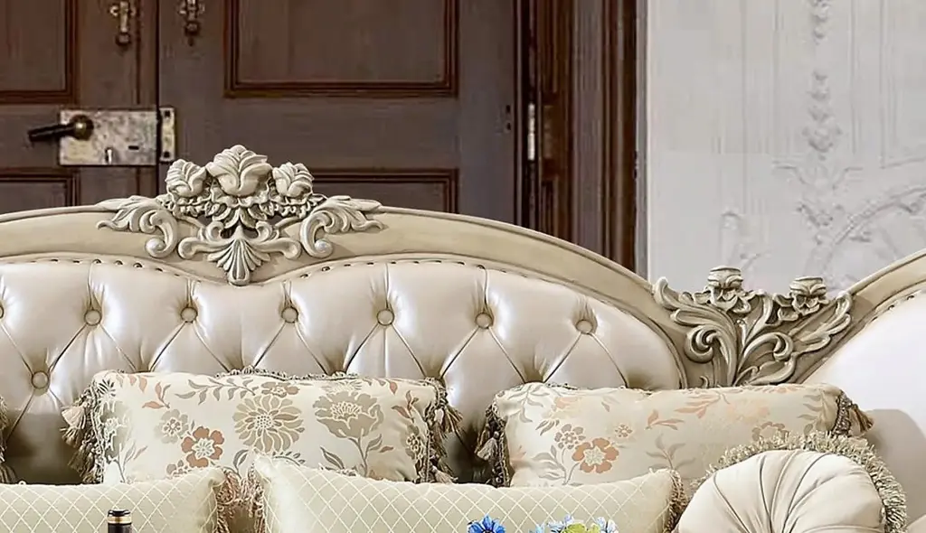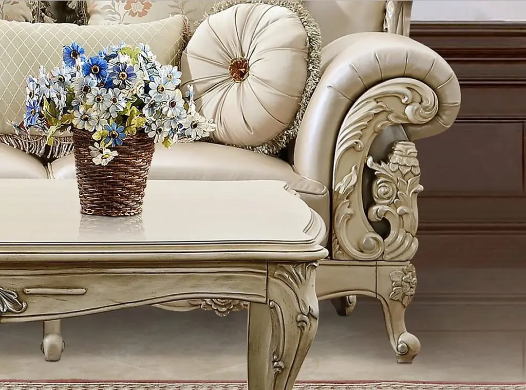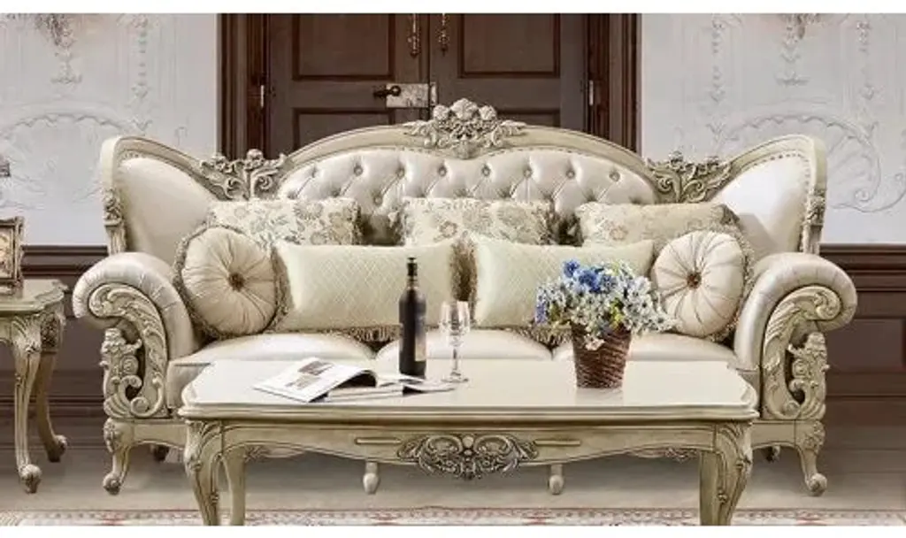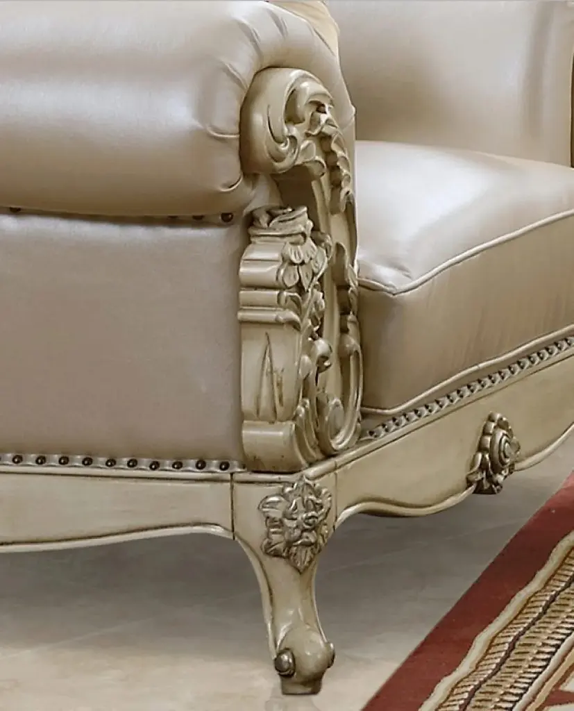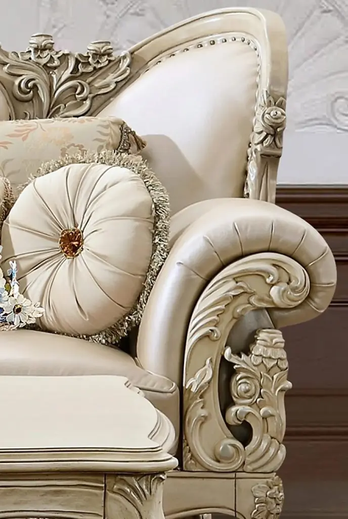 Achieve a grand and truly decadent look in your home with the stunning European designs of this traditional collection. This collection offers a variety of exquisite features such as curled wooden arms, Bi-Cast Leather on Beefy Rolled Arms 100% Kiln dried, Solid wood frame for maximum strength 100% Hand Carved Decorative Solid Wood Frame. Leather accented fringed cushions. Detailed carving on the arms and base. Combination of bi-cast leather and accented fabric, comfortable and stylish look. Comfortable cushions and fringed, reversible accent pillows. With the available sofa, love seat and chair, you can create the seating combination that best fits your interior needs. Every detail on these pieces exudes elegance and sophistication. Ornate and unique accent pillows complete this collection along with the soft, comfortable seat cushions which add color and texture to the composition. The subtle curves and exquisite details of this stunning collection are sure to enrich your home with elegant style and design. Features: Finish: Plantation Cove White Upholstered Material: Leather Frame Material: Solid Wood Construction Decorative fringed pillows 100% Kiln dried, Solid wood frame 100% Hand Carved Decorative Solid Wood Frame & Trim Dimensions: Sofa: 90-1/2_*41-1/2_*46_