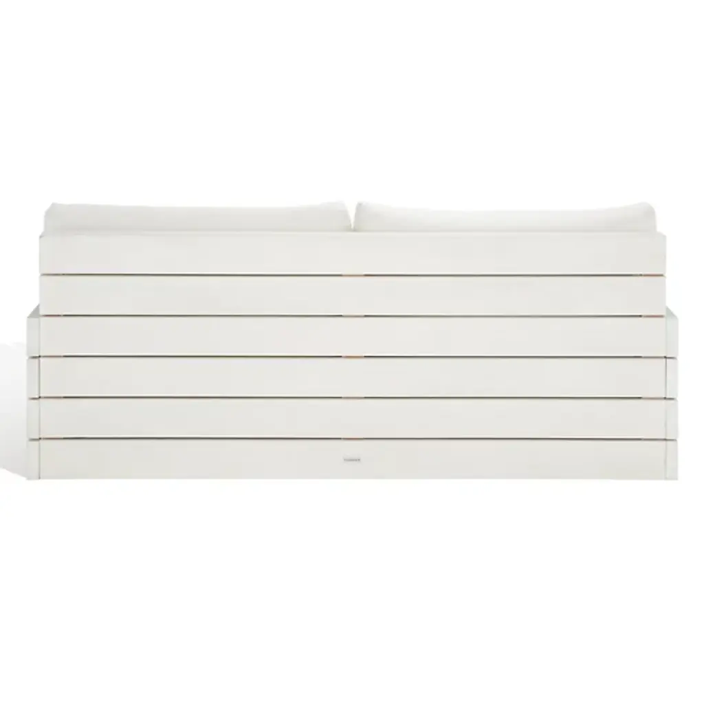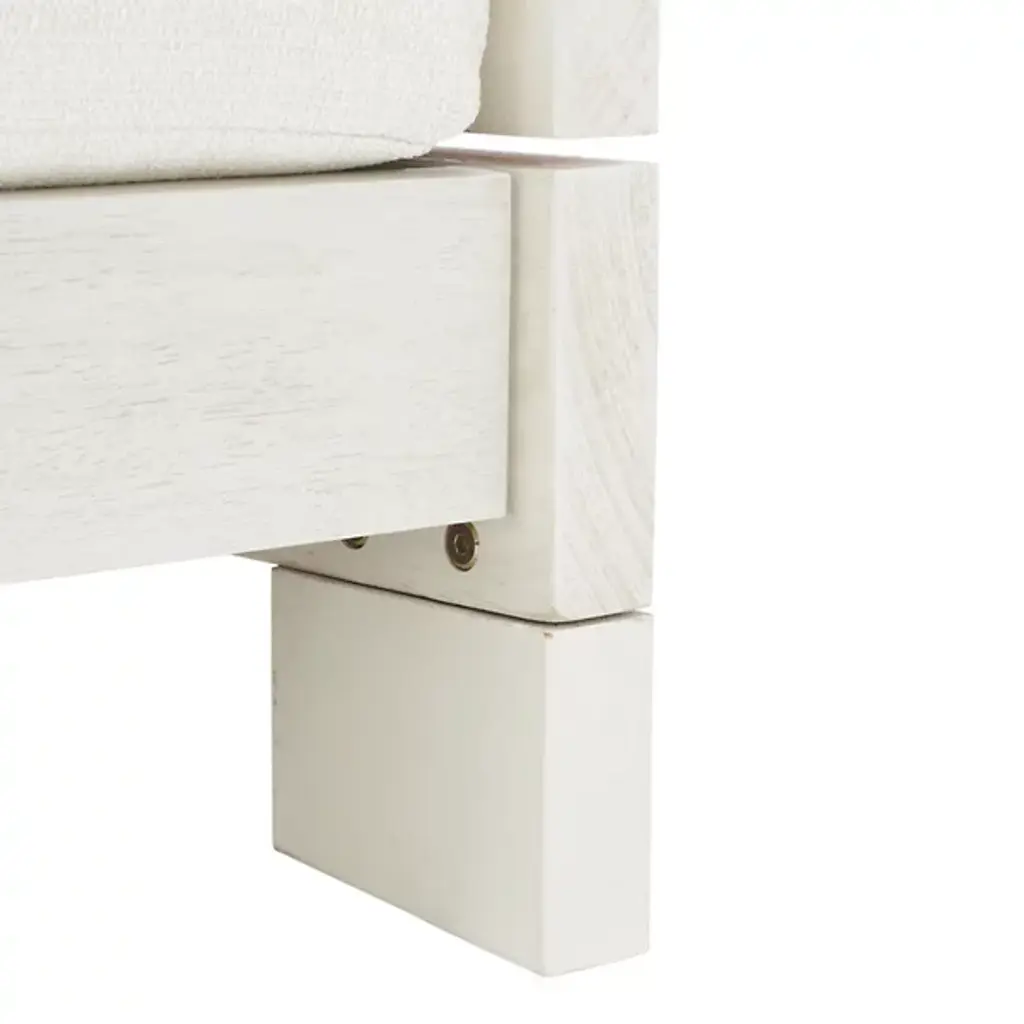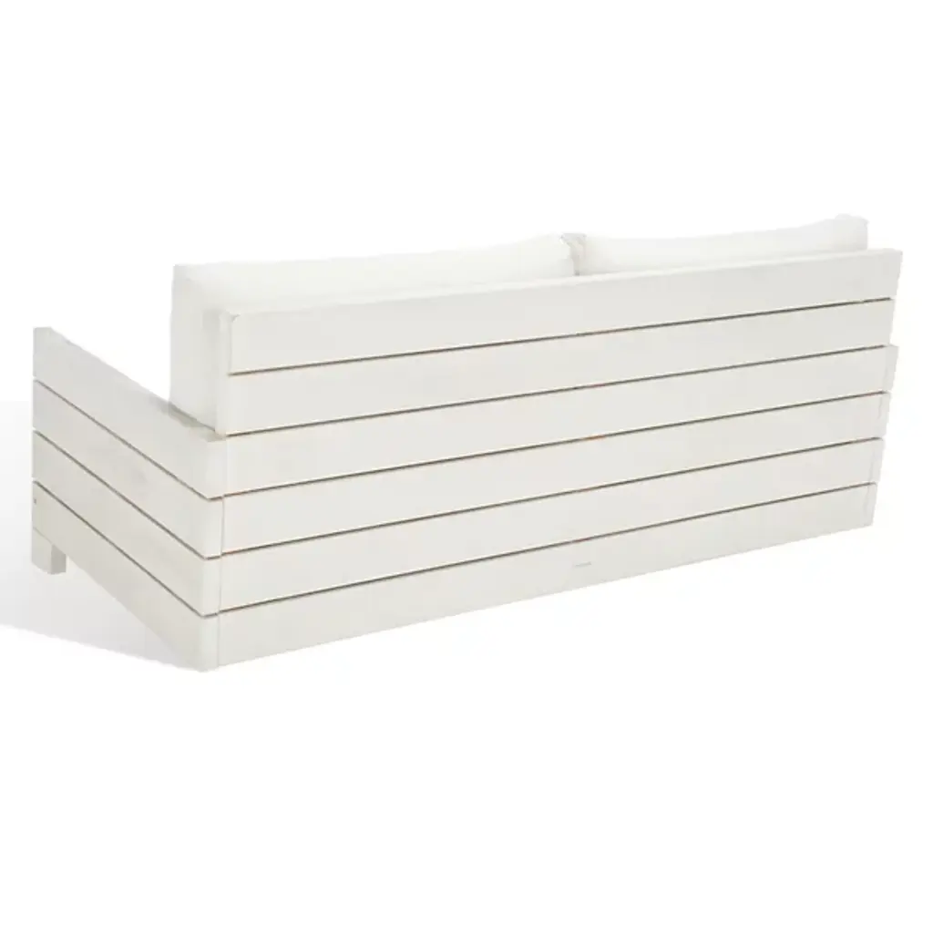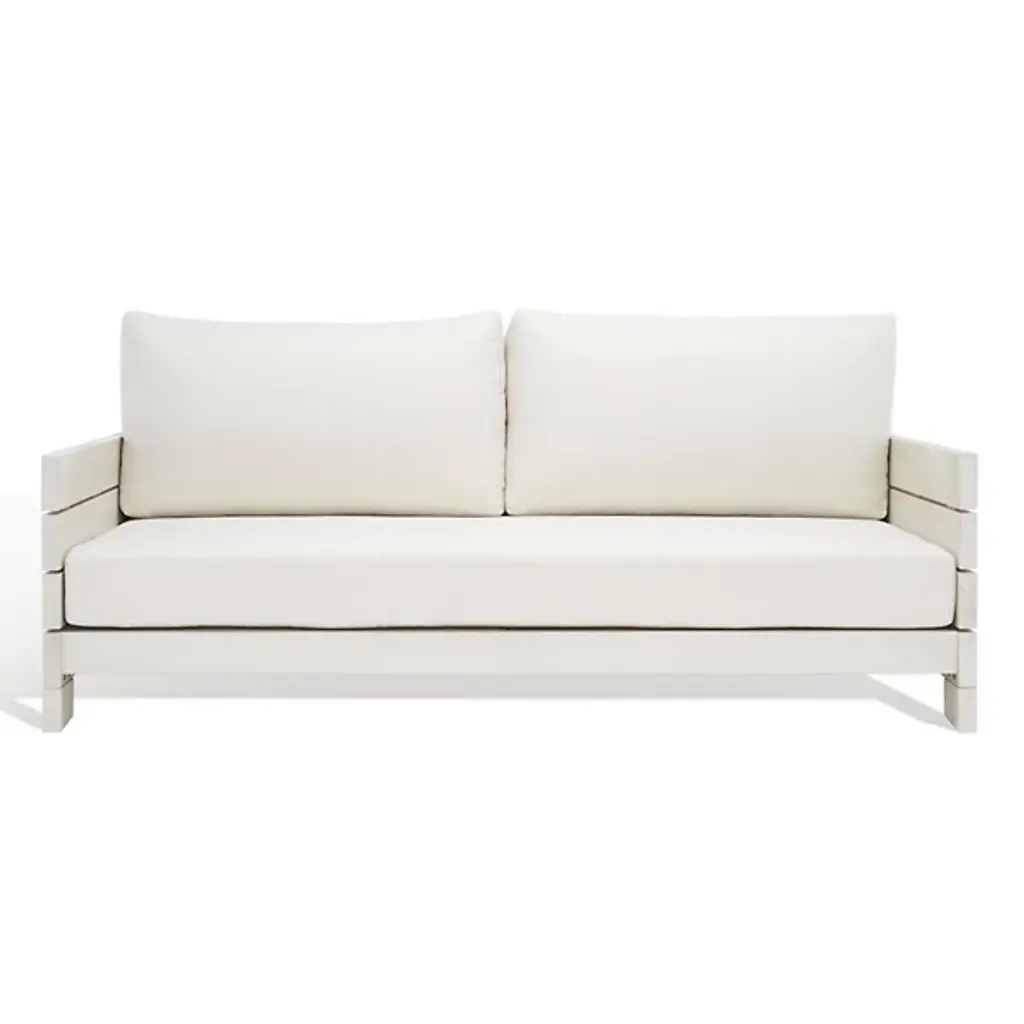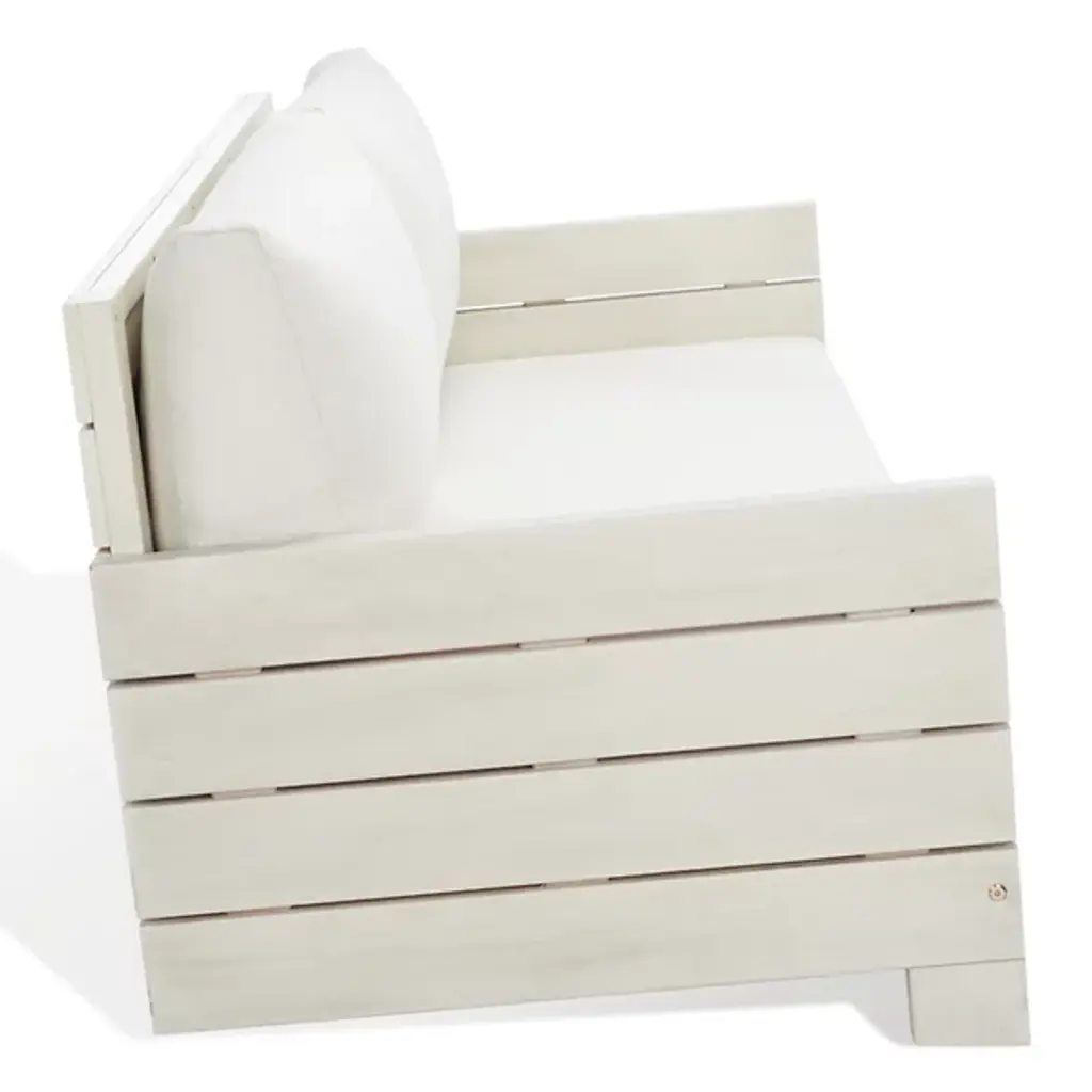 The Elmond Outdoor Sofa from Alder & Ore takes inspiration from coastal design with its distinctive whitewashed eucalyptus wood frame. Horizontal planks line the sides, creating a relaxed beach house aesthetic while its clean-lined construction brings a fresh perspective to outdoor seating. The polyester linen cushions also provide substantial comfort while resisting outdoor elements. These durable materials and quality craftsmanship ensure lasting outdoor enjoyment, while the light, airy design maintains a casual yet sophisticated presence in any setting.