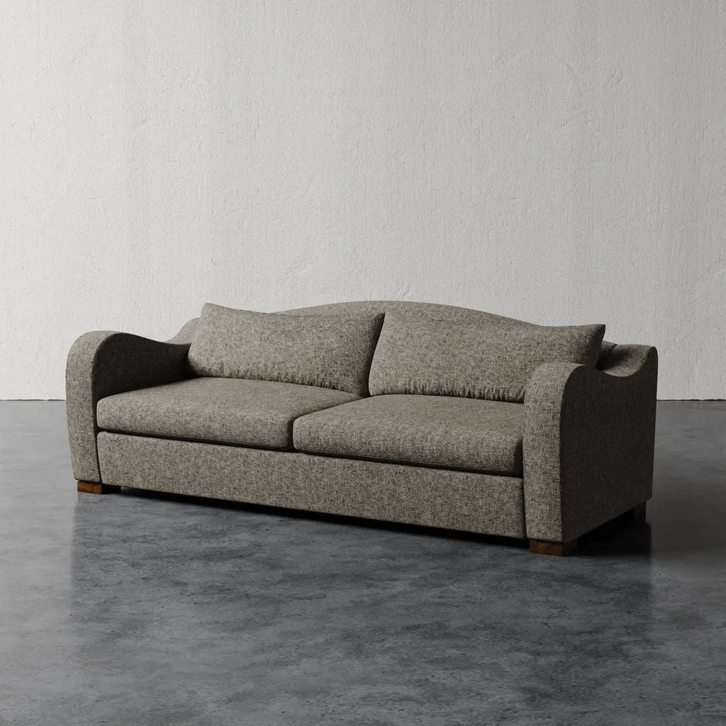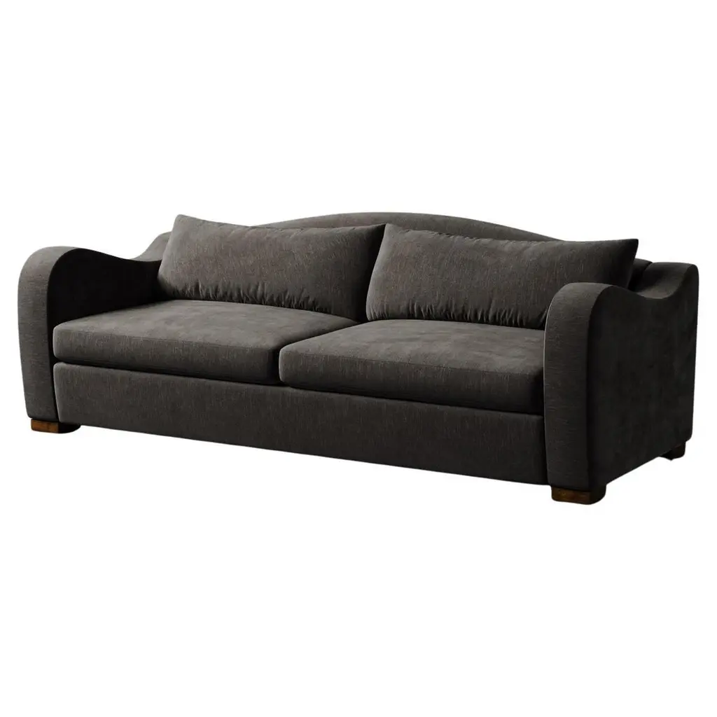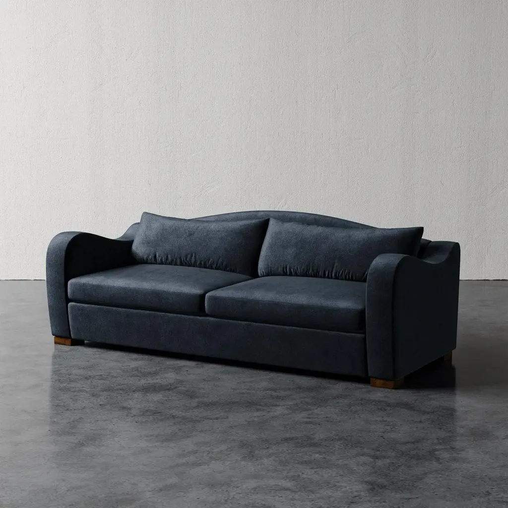 The Elodie Sofa draws inspiration from the elegant curves of 1930s French design, channeling the works of Jean Royère, Pierre Chareau and Marc du Plantier. With its deep seat, soft back cushion, and swooping arms, it balances luxury and modernity, evoking the voluptuous silhouettes Royère favored. The sofa's sculptural form and refined proportions reflect Art Deco influences, known for combining drama with elegance, while focusing on functional artistry. This blend of historical sophistication and contemporary comfort makes the Elodie Sofa a timeless addition to any interior.The Elodie sofa is handmade by skilled artisans in North Carolina. We can do COM upon request.This listing is for the sofa upholstered in any of our plush velvet fabrics. There are 4 color options, a "Strie' Bisque", a "Strie' Mink", a plush smooth Indigo, and a plush smooth Graphite. Please contact us if you are interested in other fabric options. We also have it available in many velvet colors and boucles in a separate listing.