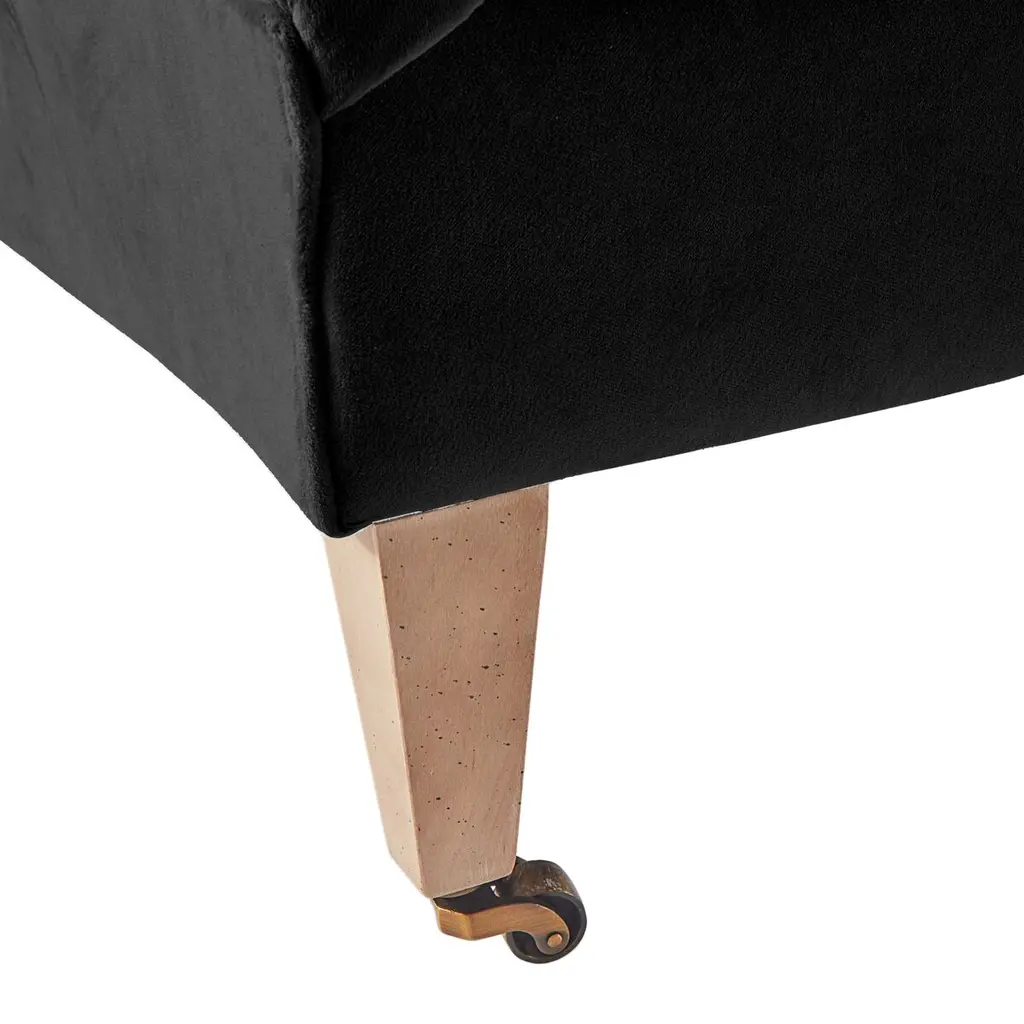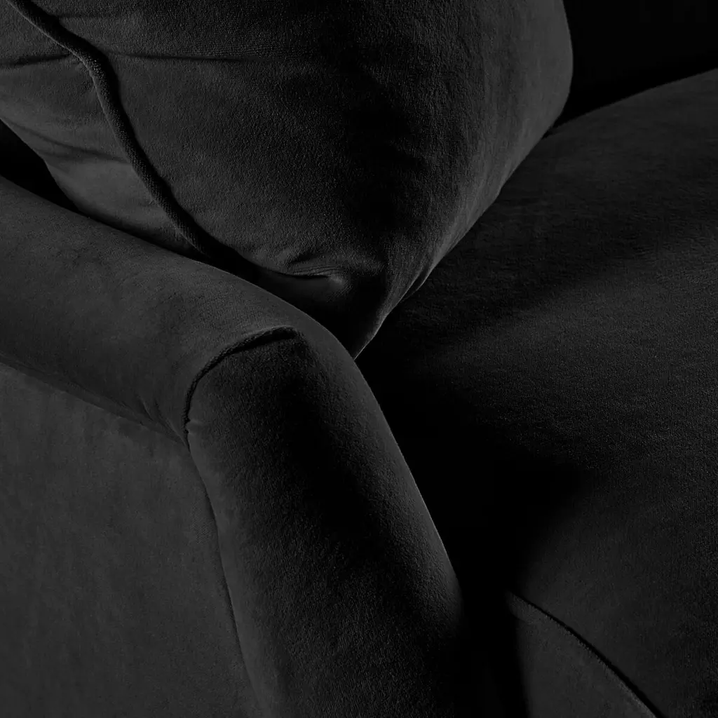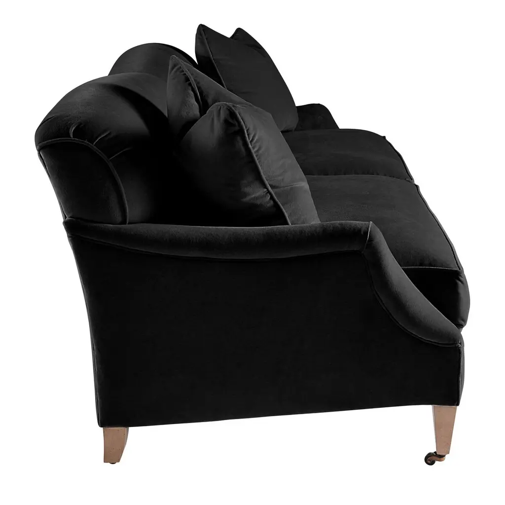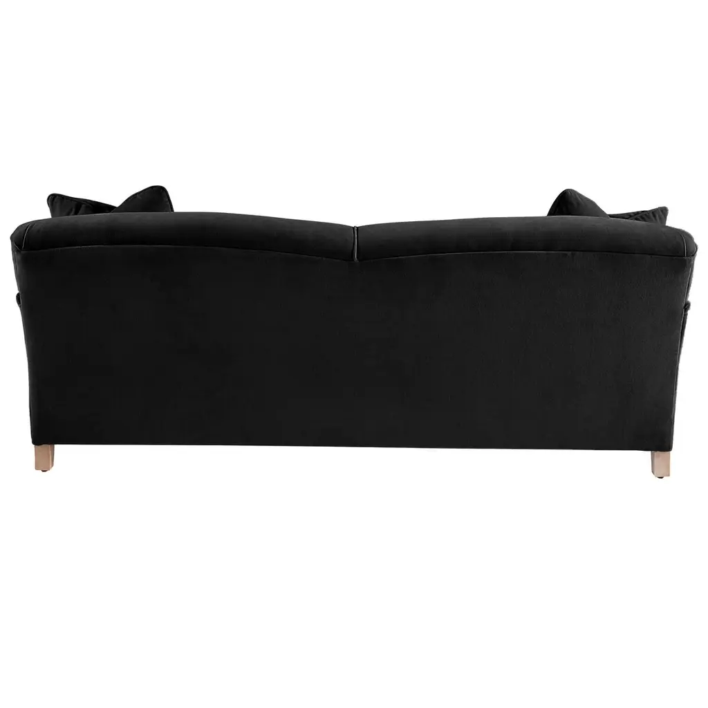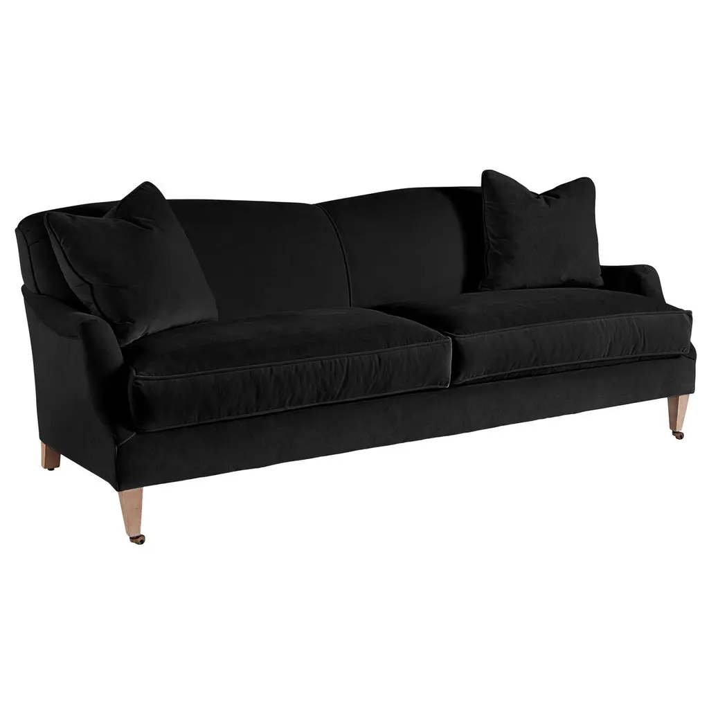 Timeless elegance meets everyday comfort in the Elodie Velvet Curved-Back Sofa. Crafted with a kiln-dried hardwood frame for lasting durability, this piece features subtly rolled arms and a gently curved back that softens its silhouette. Upholstered in a rich cotton-blend velvet, it offers a luxurious hand-feel, while feather-and-down fill cushions invite you to sink in and stay awhile. Brass casters on the tapered front legs add a hint of vintage charm and effortless mobility, perfect for a space that blends tradition with a modern sensibility. Matching throw pillows are included.