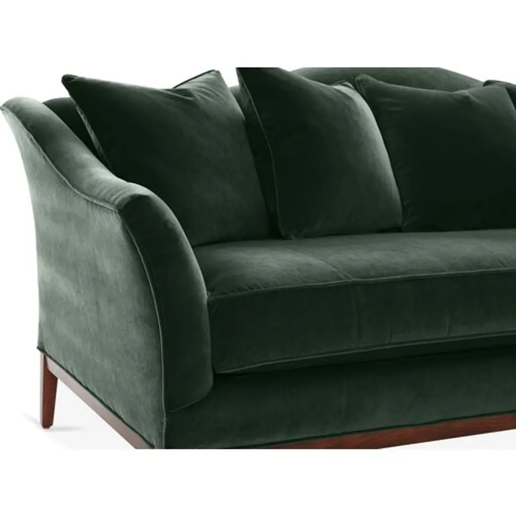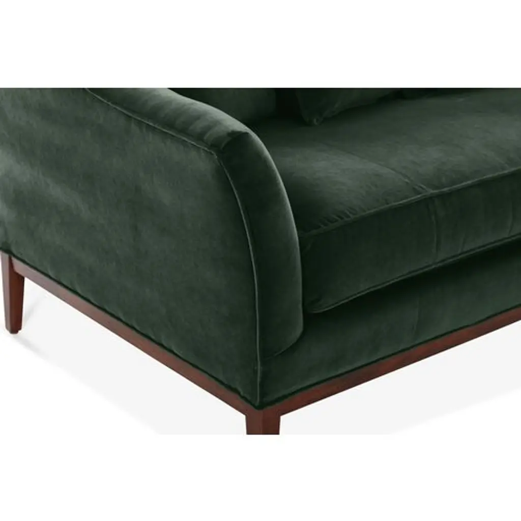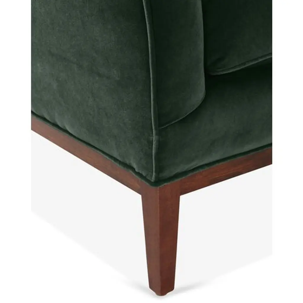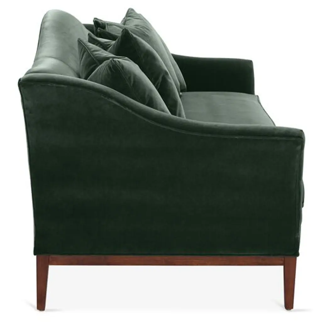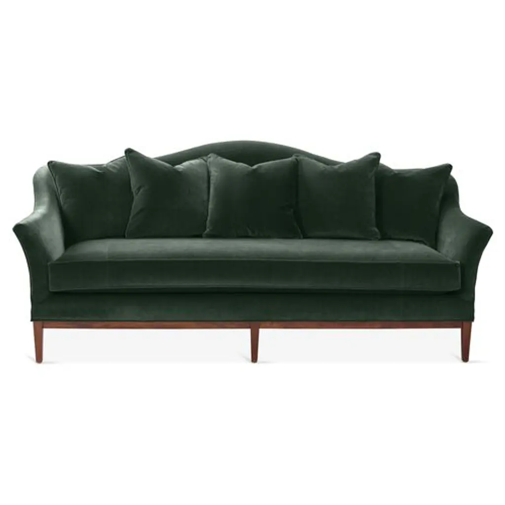 Designed by us and available only at One Kings Lane: A camelback silhouette, exposed wood base, and plush forest-green velvet upholstery give this classic design a fresh, modern look. A long bench cushion with generous padding ensures long-lasting comfort. Made in the USA.