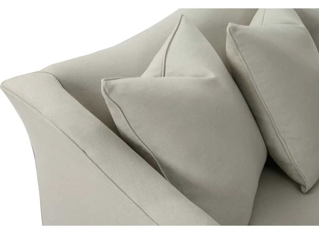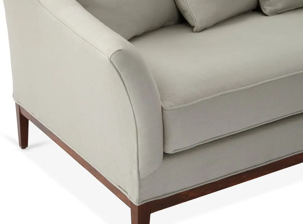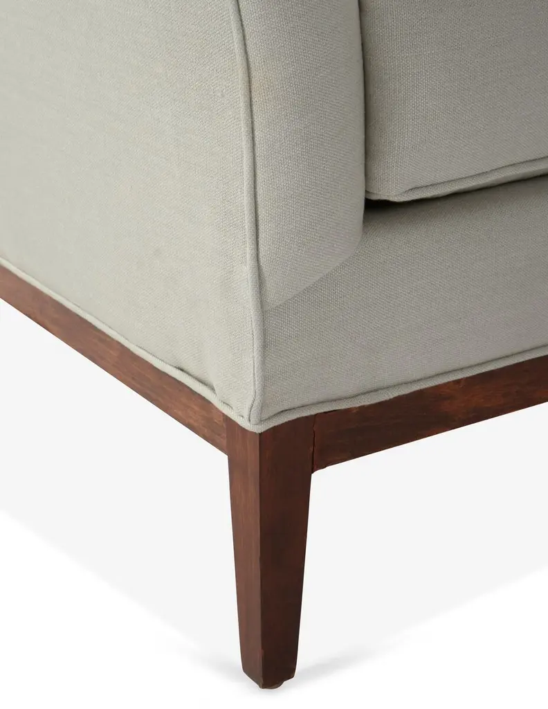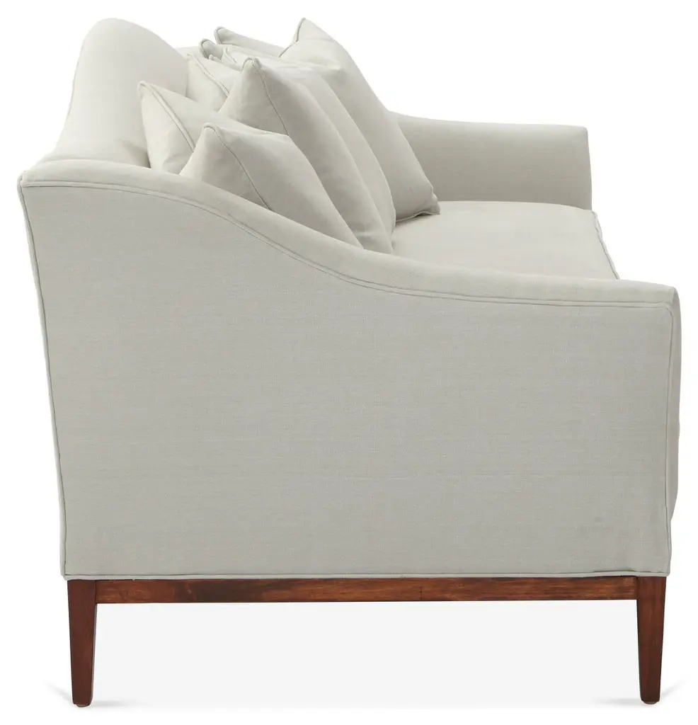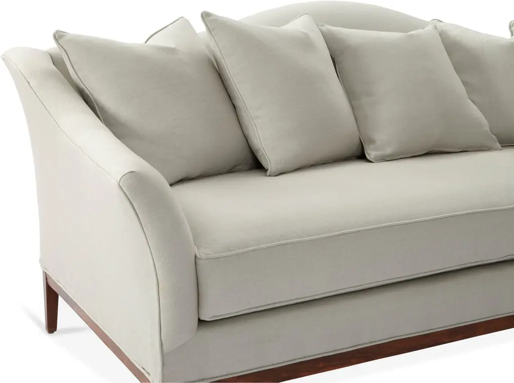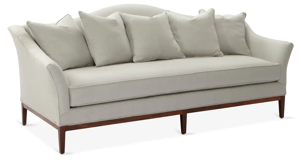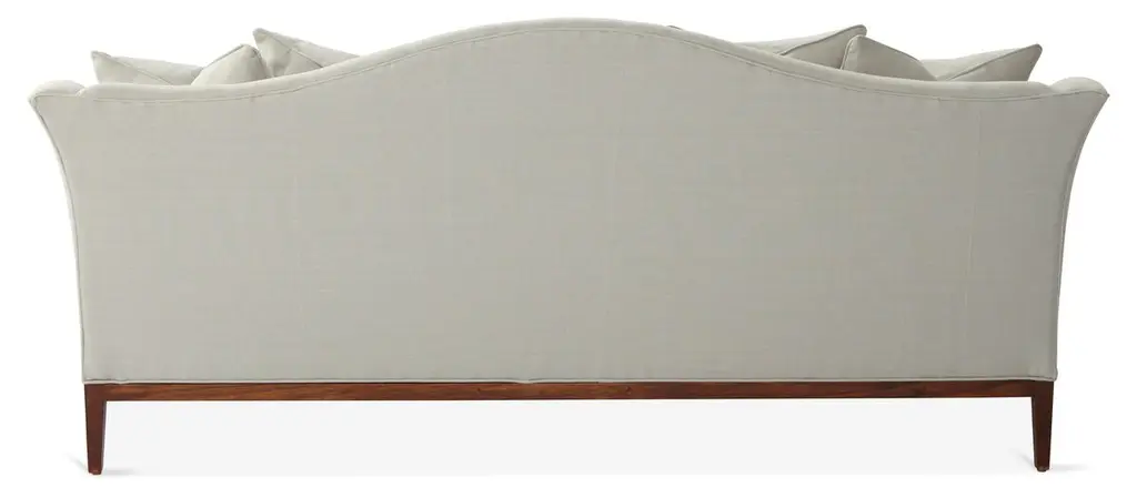 Designed by us and available only at One Kings Lane: A camelback silhouette, exposed wood base, and soft linen upholstery give this classic design a fresh, modern look. A long bench cushion with generous padding ensures long-lasting comfort. Made in the USA.