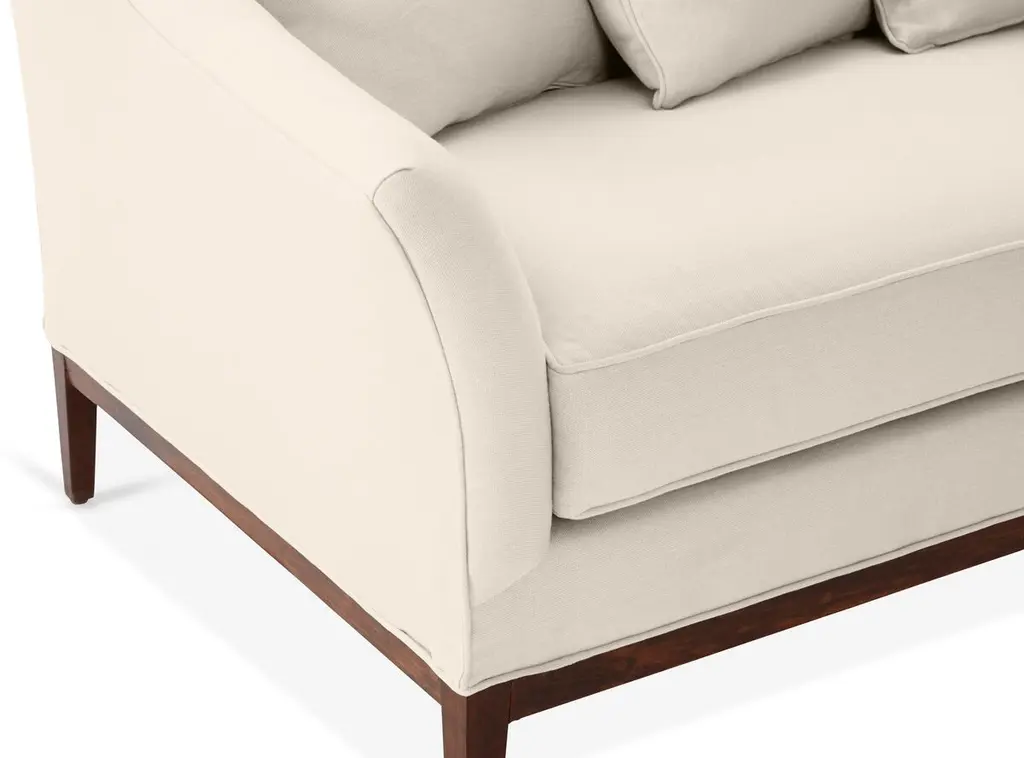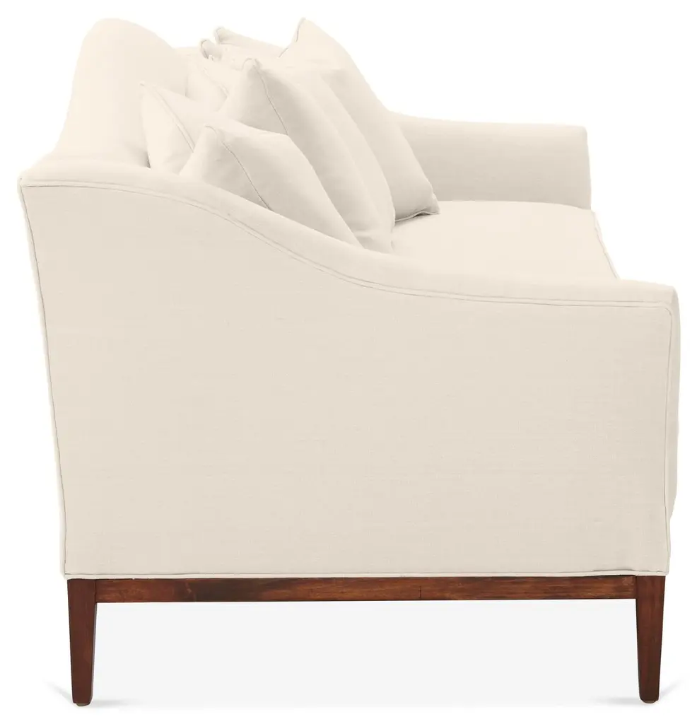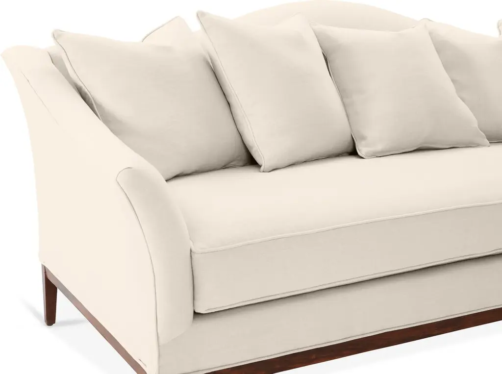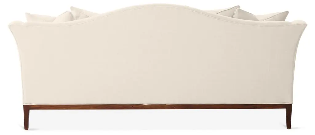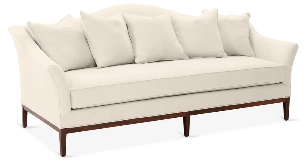 Designed by us and available only at One Kings Lane: A camelback silhouette, exposed wood base, and soft linen upholstery give this classic design a fresh, modern look. A long bench cushion with generous padding ensures long-lasting comfort. Made in the USA.