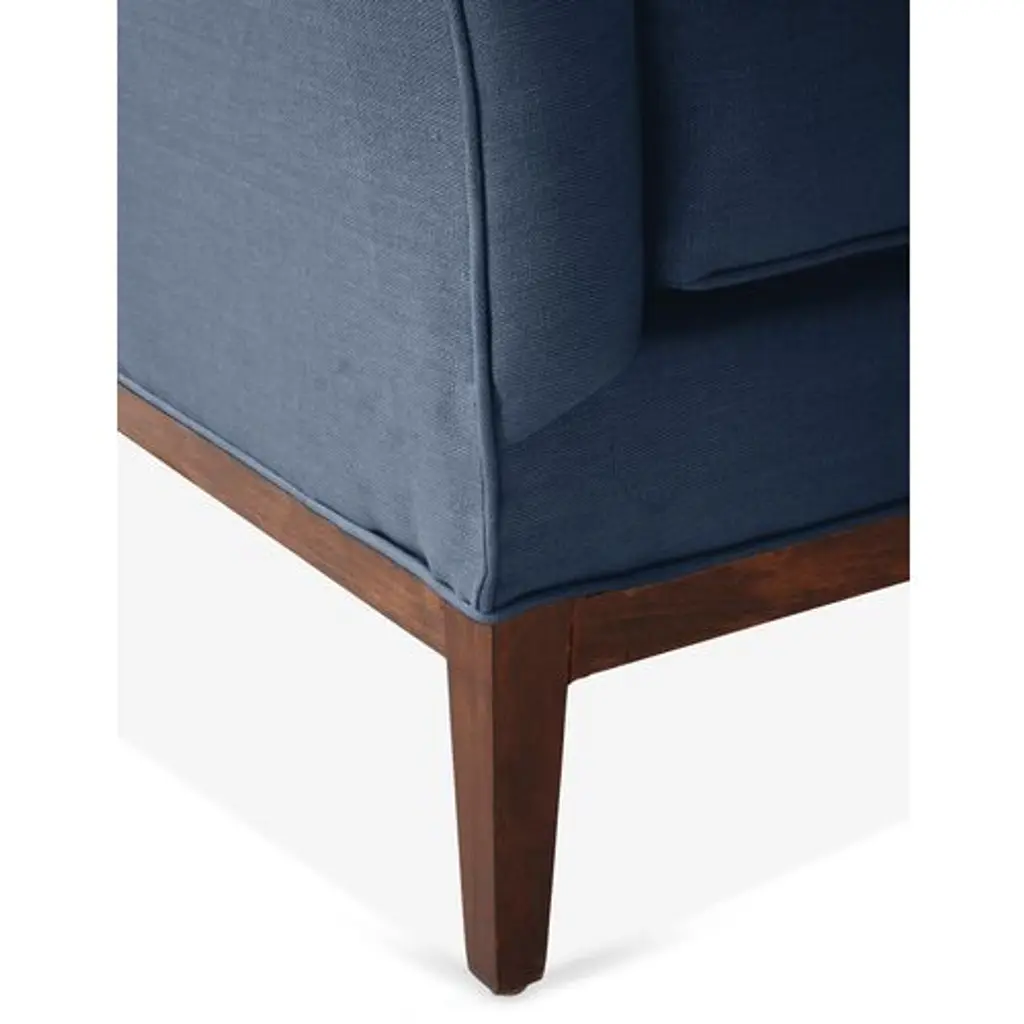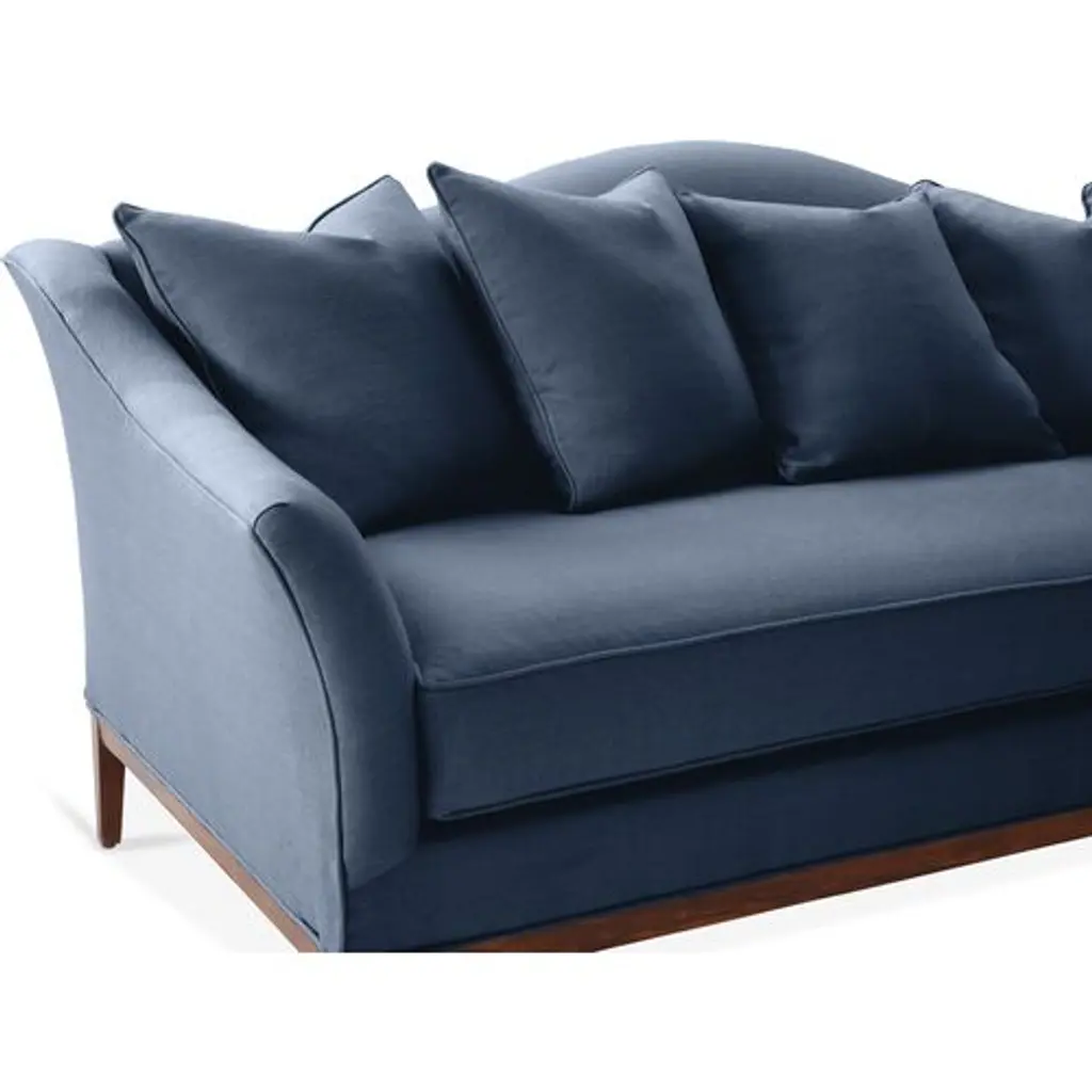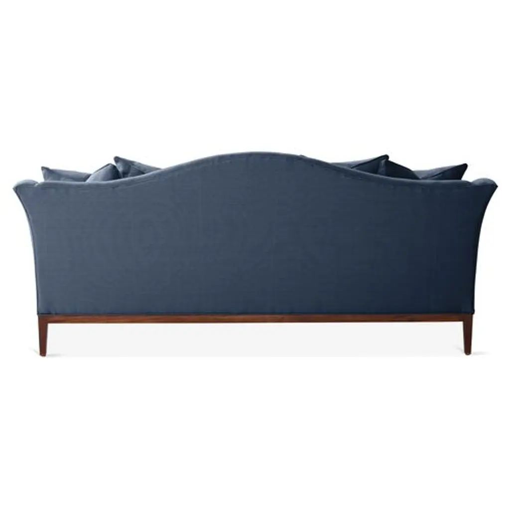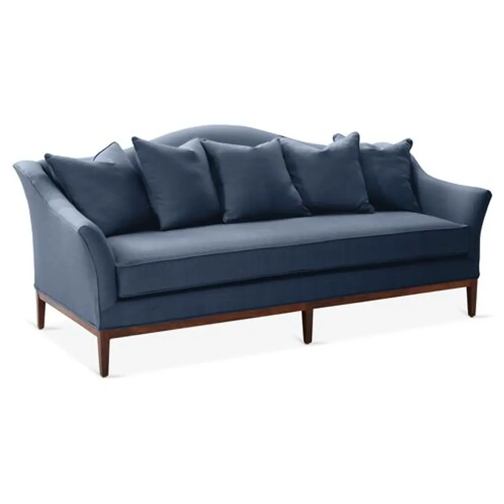 Designed by us and available only at One Kings Lane: A camelback silhouette, exposed wood base, and navy linen upholstery give this classic design a fresh, modern look. A long bench cushion with generous padding ensures long-lasting comfort. Made in the USA.