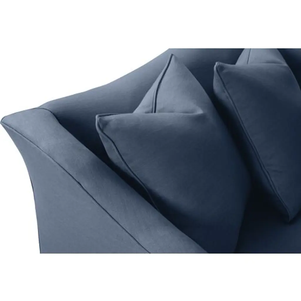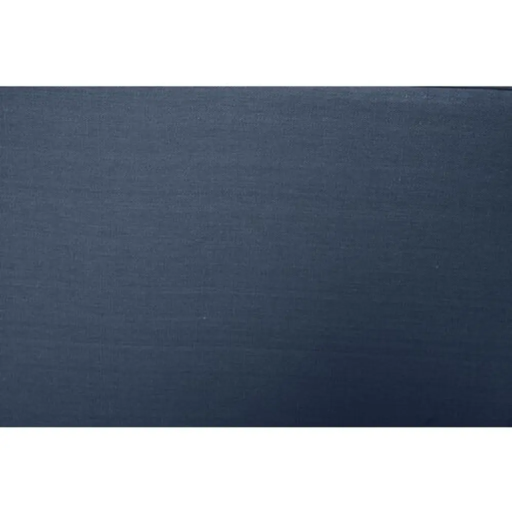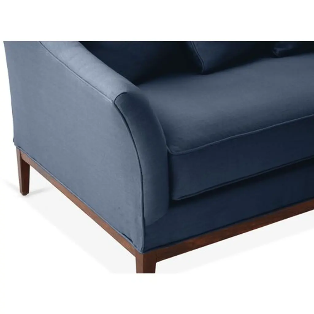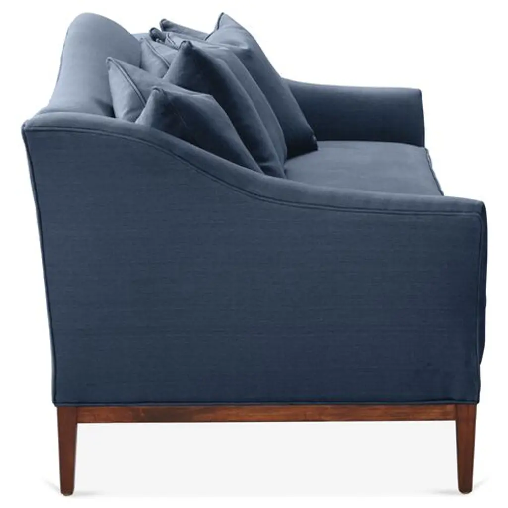 Designed by us and available only at One Kings Lane: A camelback silhouette, exposed wood base, and navy linen upholstery give this classic design a fresh, modern look. A long bench cushion with generous padding ensures long-lasting comfort. Made in the USA.