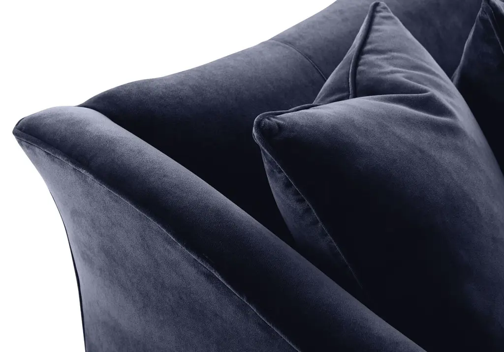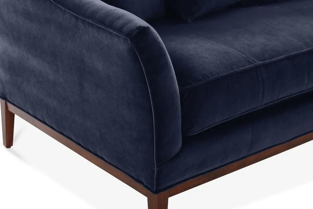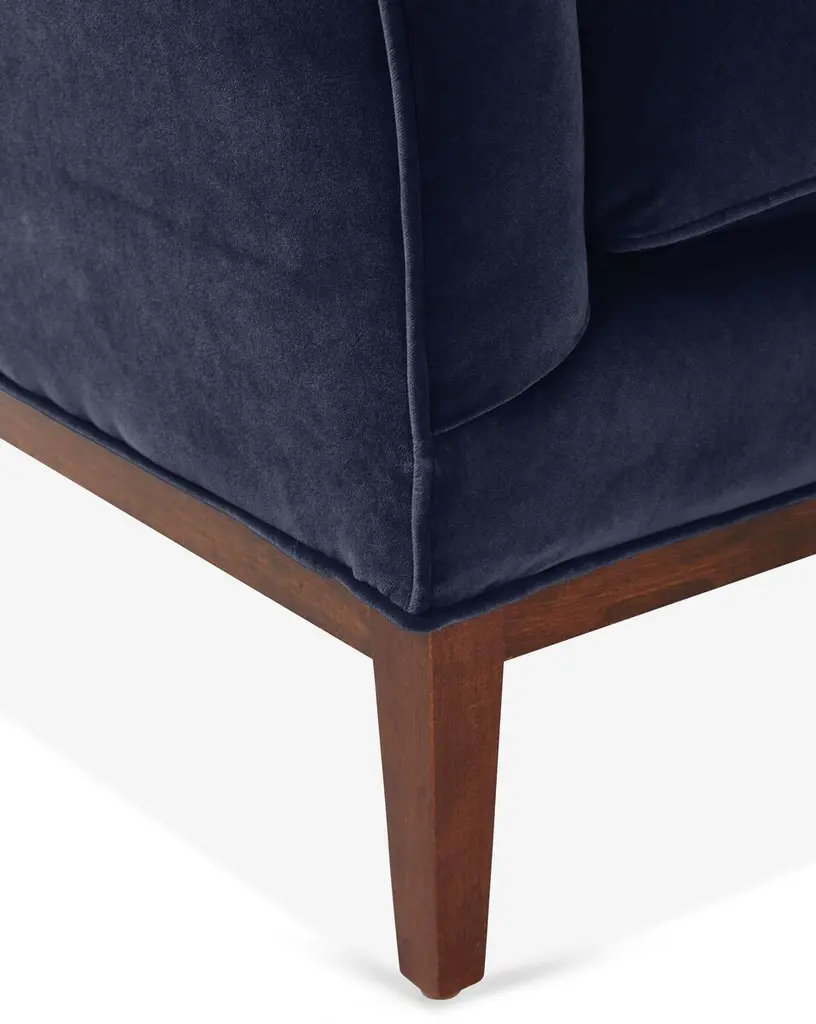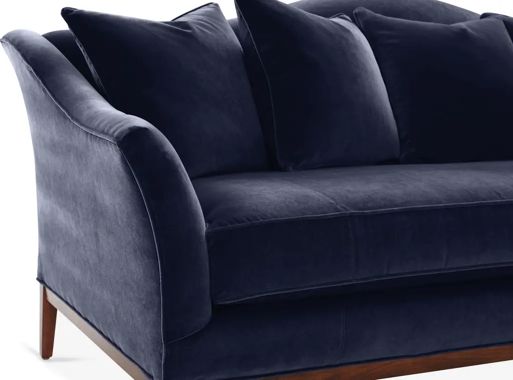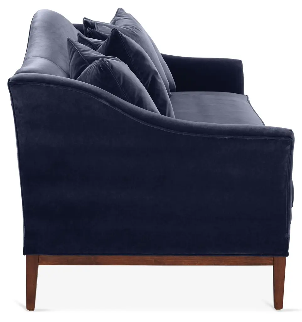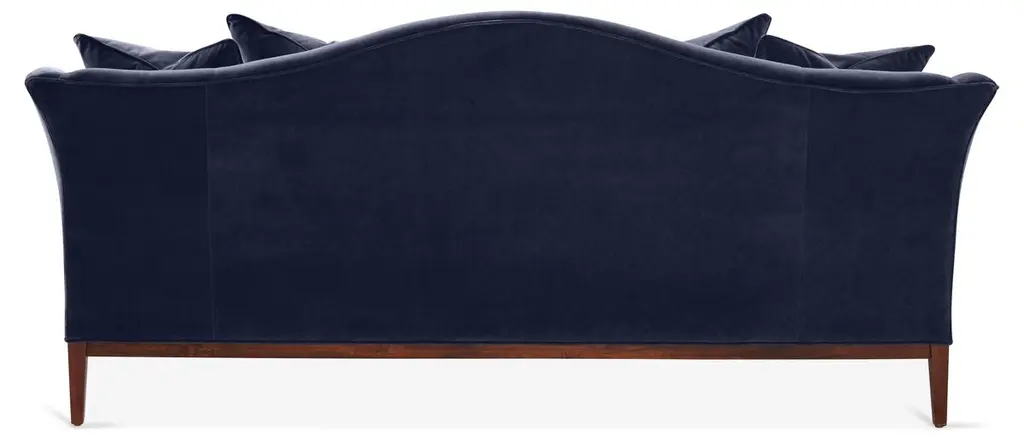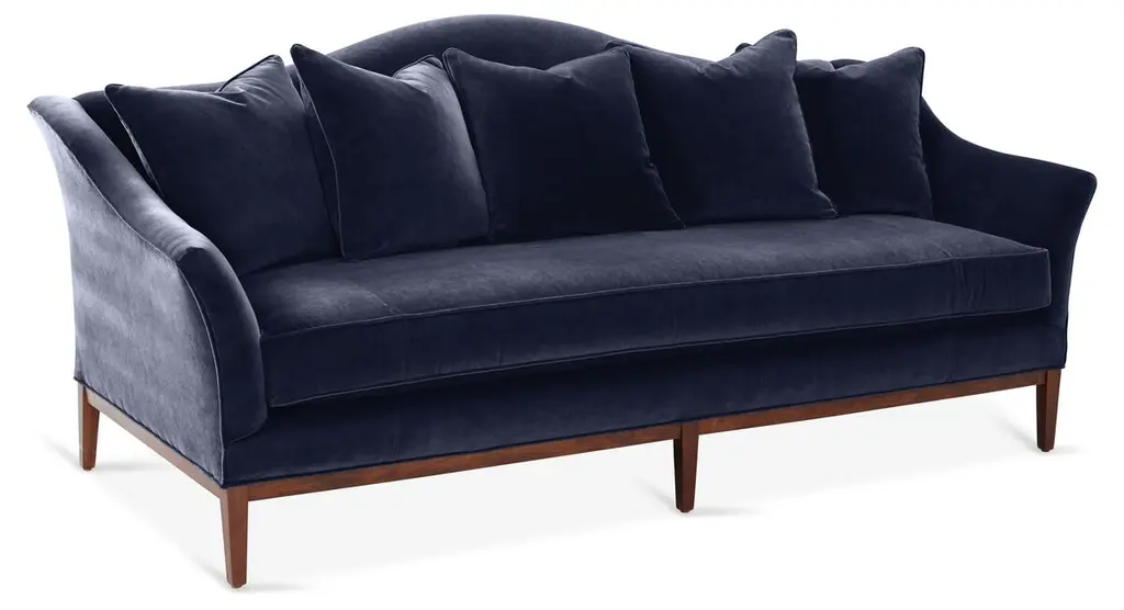 Designed by us and available only at One Kings Lane: A camelback silhouette, exposed wood base, and plush velvet upholstery give this classic design a fresh, modern look. A long bench cushion with generous padding ensures long-lasting comfort. Made in the USA.