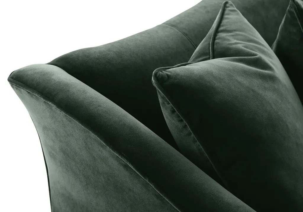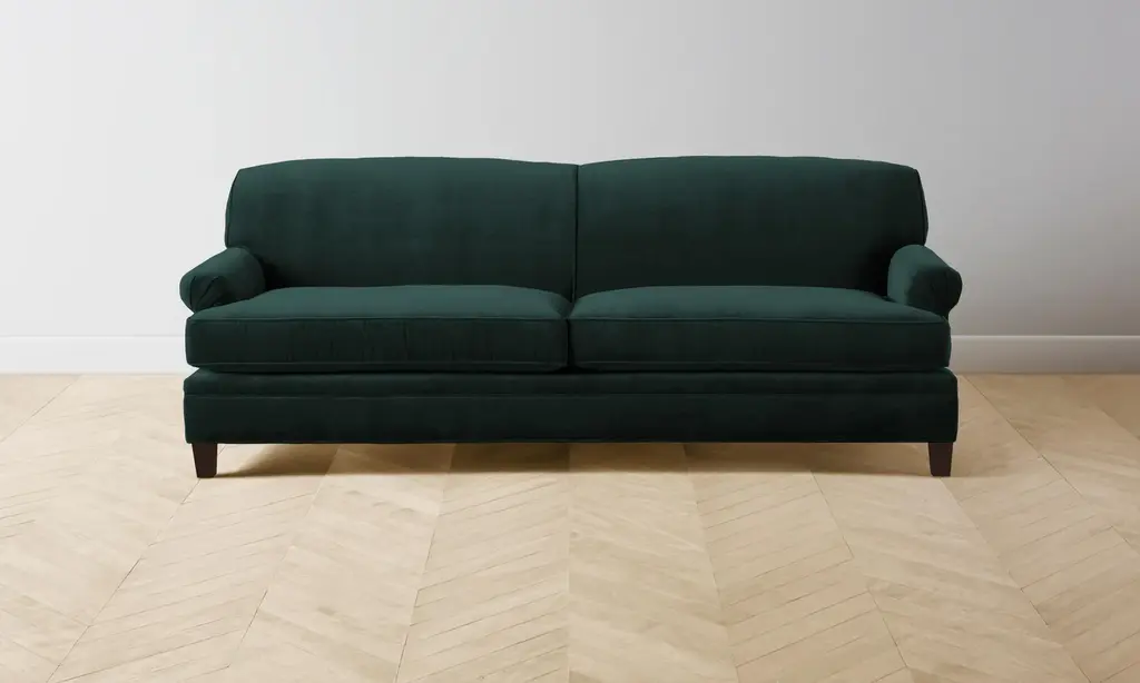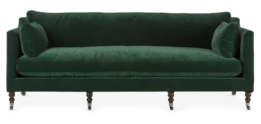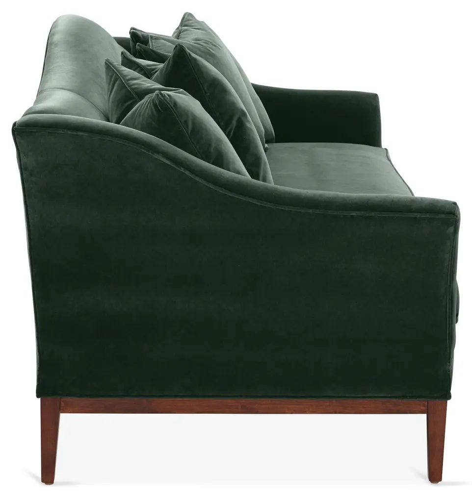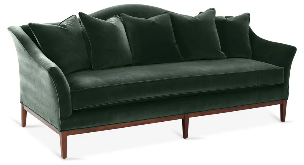 Designed by us and available only at One Kings Lane: A camelback silhouette, exposed wood base, and plush velvet upholstery give this classic design a fresh, modern look. A long bench cushion with generous padding ensures long-lasting comfort. Made in the USA.