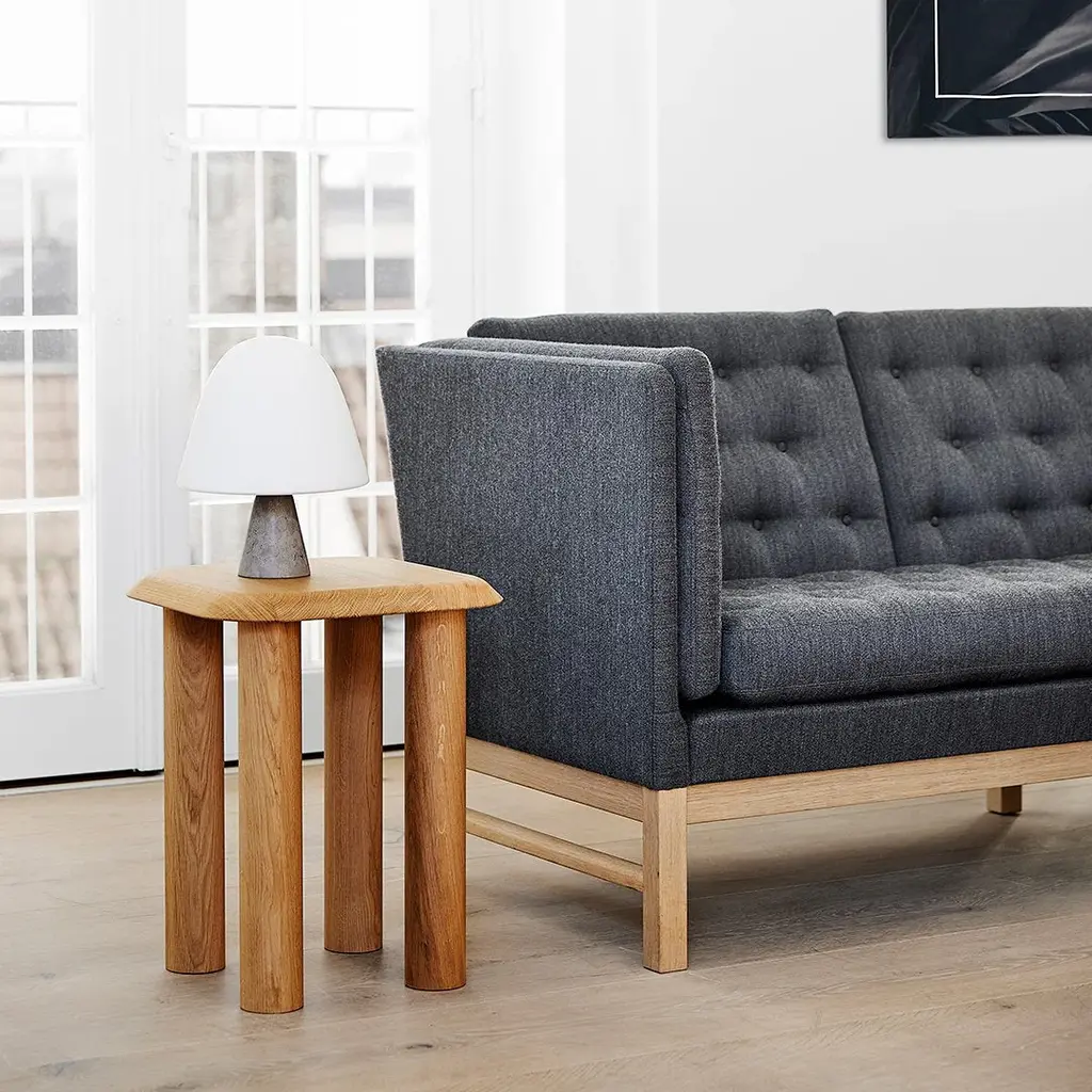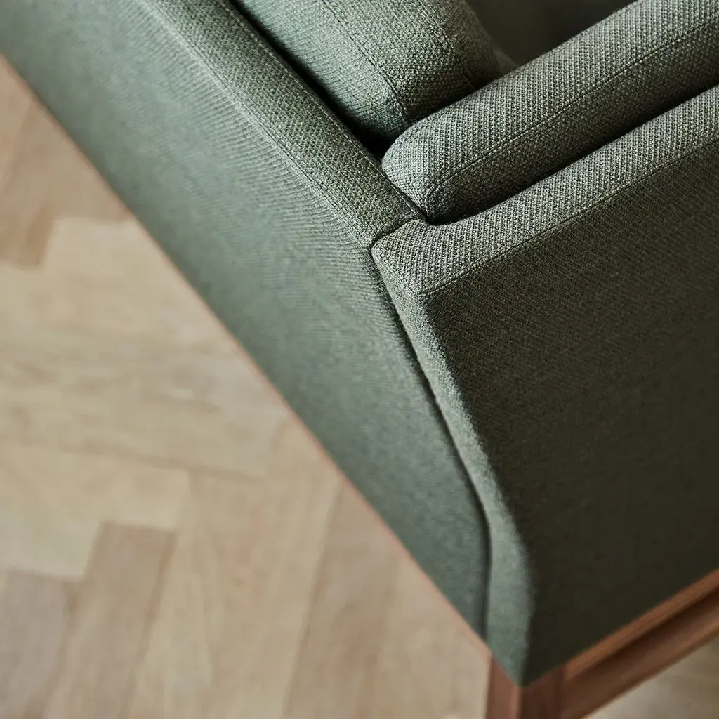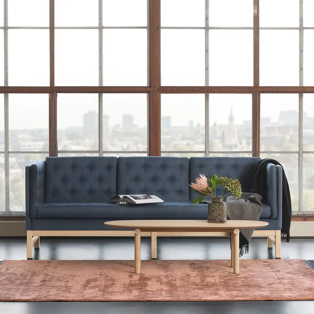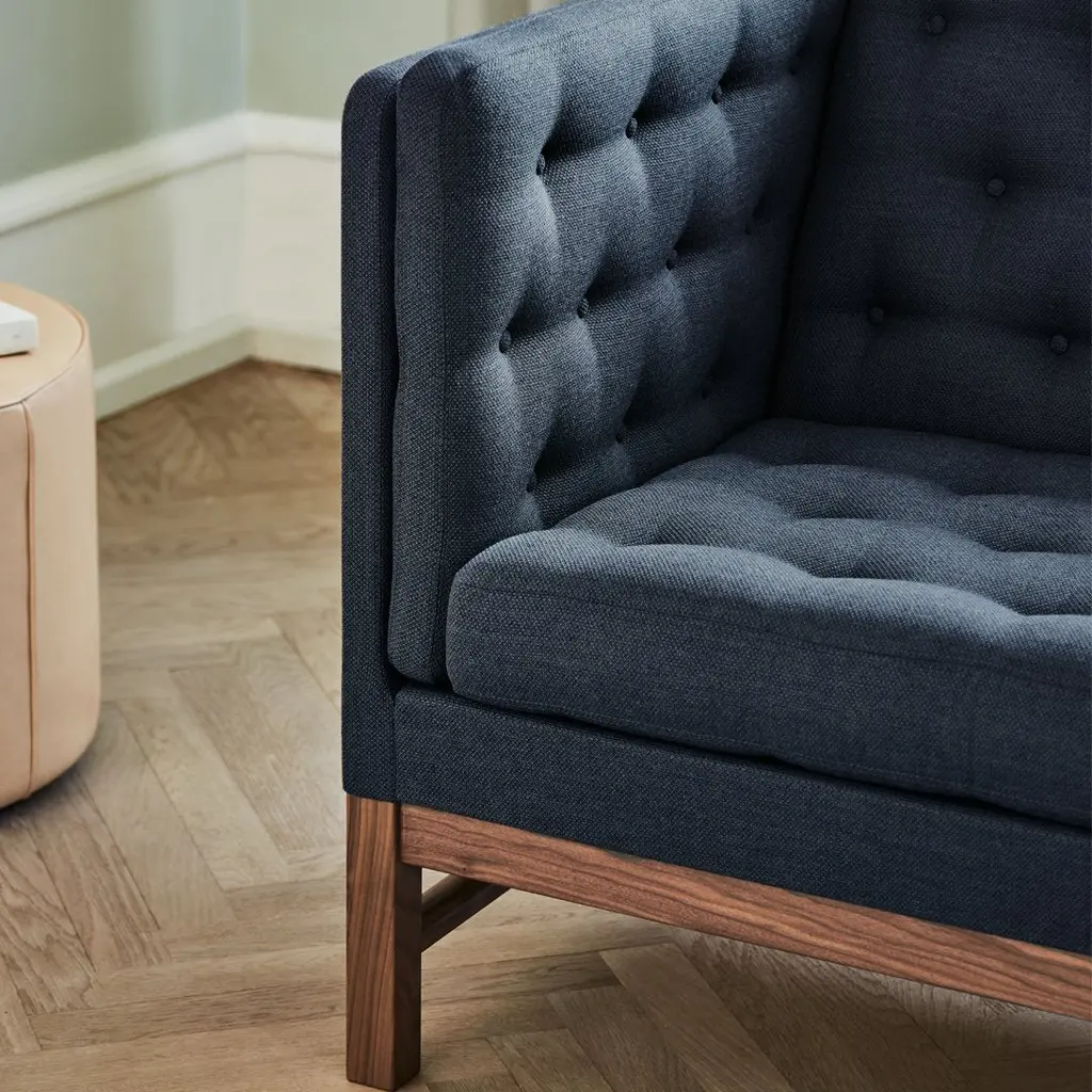 The Danish designer Erik Ole Jorgensen's style is simplicity combined with a great understanding for the tactile qualities of textiles and furniture. With its high level of craftsmanship and attention to detail, the EJ 315 sofa and chair presents Danish design at its best. The upholstery has been carried out with beautiful precision and the back of the sofa is adorned with no less than 180 hand-sewn buttons. Designed in 1975, the EJ 315 still stands as the archetype of a Danish box sofa. The sofa can be designed uniquely with buttons in a contrast colour, in either textile or leather, as well as the legs being available in various types of wood and processing.