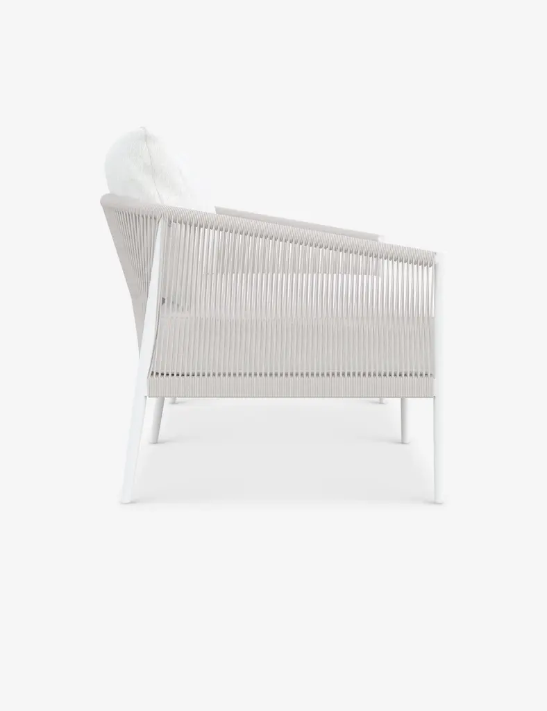 The Esparza sofa brings refined design to a livable indoor-outdoor style. The slim but sturdy aluminum frame is finished in matte white with a linear all-weather rope weave augmenting its clean, spare lines. With its plush performance cushions, this indoor/outdoor sofa offers comfort and elegance for three in your sunroom or patio.