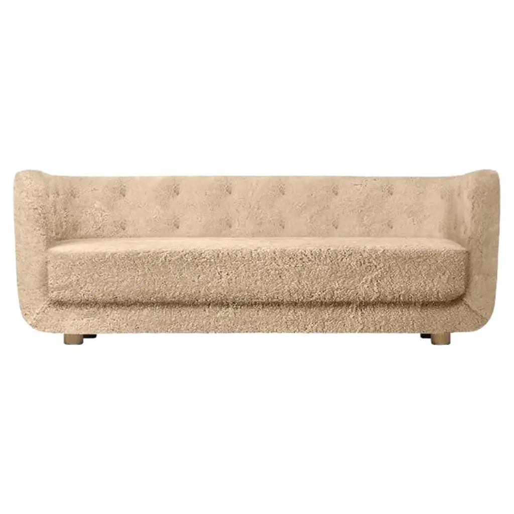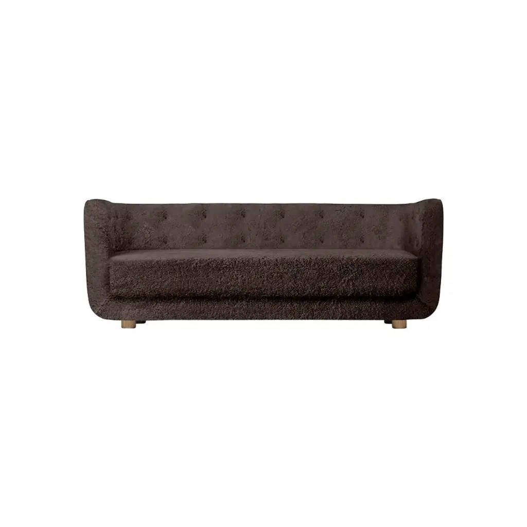 Espresso sheepskin and smoked oak Vilhelm sofa by LassenDimensions: W 217 x D 88 x H 80 cm Materials: sheepskin, oak.Vilhelm is a beautiful padded three-seater sofa designed by Flemming Lassen in 1935. A sofa must be able to function in several ways. It should invite calm and contemplation. Create a private space you can hide in and at the same time invite to life and play. It must be able to withstand sitting on the backrest or on the armrests and then it must be able to stand in the middle of the room if you want to.In addition to being aesthetically beautiful and harmonious, the design makes absolute sense in relation to these parameters.By Lassen is a Danish design brand focused on iconic designs created by Mogens and Flemming Lassen, founded by Lassens’ relatives in 2008. Brothers Mogens (1901-1987) and Flemming (1902-1984) Lassen are known as two of Denmark’s greatest architects and designers. Both were renowned pioneers of Danish functionalism and modernist architecture, honoured with numerous prestigious medals and awards. Headed by Mogens Lassen’s grandson Søren Lassen, By Lassen carries on the brothers’ design philosophy by manufacturing their iconic designs as well as products by other designers that complement the Lassen’s functionalist style. The company’s mission is to continue the tradition of timelessness, functionality and quality, and to introduce the Lassen’s design heritage to new generations.