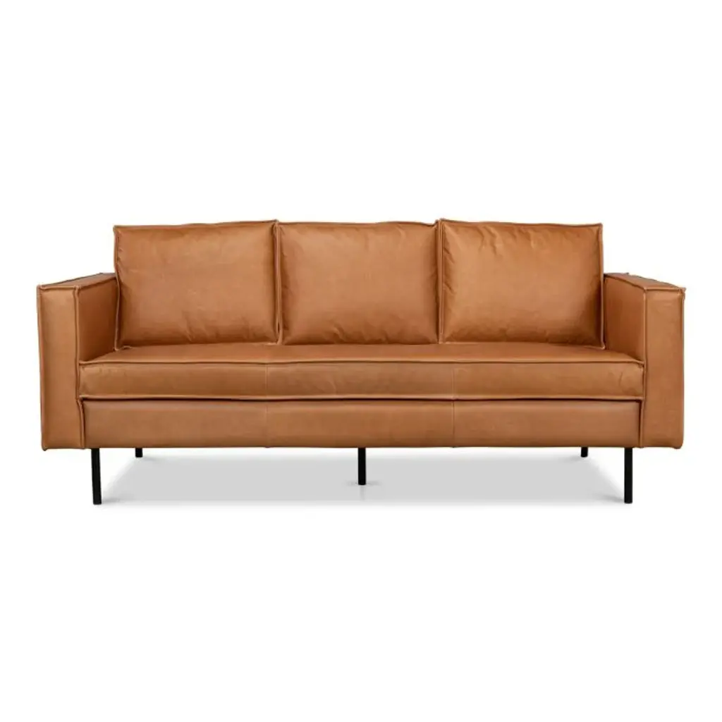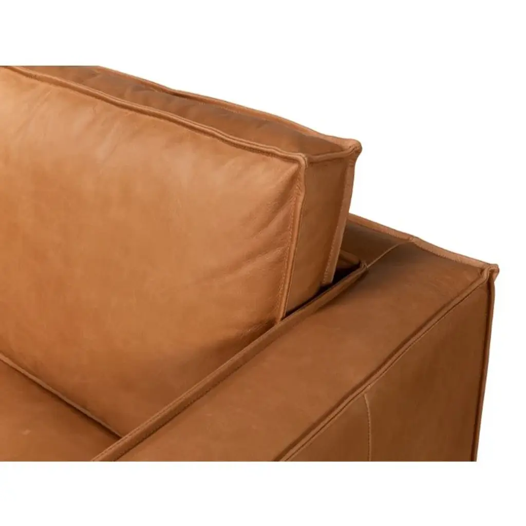 Totally tufted + totally hip! This awesome tan leather sofa, atop a whitewashed oak base, adds stylish comfort to any transitional space. Flanged seams and channel panels add the extra details that make this sofa special. Due to the organic nature of leather and hides there may be slight variances in color and pattern as well as scarring which is considered a unique attribute of the material and not a defect.