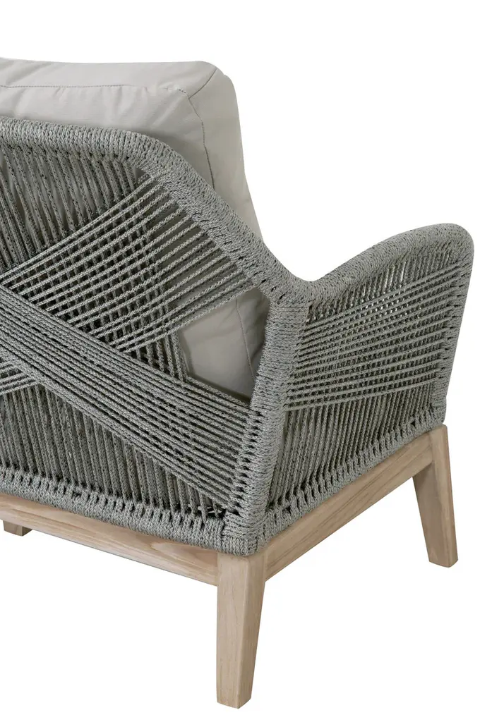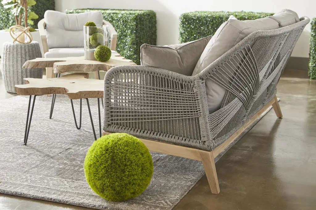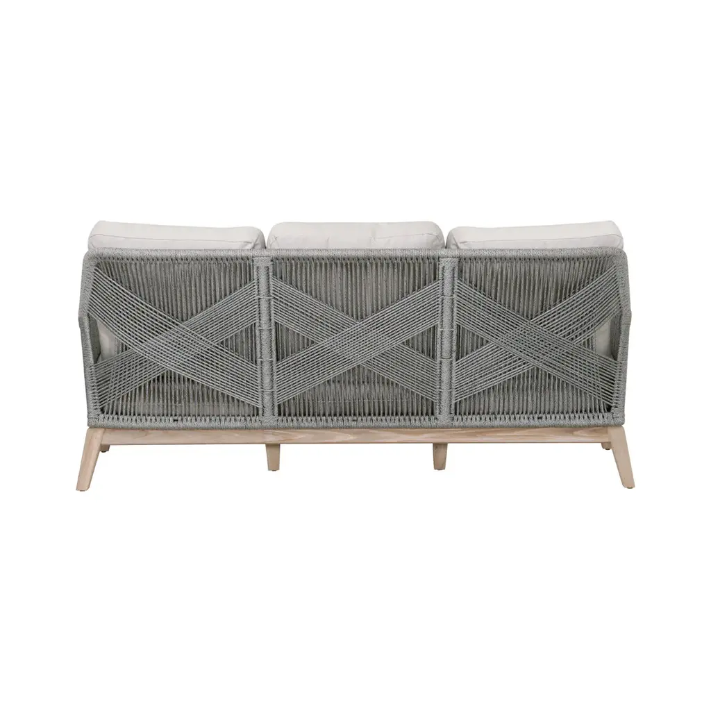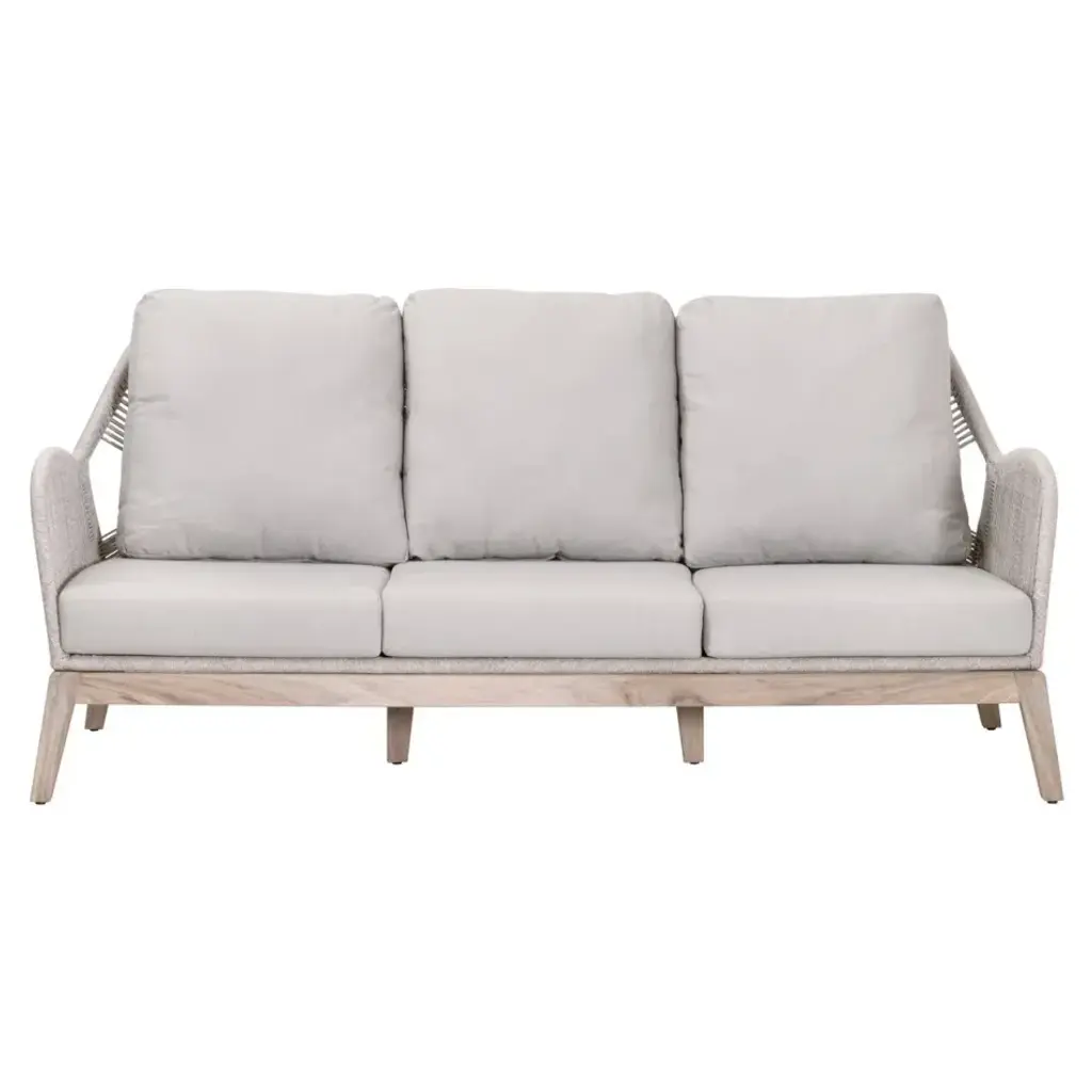 This woven outdoor sofa will add a touch of coastal style to your backyard or patio. Constructed with an aluminum frame and solid gray teak legs, this sofa is not only sturdy, but durable for outdoor use. A rich platinum colored rope is tightly woven to create a unique loom design, while the gray teak legs feature a beautiful wood grain finish. Paired with removable all-weather seat and back cushions, the sofa provides comfort with style and will be the perfect addition to any outdoor lounging area. FEATURES & BENEFITS Overall Dimensions: W:79" D:37" H:34" Weight: 81lbs Reinforced Dual Aluminum Frame System Offers Added Strength Removable Upholstered Cushions in All-Weather Fabric Intricate Rope Weave Design Aluminum Frame Solid Teak Legs MORE DETAILS Materials: Solid Teak Wood, Aluminum, Polypropylene Rope, 100% Olefin Fabric, Foam Seat Height: 17" Seat Width: 73.2" Seat Depth: 25" Arm Height: 26" Leg Height: 10" Free white glove shipping & delivery in the U.S.