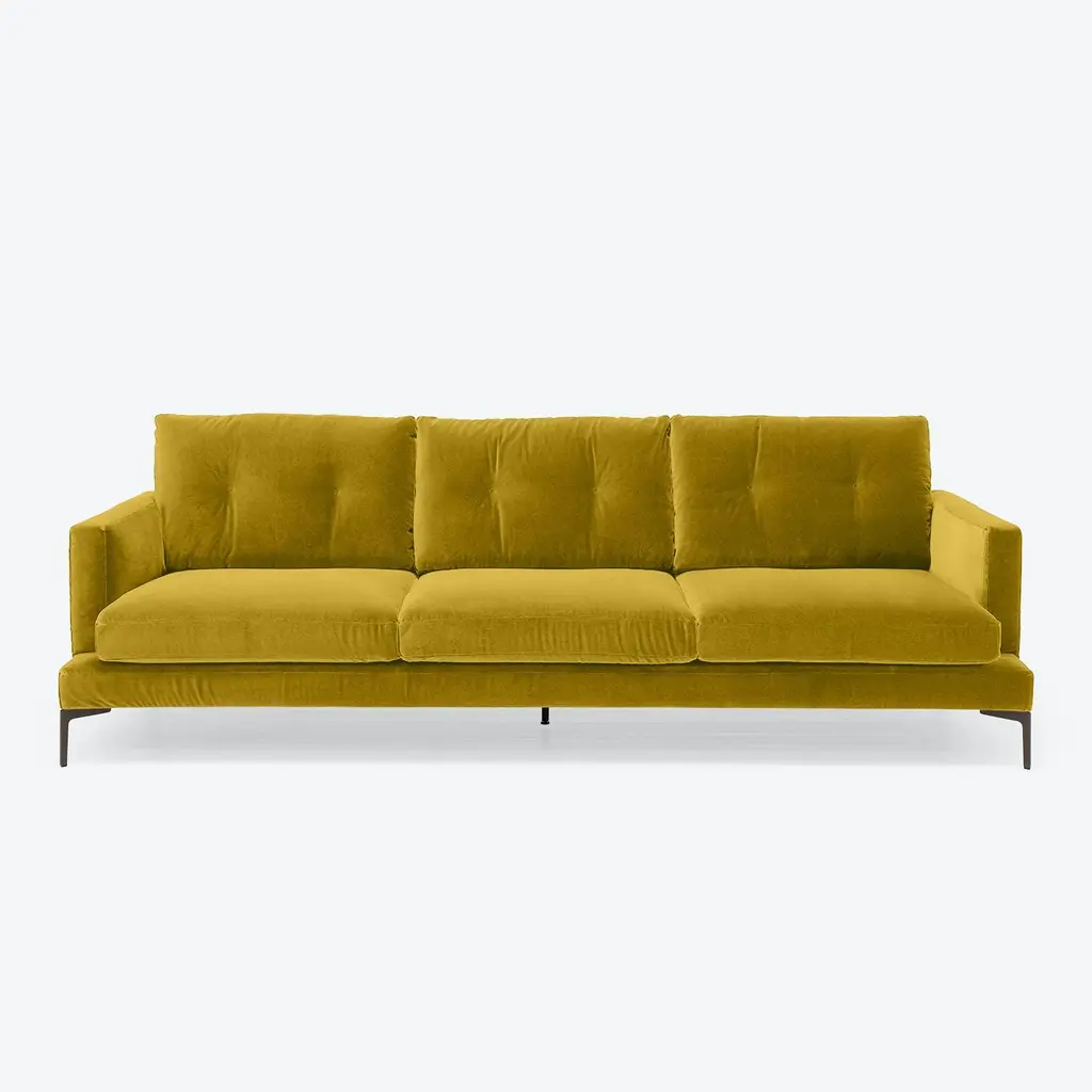Handcrafted in Italy, the Essentiel Sofa by Saba Italia captures the soul of Italian design, blending contemporary ease with timeless elegance. Available in two versatile sizes: 86.5"W x 33"H x 37"D (apartment scale) and 98.5"W x 33"H x 37"D, the silhouette feels tailored yet inviting. Shown in 100% Italian cotton velvet, the Essentiel Sofa by Saba Italia envelops you in comfort while introducing a touch of opulence. Choose from a curated palette of jewel-tone velvets, each selected to express individuality and warmth. A removable slipcover allows for effortless maintenance, making it easy to refresh or restyle your sofa as desired. Inside, the seat cushions are filled with a luxurious blend of foam and polyester fiber for lasting comfort, while the back cushions feature a feather and polyester mix encased in soft cotton fabric for a plush, lived-in feel. Sleek matte metal legs in a Corten finish ground the piece with an understated industrial edge, completing its refined profile. A study in balance, the Essentiel Sofa by Saba Italia exemplifies form and function, elegance and comfort. It reflects the brand’s dedication to detail and craftsmanship, visible in the subtle quilting of its back cushions and the harmony between northern restraint and Italian soul. Available Online Only.
