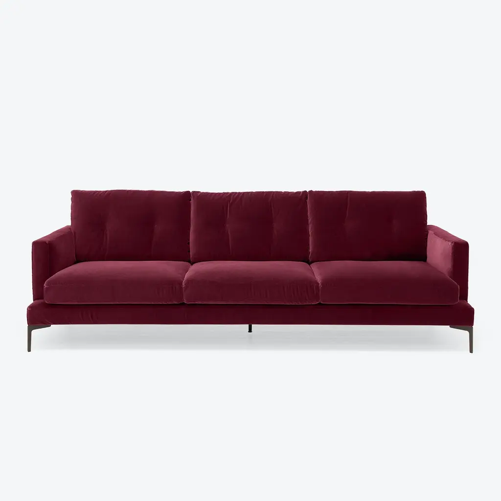 Handcrafted in Italy, the Essentiel Sofa by Saba Italia captures the soul of Italian design, blending contemporary ease with timeless elegance. Available in two versatile sizes: 86.5"W x 33"H x 37"D (apartment scale) and 98.5"W x 33"H x 37"D, the silhouette feels tailored yet inviting. Shown in 100% Italian cotton velvet, the Essentiel Sofa by Saba Italia envelops you in comfort while introducing a touch of opulence. Choose from a curated palette of jewel-tone velvets, each selected to express individuality and warmth. A removable slipcover allows for effortless maintenance, making it easy to refresh or restyle your sofa as desired. Inside, the seat cushions are filled with a luxurious blend of foam and polyester fiber for lasting comfort, while the back cushions feature a feather and polyester mix encased in soft cotton fabric for a plush, lived-in feel. Sleek matte metal legs in a Corten finish ground the piece with an understated industrial edge, completing its refined profile. A study in balance, the Essentiel Sofa by Saba Italia exemplifies form and function, elegance and comfort. It reflects the brand’s dedication to detail and craftsmanship, visible in the subtle quilting of its back cushions and the harmony between northern restraint and Italian soul. Available Online Only.