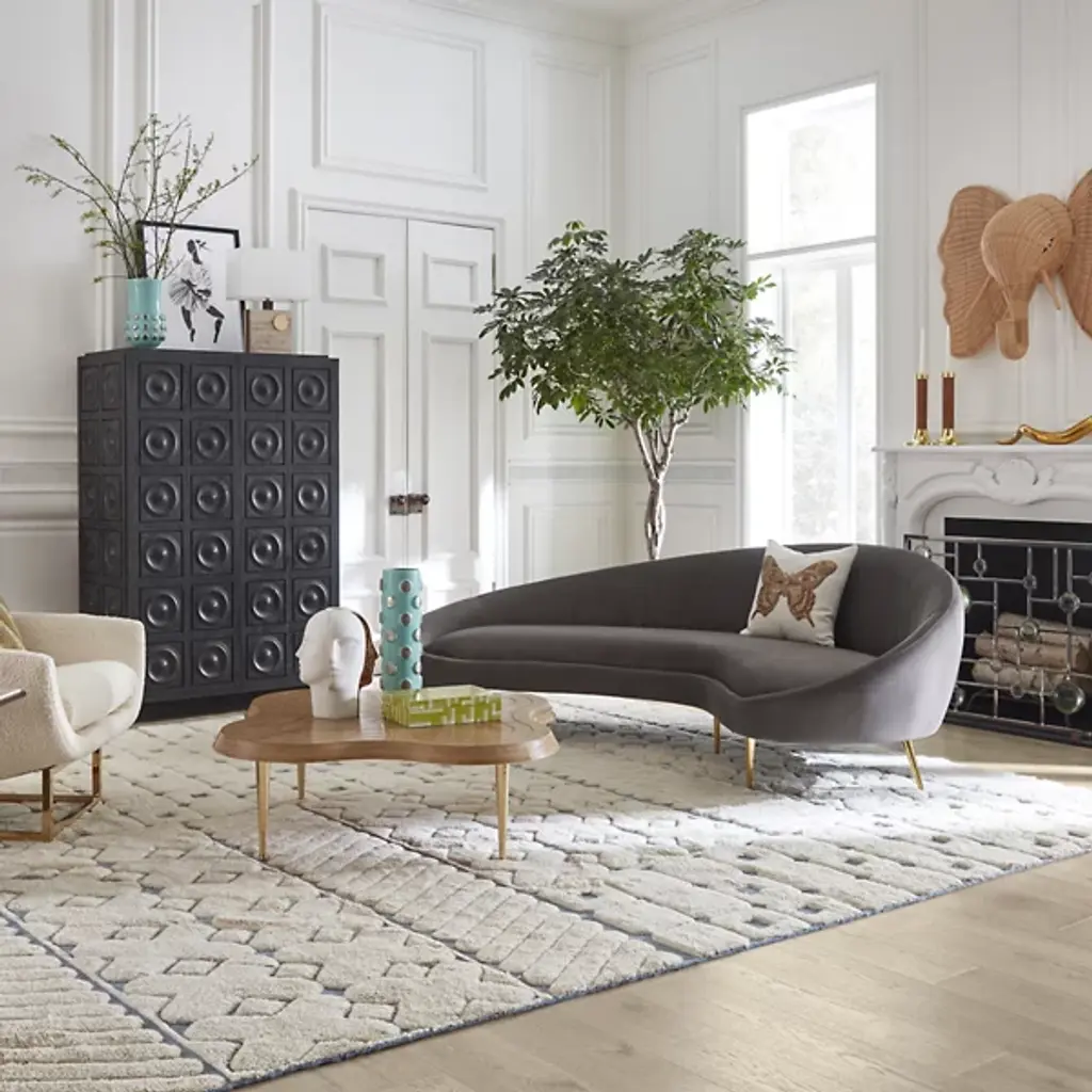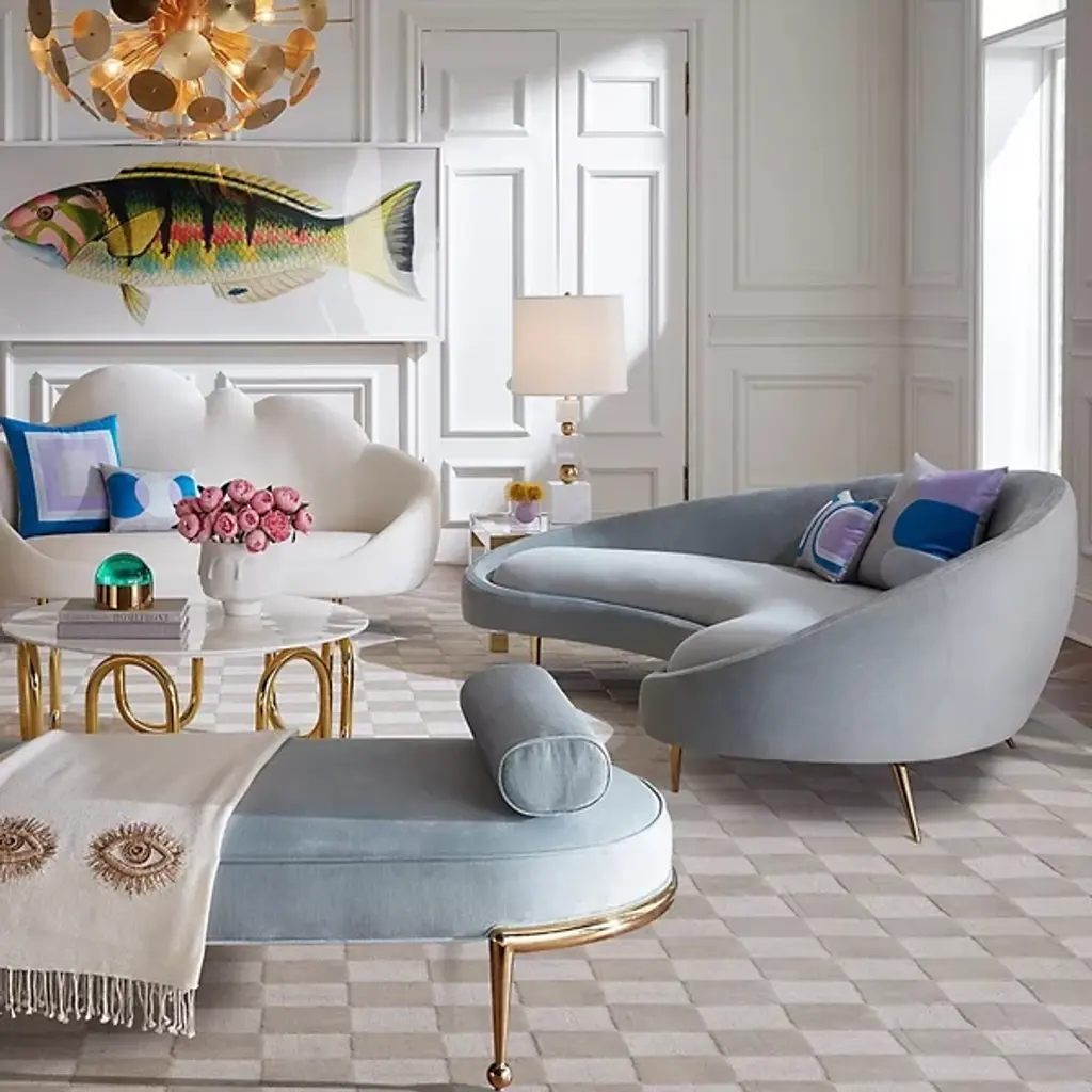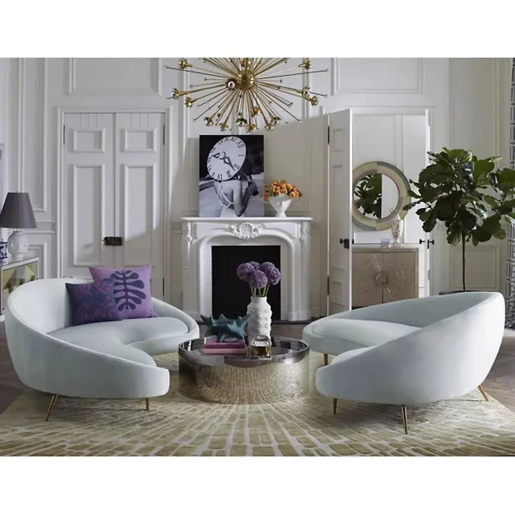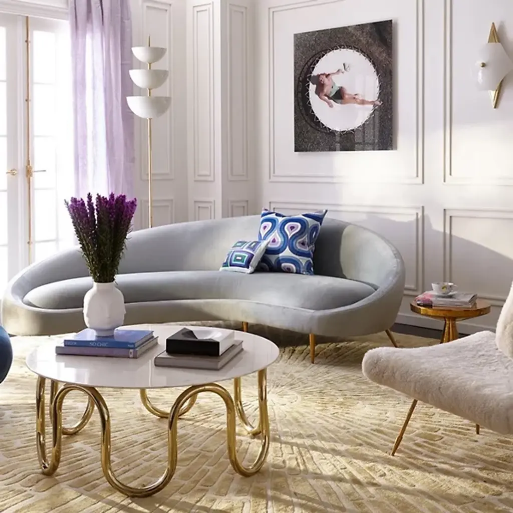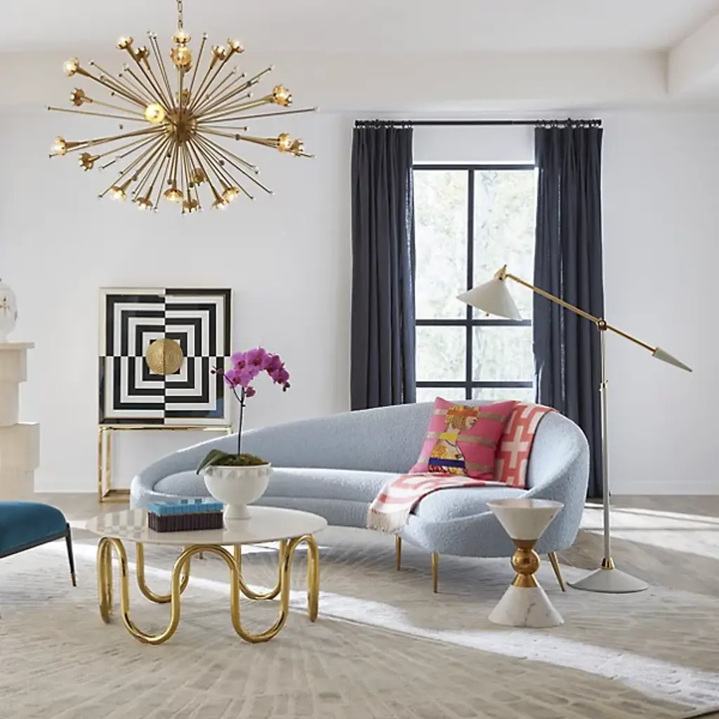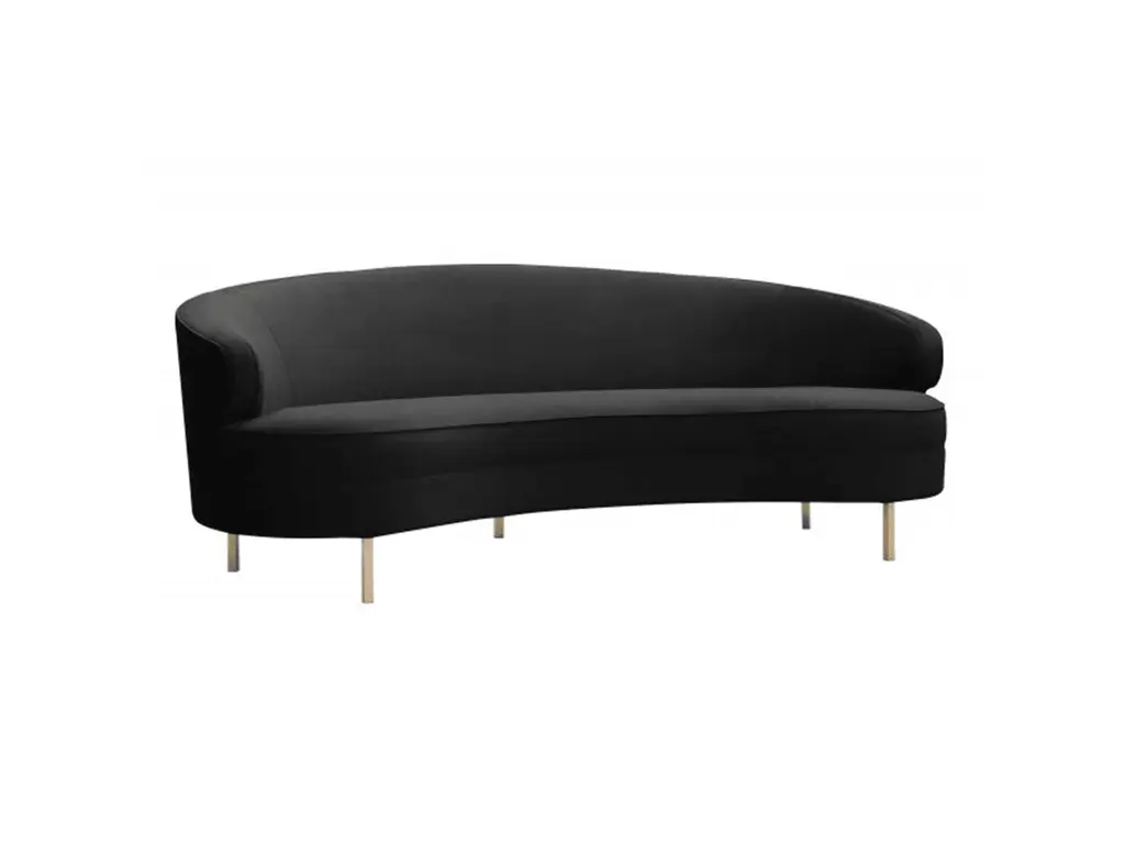 Calm and dreamy like the crescent moon on a quiet night. Come together with the high-style, communal design of the 415 Ether Curved Sofa from Jonathan Adler. This organically shaped piece is designed to match your living space’s imaginative floor plan. In a seductive stance, the polished brass stiletto legs accent the piece with a classic shine. The sofa produces a sweeping curve to comfort the back and support the arms with a single line. A seat rest follows on the bottom in a low profile. Cushioning fills the velvet-wrapped piece for sweeping comfort.
