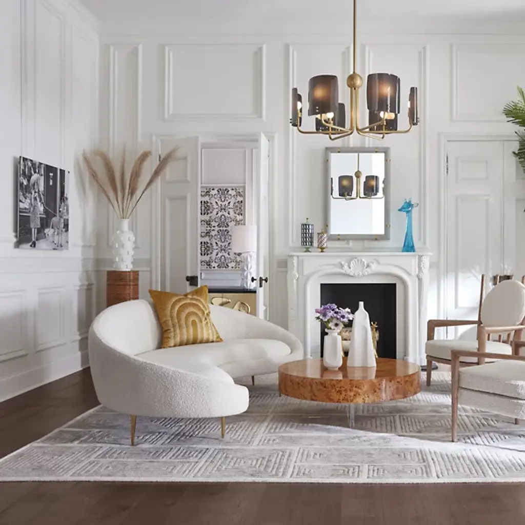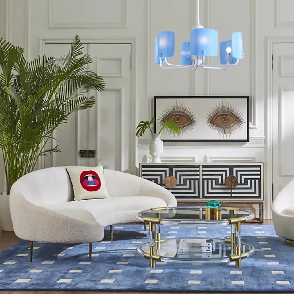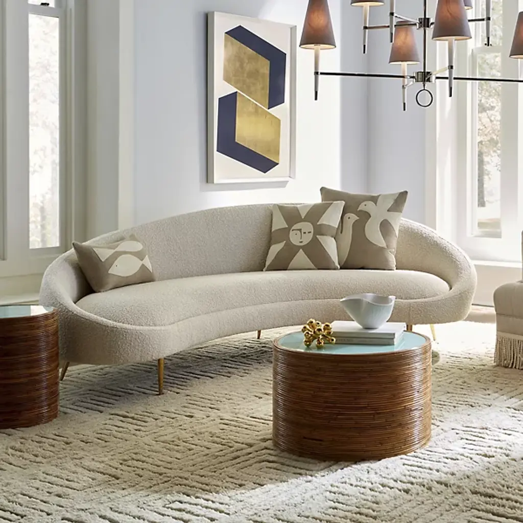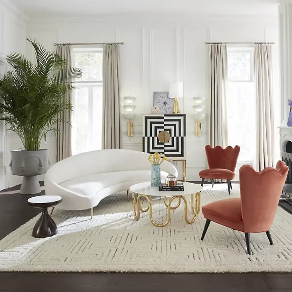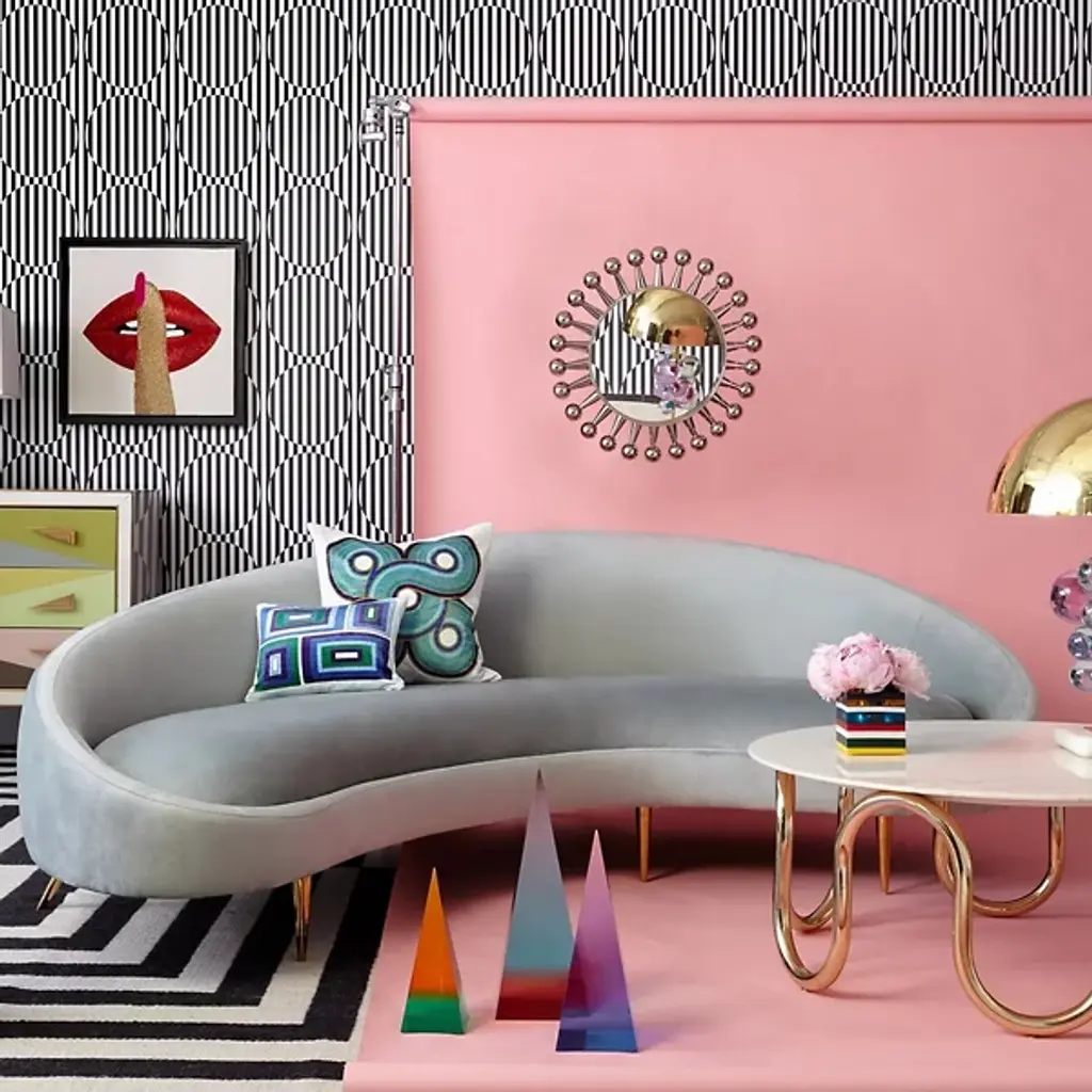 Calm and dreamy like the crescent moon on a quiet night. Come together with the high-style, communal design of the 415 Ether Curved Sofa from Jonathan Adler. This organically shaped piece is designed to match your living space’s imaginative floor plan. In a seductive stance, the polished brass stiletto legs accent the piece with a classic shine. The sofa produces a sweeping curve to comfort the back and support the arms with a single line. A seat rest follows on the bottom in a low profile. Cushioning fills the velvet-wrapped piece for sweeping comfort.