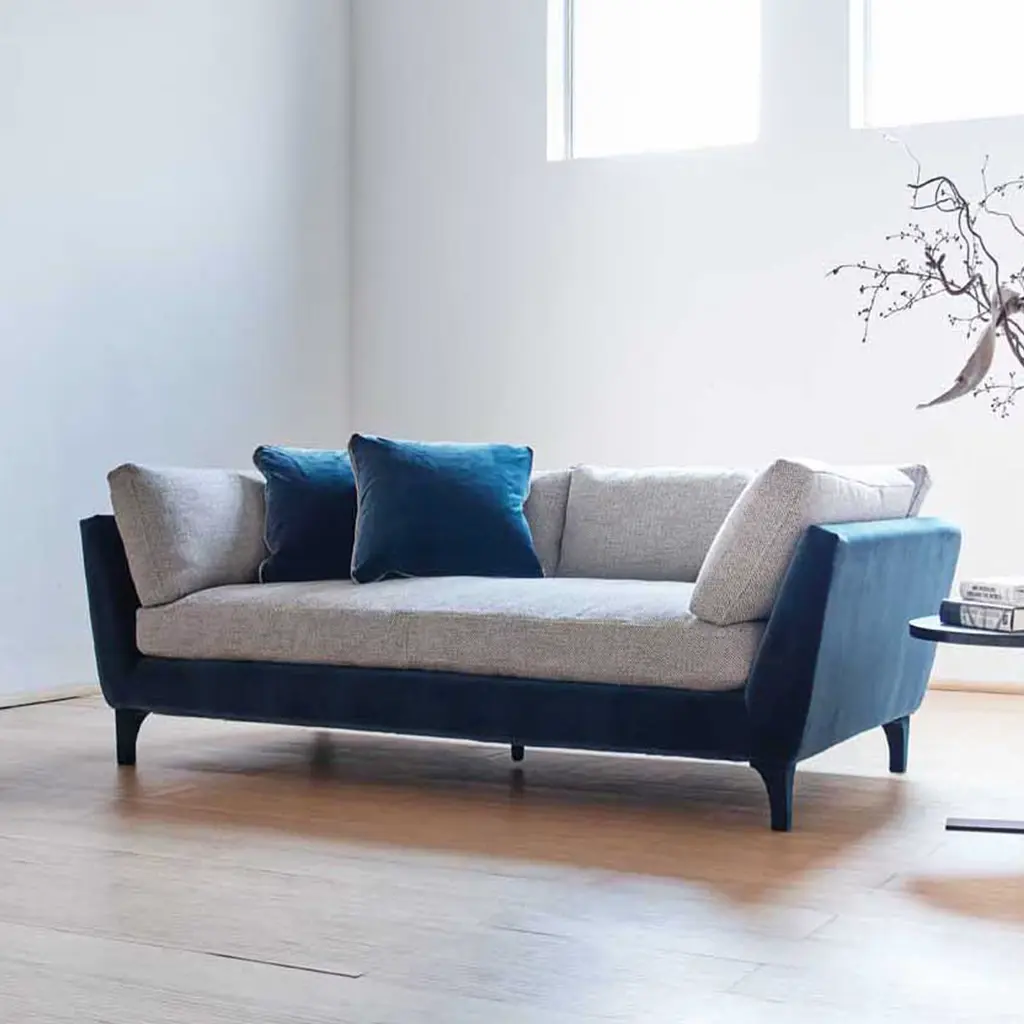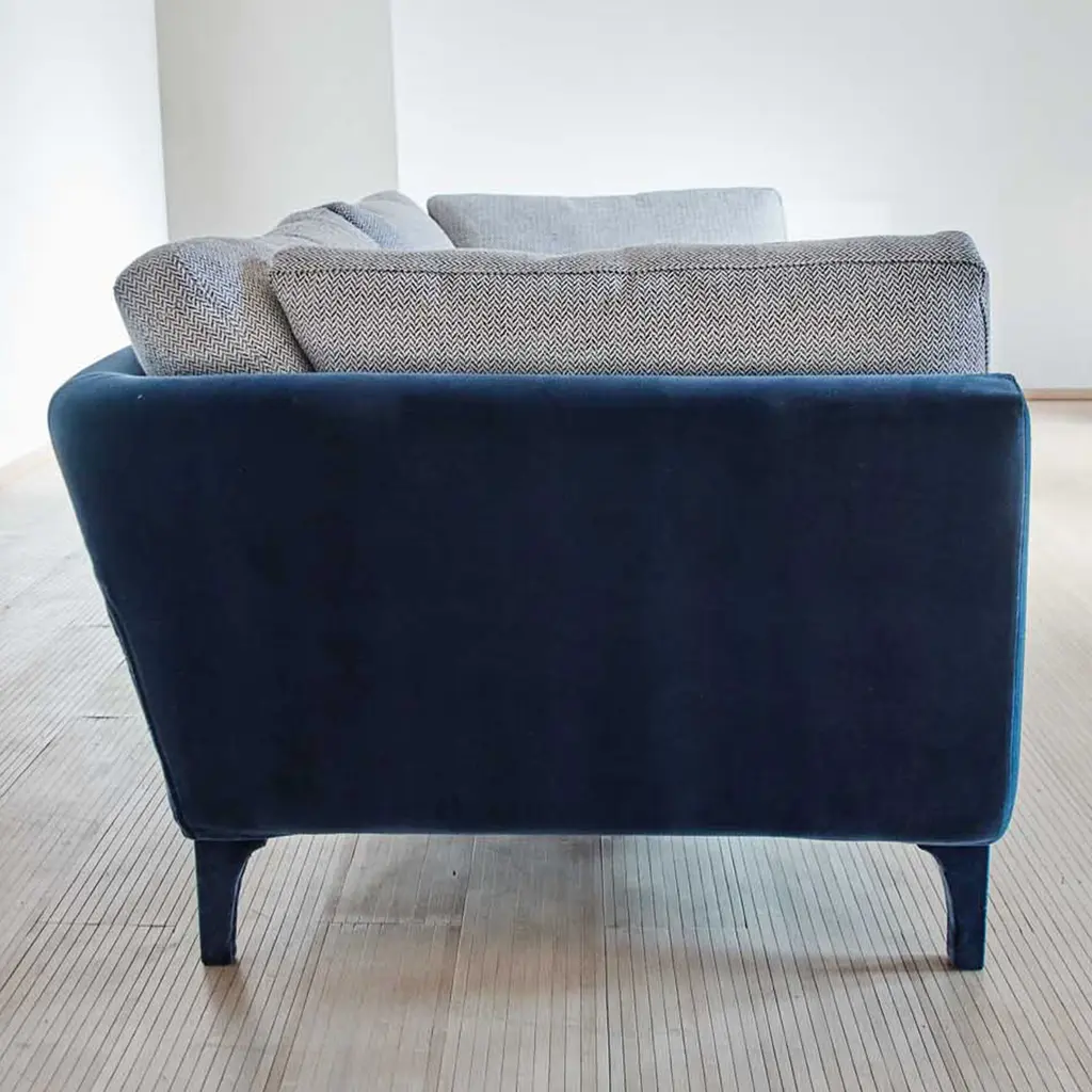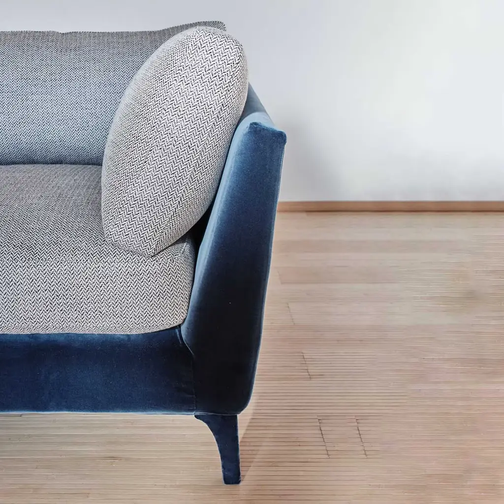 Eva strikes by its simple elegance, featuring straight and pure lines and yet a soft aspect. The slight inclination of its armrests and its pulpy cushioning seems to invite us to deep and voluptuous relaxation. This is a model suited for everyday and family use and yet with striking accent details that will make it the center of attention of any living room. Biosofa crafts 100% natural and plastic-free furniture near lake Como in Italy. Materials: linen and velvet.