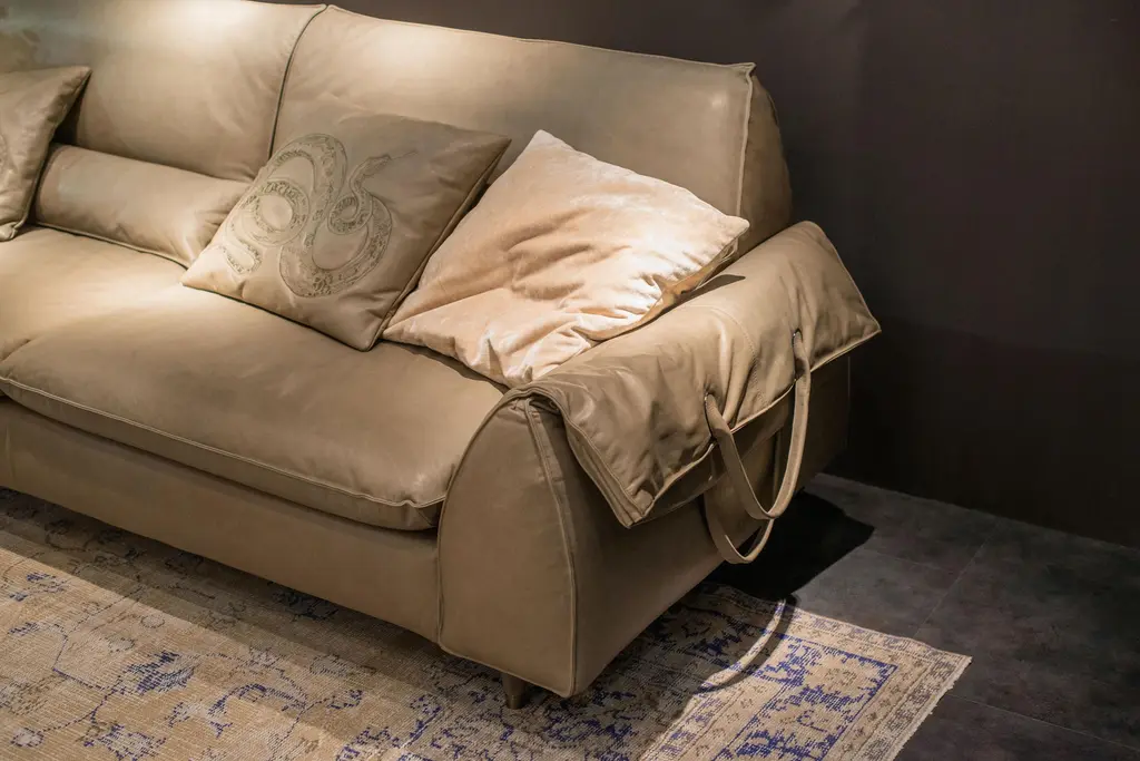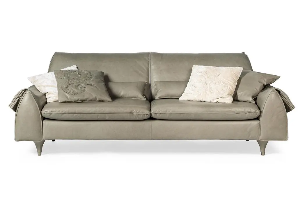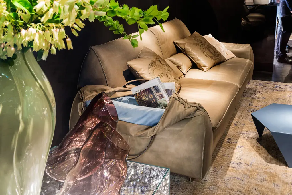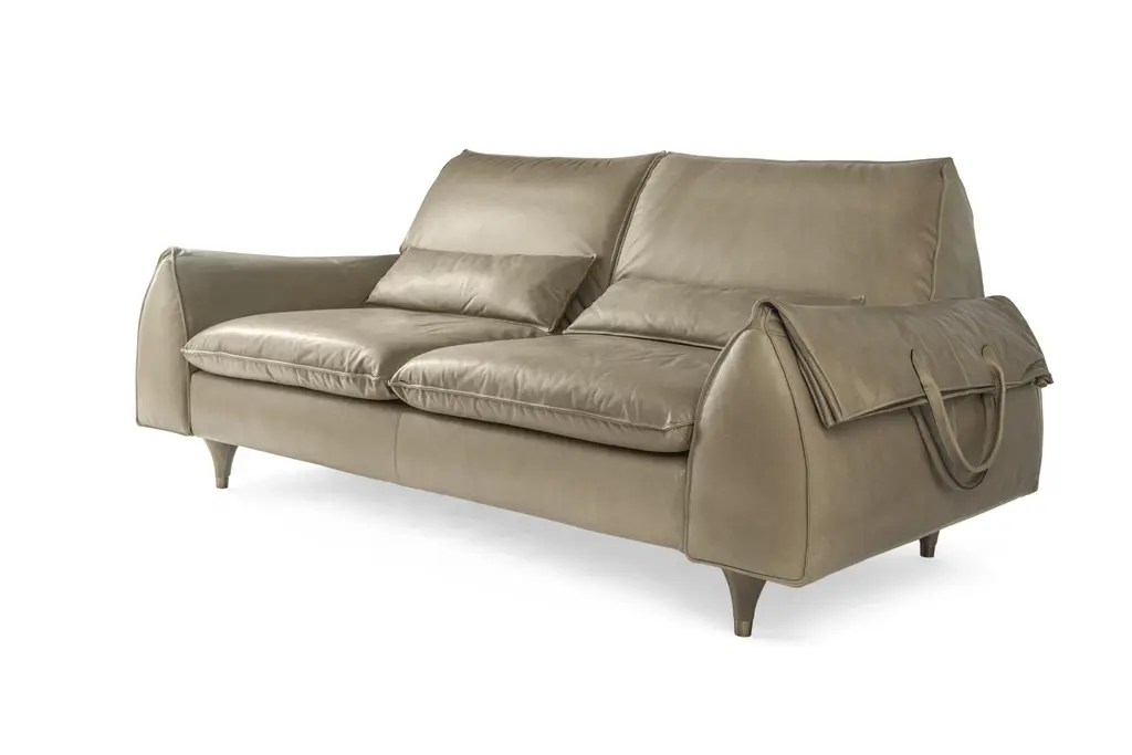 The Eve Bag sofa features a structure of multi-layered solid wood and 80 mm elastic belts. The padding is made of polyurethane foam with different densities. The metal feet are covered with pellet-fabric and the sofa is upholstered in dove grey leather.