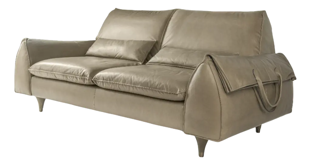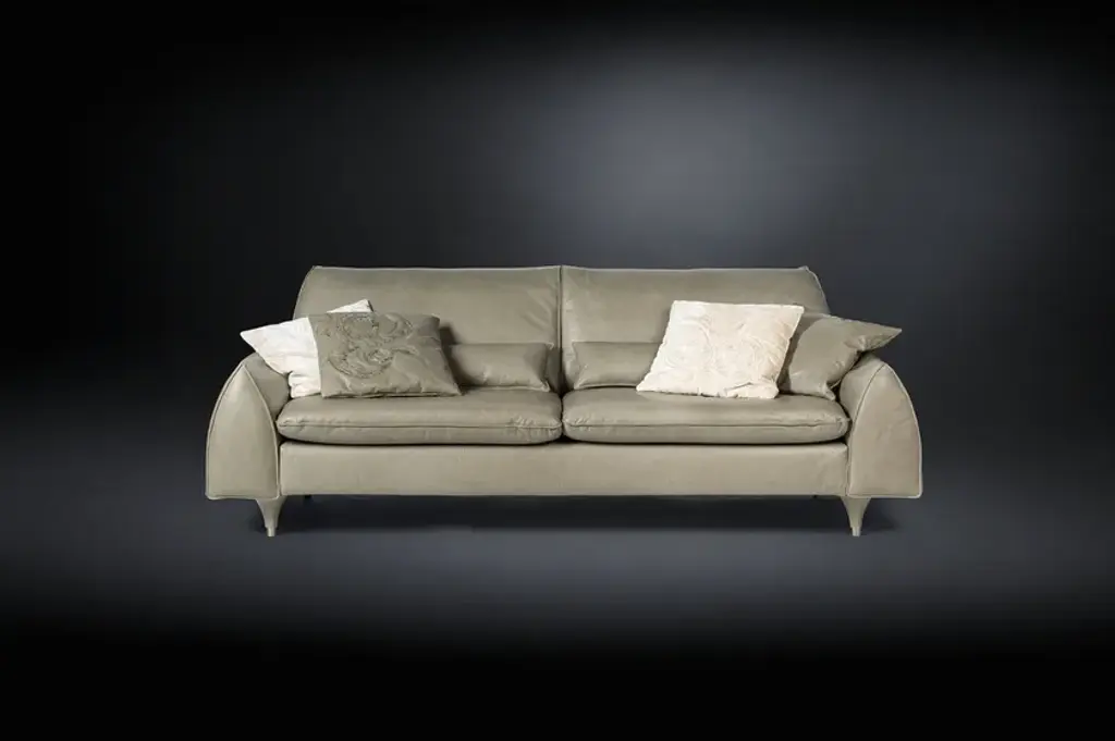 Dove grey aniline elite leather sofa, with solid wood frame and softwood plywood, polyurethane foam padding of different densities, elastic straps 80mm, leather covered legs with metal toe cap.100% Made in Italy.