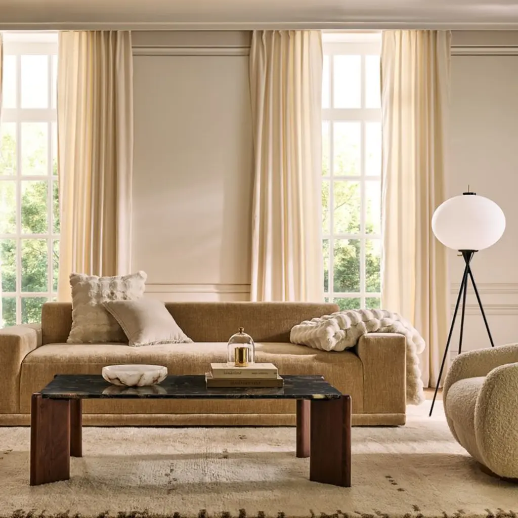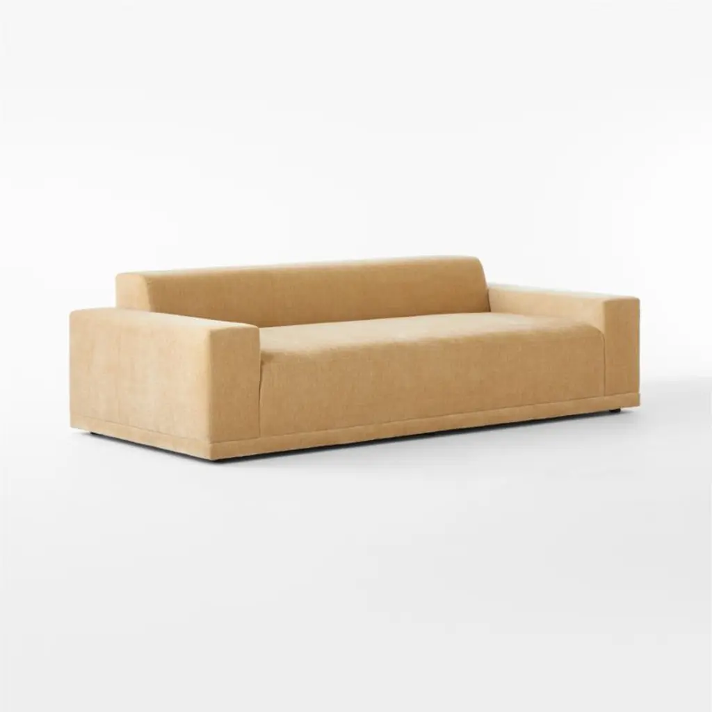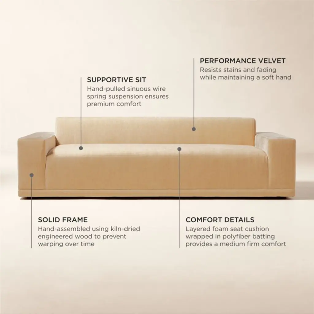 Deep, generously proportioned sofa designed by Melbourne-based VUUE is sophisticated in a wheat performance velvet. The oversized profile is perfect for lounging with family and friends without sacrificing style. Performance velvet withstands spills and other stressors, yet retains the lushness of a high-end textile. CB2 exclusive.