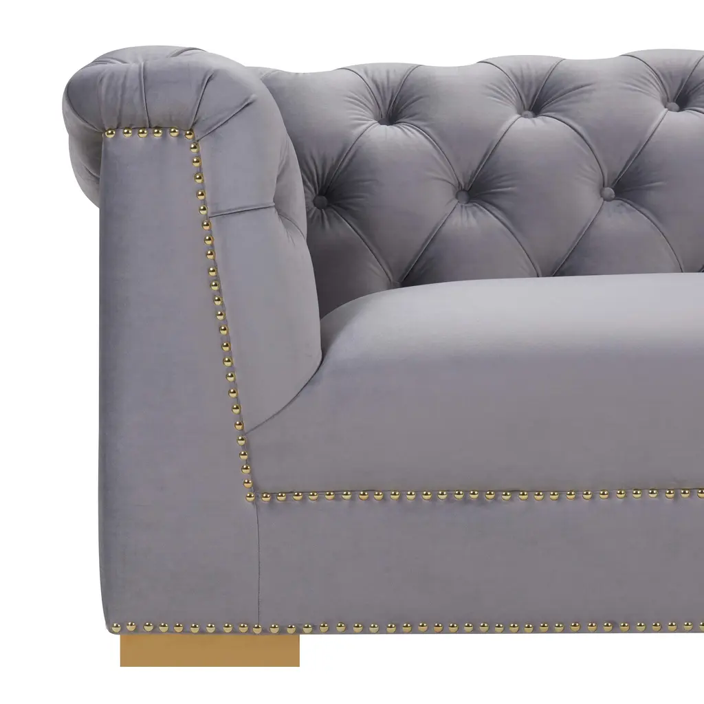 Offering a fresh and modern spin to a classic style, Inspire Me Home Decor and TOV proudly introduce the Farah loveseat. With its luscious velvet upholstery, unique tufted design on its rolled arms and hand applied gold nailhead trim, it will be the focal point of your living space. Available in several neutral color options to meet your home styling needs.