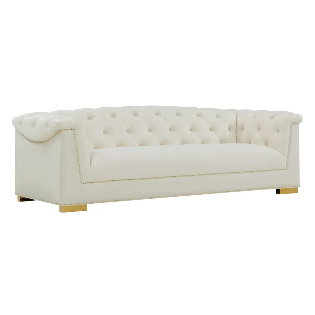 Offering a fresh and modern spin to a classic style, Inspire Me Home Decor and TOV proudly introduce the Farah loveseat. With its luscious velvet upholstery, unique tufted design on its rolled arms and hand applied gold nailhead trim, it will be the focal point of your living space. Available in several neutral color options to meet your home styling needs.