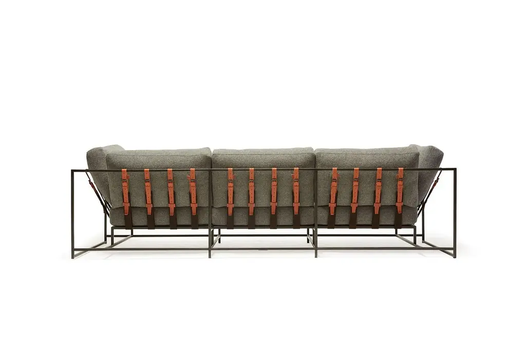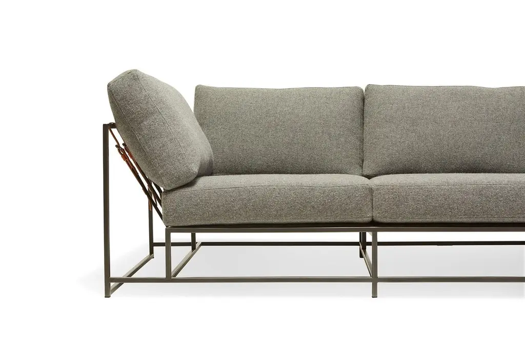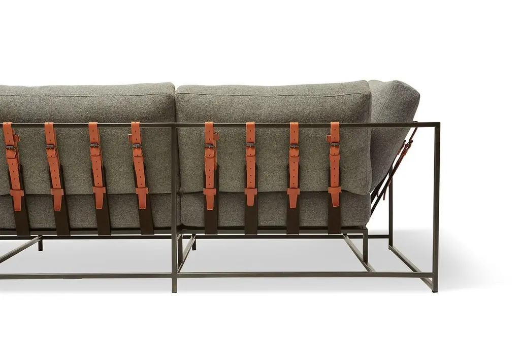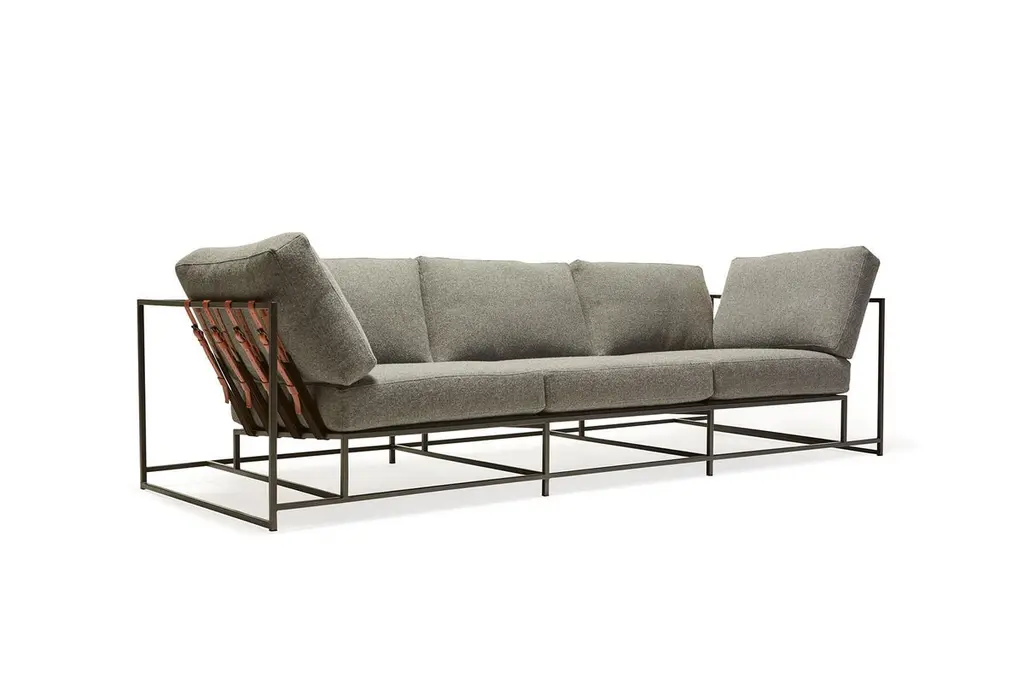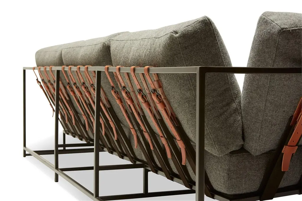 The Inheritance Sofa by Stephen Kenn is as comfortable as it is unique. The design features an exposed construction composed of three elements - a steel frame, plush upholstery, and supportive belts. The deep seating area is perfect for a relaxing lounge experience. This sofa comes with removable cushion covers to allow for easy cleaning should the need arise. Every Stephen Kenn piece is made to order through our Los Angeles studio in partnership with a number of small businesses and fabricators in the LA area. With this highly customizable sofa you can select from a wide range of finishes and materials to complement your home and lifestyle - please message us to see our Customization Guide with all available options.This version of our Inheritance Sofa is upholstered in charcoal grey wool by Faribault Woolen Mills. The foam seat cushions have been wrapped in polyfiber for added softness and comfort. Sitting atop a blackened steel frame, the sofa is strapped with support belts featuring charcoal cotton webbing, cognac leather, and blackened steel buckles.