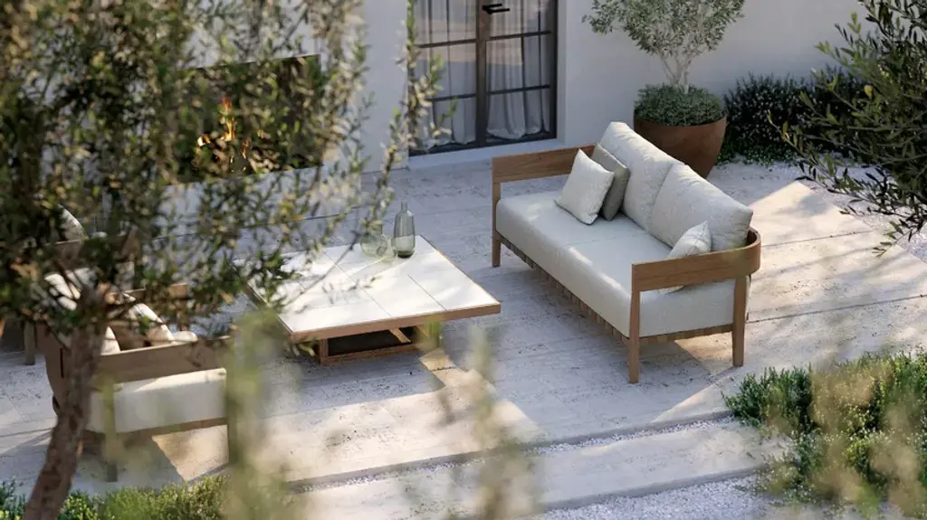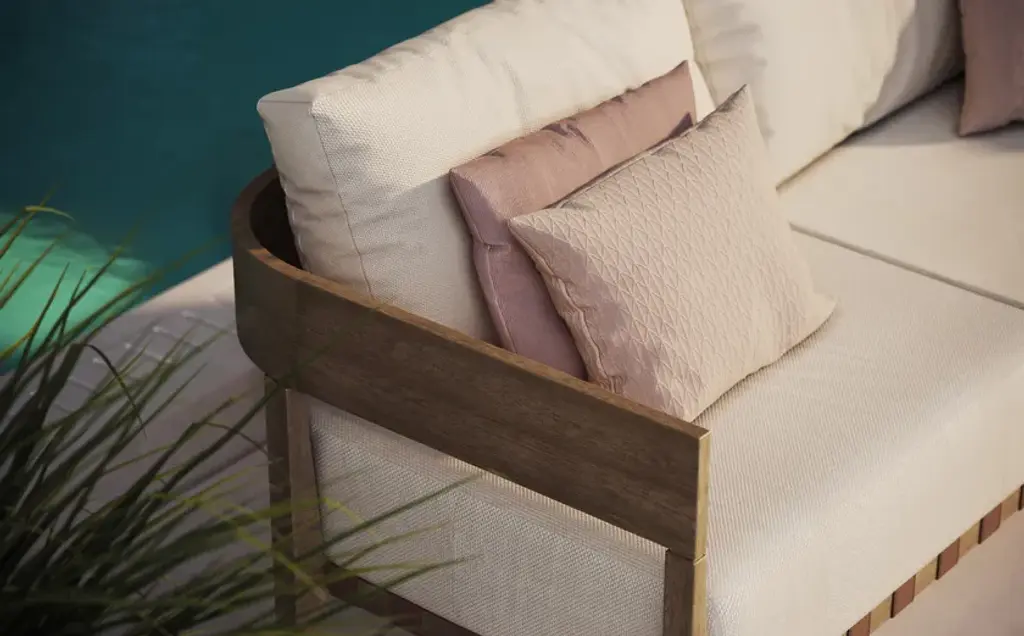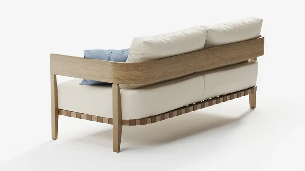 2 seater garden sofa with iroko frame.Purchase information:Small decorative back cushions not included.Additional fabric and color combinations on request.The Feeling collection reflects the concept of modern and minimalist aesthetics with soft and essential lines. The organic shape and sculptural legs are the synthesis of a study of simplicity and harmonious proportions. The palette is decisive, warm and embracing: iroko wood treated with natural finishes, is the perfect background to seat the backrest in stitched leather, a detail that decorates and characterizes its essence. Feeling is a collection that works in any context, creating a charming atmosphere of simple lines and retro atmosphere.