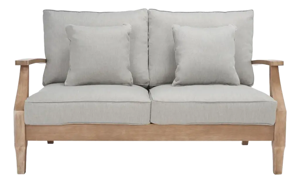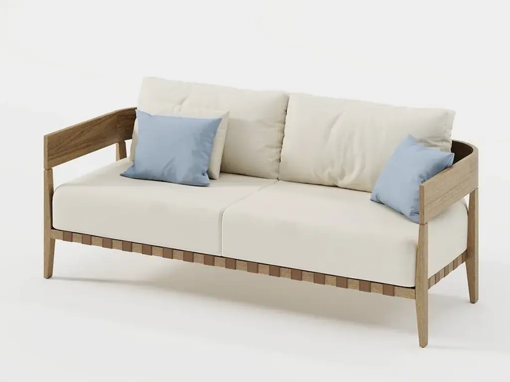 A sense of retro sophistication is exuded by this elegant sofa, characterized by an enveloping backrest shell part of a general sturdy structure in Iroko wood. Offered in a natural finish, the frame is equipped with leather details and contouring the lower profile of the wide cushioned seat. Generous padding and soft beige upholstery distinguish the back cushions. Includes seat and back cushion in cat A fabric. Includes leather backrest. Excluding decorative cushions.