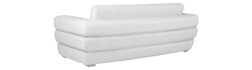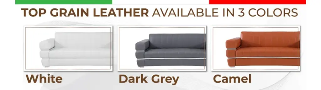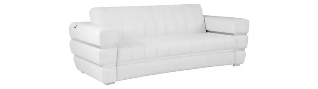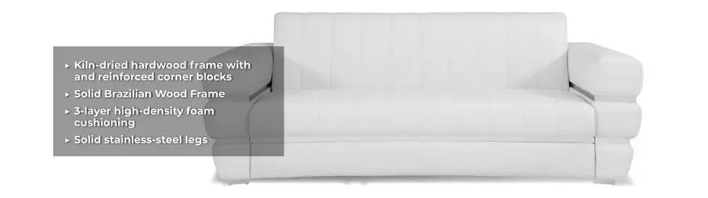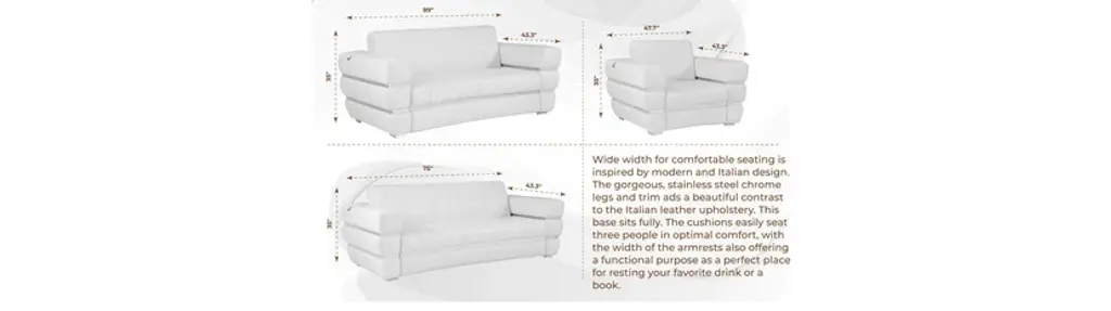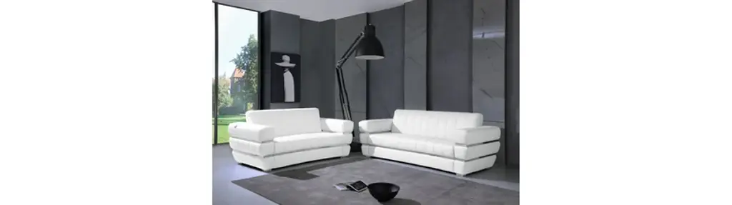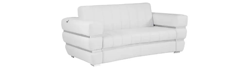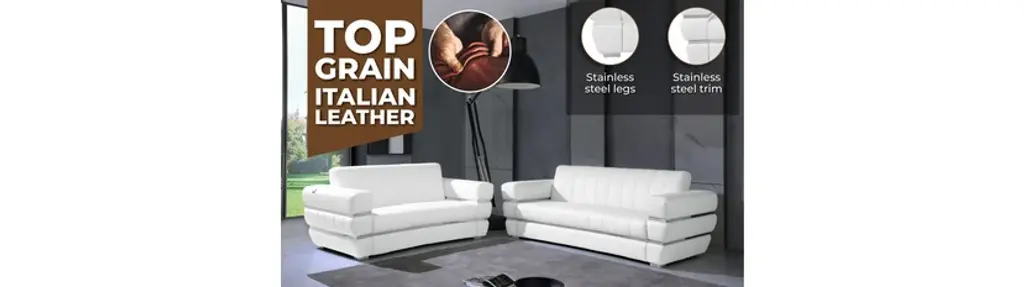 This Ferrara Modern White Genuine Italian Leather Sofa and Loveseat is crafted using the finest of materials, durable solid wood construction and premium leather. The Ferrara living room Sofa and Loveseat features a luxurious comfort, elegant appeal, and bird nest leather design. Crafted from White Genuine Italian Leather. The Ferrara Sofa and Loveseat is a fine example of modern design. It displays an aesthetically pleasant linear design with chrome accents to foster sophistication. A great way to convey simple luxury in any room. Mindfully designed with gently arms, and plush high density seat cushions for maximum comfort, this masterpiece is a delightfully distinguished mix of functionality and style. The chrome legs effortlessly elevate any room with a touch of contemporary design.White Genuine Italian Leather UpholsteryBird nest leather designFrame Construction: Solid Brazilian WoodBack Construction: Webbing with fiberSewing Type: Tone on Tone StitchingPacking Material: Soft PackageAssembly Required: Minor