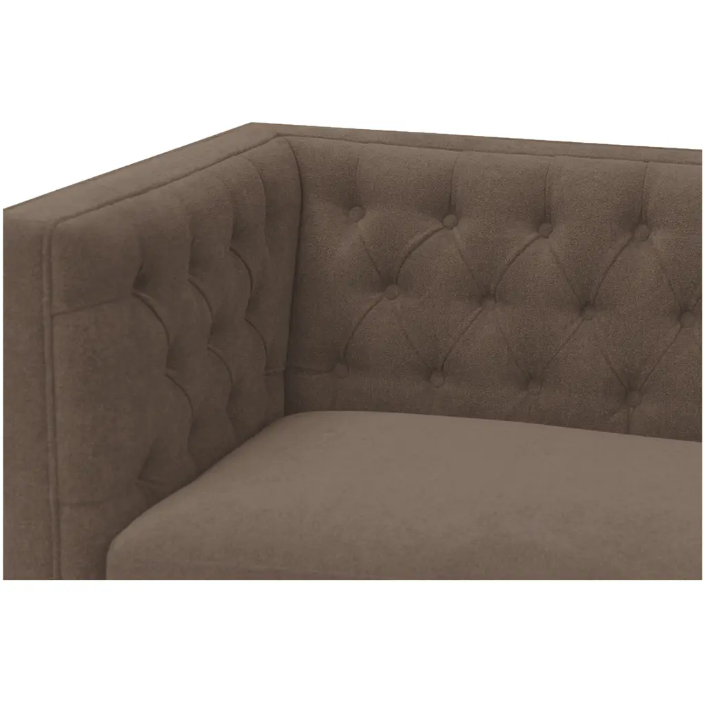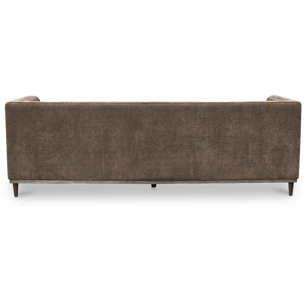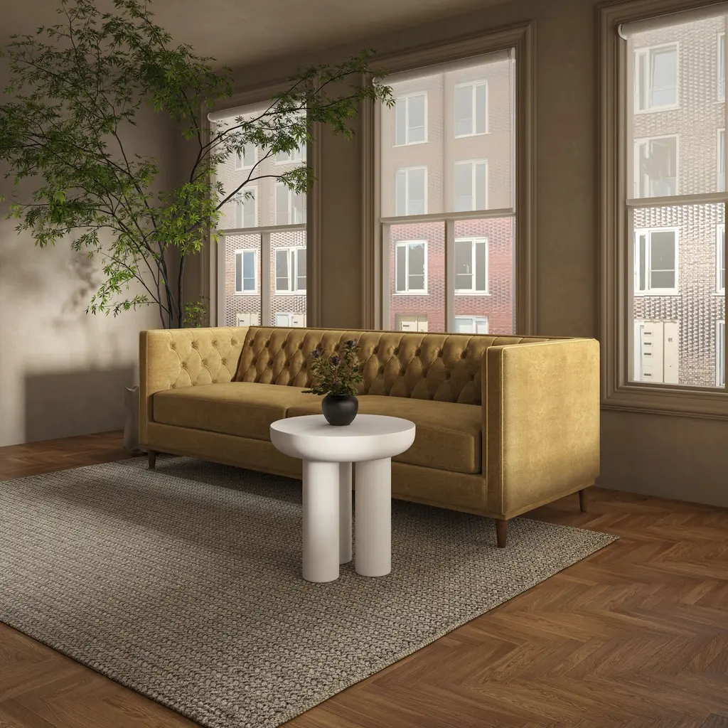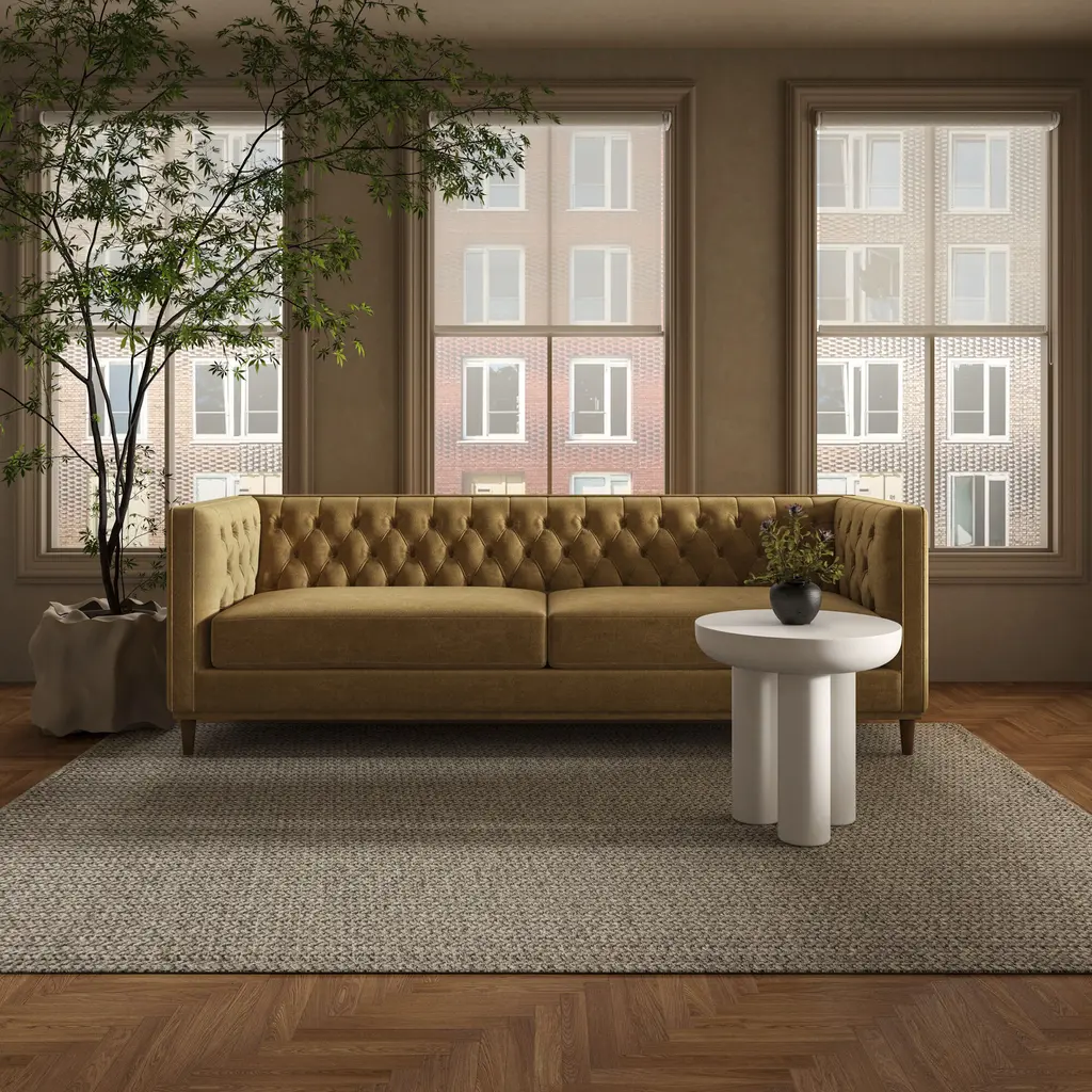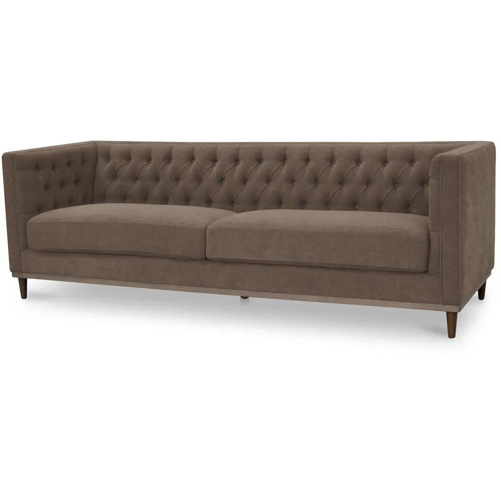 The Fielder sofa combines traditional elegance with contemporary resilience, featuring a soft textured fabric upholstery. The classic form includes tufted details, providing a nod to traditional aesthetics, while the clean lines and warm walnut finish on the wooden base inject a modern touch.