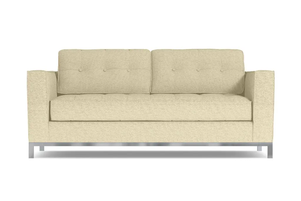 The Fillmore Sofa is the epitome of sophistication and timeless design and is sized just right for your apartment. The button-tufted pillows feature piping for added dimension and the stainless-steel base highlights its modern style. The Fillmore doesn't sacrifice comfort for style, however. The deep seat offers plenty of room for lounging, so we're sure this will become one of your favorite pieces. Created by interior design wunderkind Kyle Schuneman exclusively for Apt2B, the Fillmore is available in your choice of colors and fabrics, so whether you're looking for a neutral shade or you're leaning more toward vibrant pink or green, we've got you covered. This sofa was made in the United States and features a limited lifetime warranty. Apt2B offers a 100-percent satisfaction guarantee. The ultimate in sophistication and downtown style, The Fillmore is a hot addition to any room that needs a boost. A full stainless steel base and a nice deep seat make this a sofa you will have for years and the tufting on the seat and back cushions make it a timeless design.
