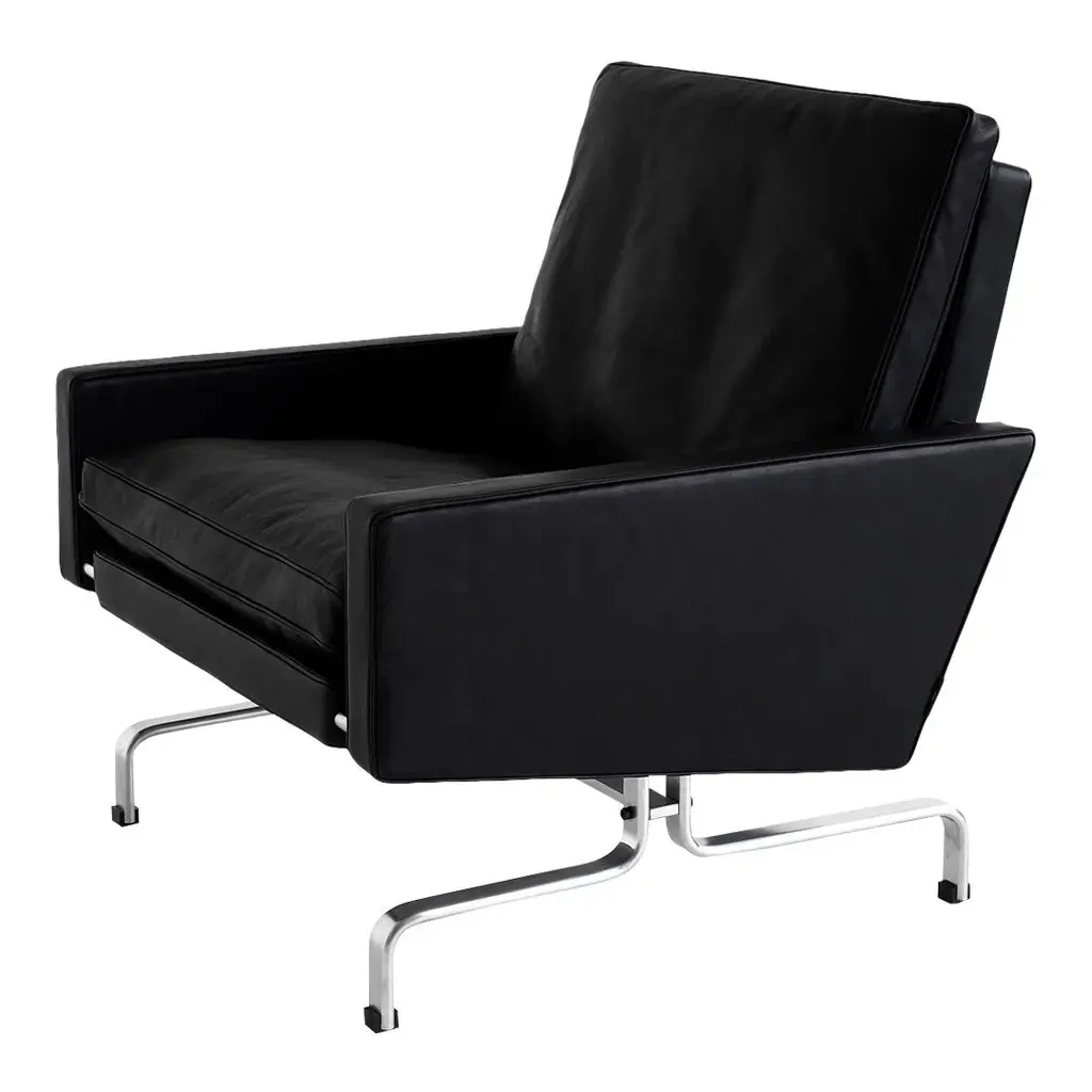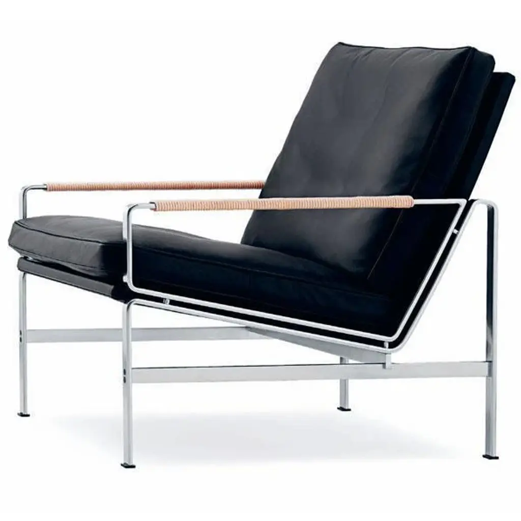 Three-seat sofa with frame in chrome-plated steel. The FK 6720 3-seat sofa is being produced with steel from 1968. The steel was found at the factory, where the chairs originally were produced. The Loose cushions are in analin leather. The furniture is produced at the same factory and with the same tools used in the 1960s to make the original furniture. The entire production is carried out in close collaboration between Lange Production and Jorgen Kastholm.