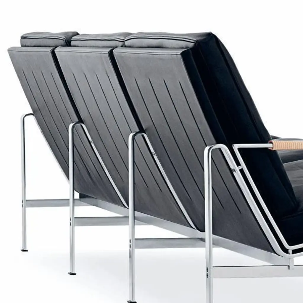 Three-seat sofa with frame in chrome-plated steel. The FK 6720 3-seat sofa is being produced with steel from 1968. The steel was found at the factory, where the chairs originally were produced. The Loose cushions are in analin leather. The furniture is produced at the same factory and with the same tools used in the 1960s to make the original furniture. The entire production is carried out in close collaboration between Lange Production and Jorgen Kastholm.