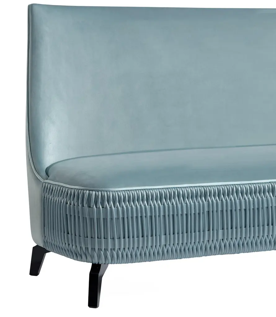Flame Sofa by Memoir EssenceDimensions: D 80 x W 220 x H 100 cm.Materials: Velvet TT, satin STN and lacquer.Also available in client's fabric. Please contact us.Flame Sofa exudes the passion for design through its structured but yet feminine silhouette. In a bold color and with a refined blend of fabrics this piece has in the seat detail the flame expression and strength of the design shown through its delicate interlacing. Make you living room special with Flame Sofa.Memoir Essence Interiors has been writing its memoirs day by day, inspired in every detail lived through a feminine world, this world brings the most delicate imaginary. Jewelry, fashion, architecture, music, art and materials are Memoir’s inspirations to materialize a collection of design pieces of furniture, upholstery, lighting and accessories.The use of noble materials like marble, brass, veneers, gold and silver leaf, Swarovski crystals as other decorative and fine materials, combined with handwork techniques as casted brass, hand-whickered fabric ribbons, gold leaf appliance, marble cutted and puzzled pieces, provide the needed essence to tell memoirs through the designed pieces and the interiors they fulfill.This collection mostly handmade and focused on details and material nobility is made in Portugal, bringing handwork techniques that are part of Portuguese history, applied in a current and differentiated way, delivering timeless pieces to your special projects. Acquire Memoir is the opportunity to travel through the feminine essence over design and experience a unique “memoir” of timelessness and exclusivity.Writing is first chapter in 2016, after a journey of inspirational research, forecasting and design, Memoir made its first appearance at Maison et Objet, Paris.Since then Memoir is “writing” memories adding new materials, designs, techniques and appearances around the world, as in Paris, London or UAE.Memoir will continue this journey, always motivated by the inspiration possibilities in the many delicate details found in feminine world.Tell your memoires with this collection and be a memorialist yourself…