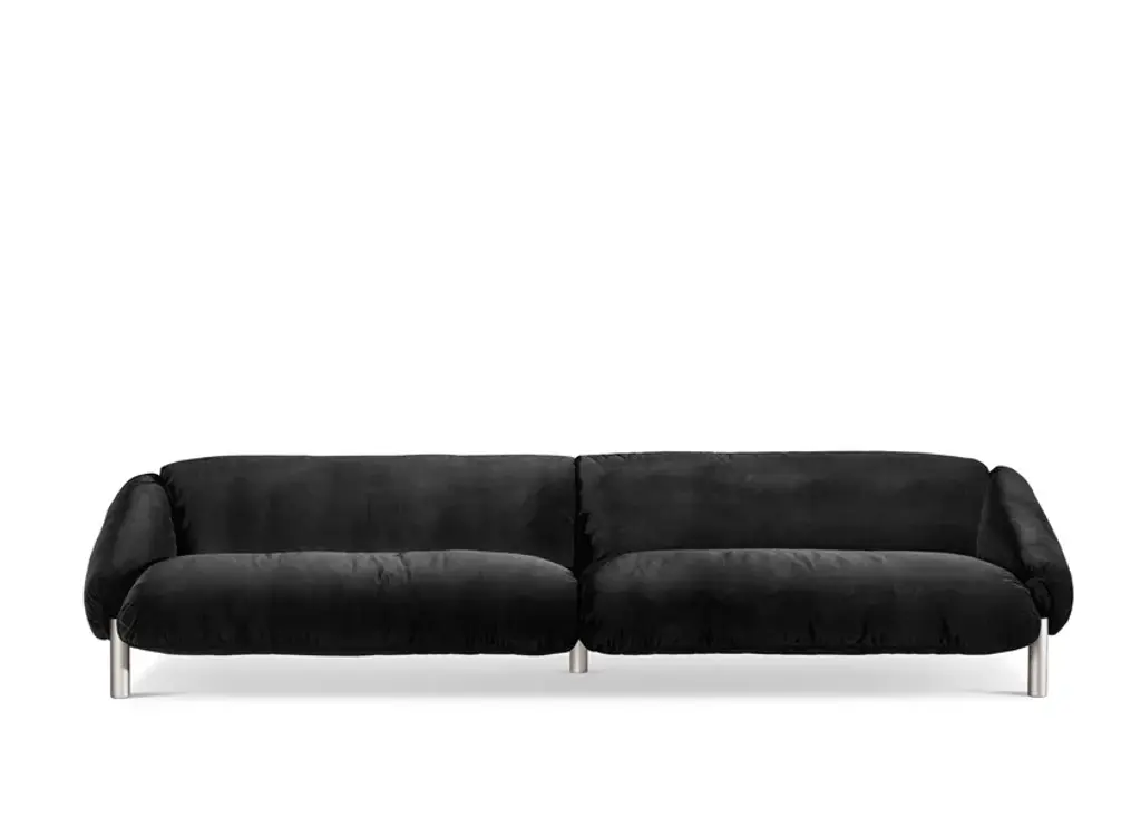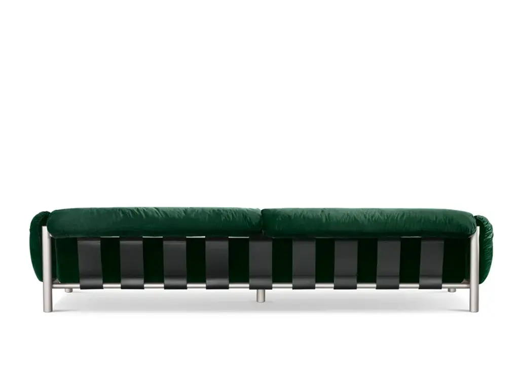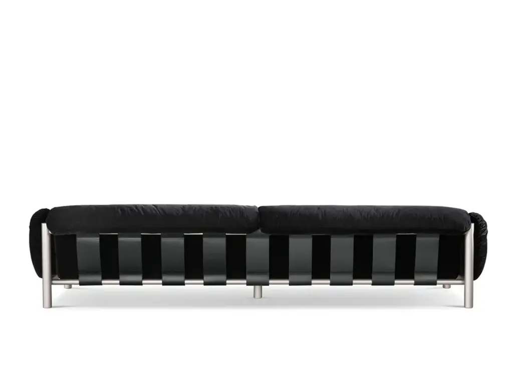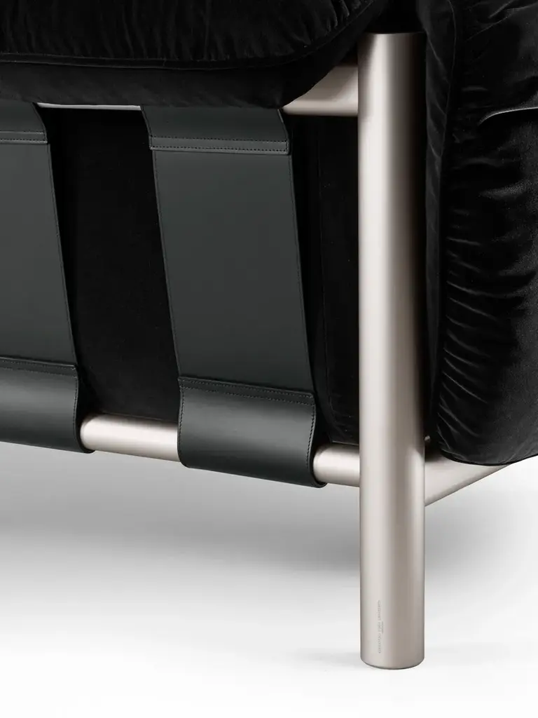 Flo is a 4 seater sofa made by a metal structure made with the skill of Ghidini 1961 known for its excellence in metalworking, the black velvet of the covering gives a strong and distinctive character suitable for both modern and traditional environments. A reinterpretation that fully embraces the principles of contemporary design.The Flo series pays homage to mid-20th century Brazilian design, emphasizing high-quality materials and comfort such as the use of leather straps to support the seat and backrest.