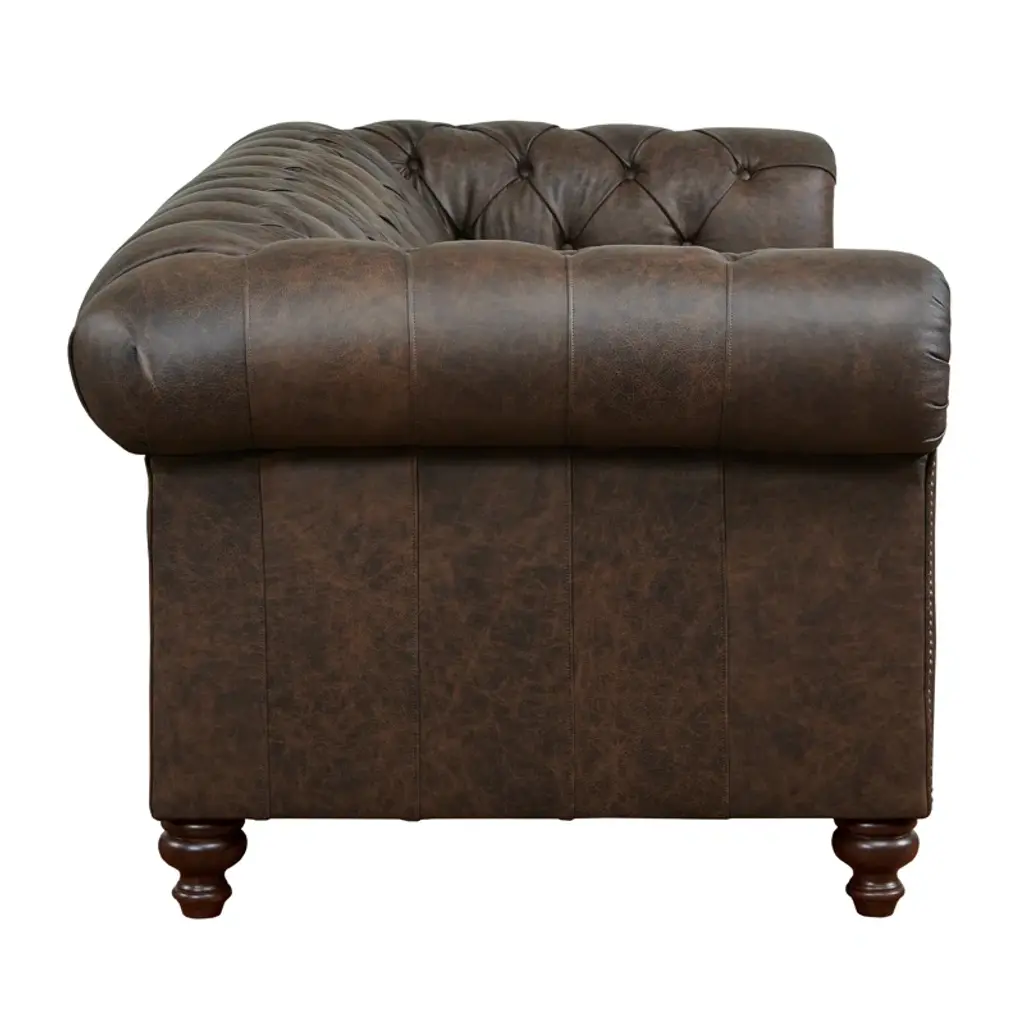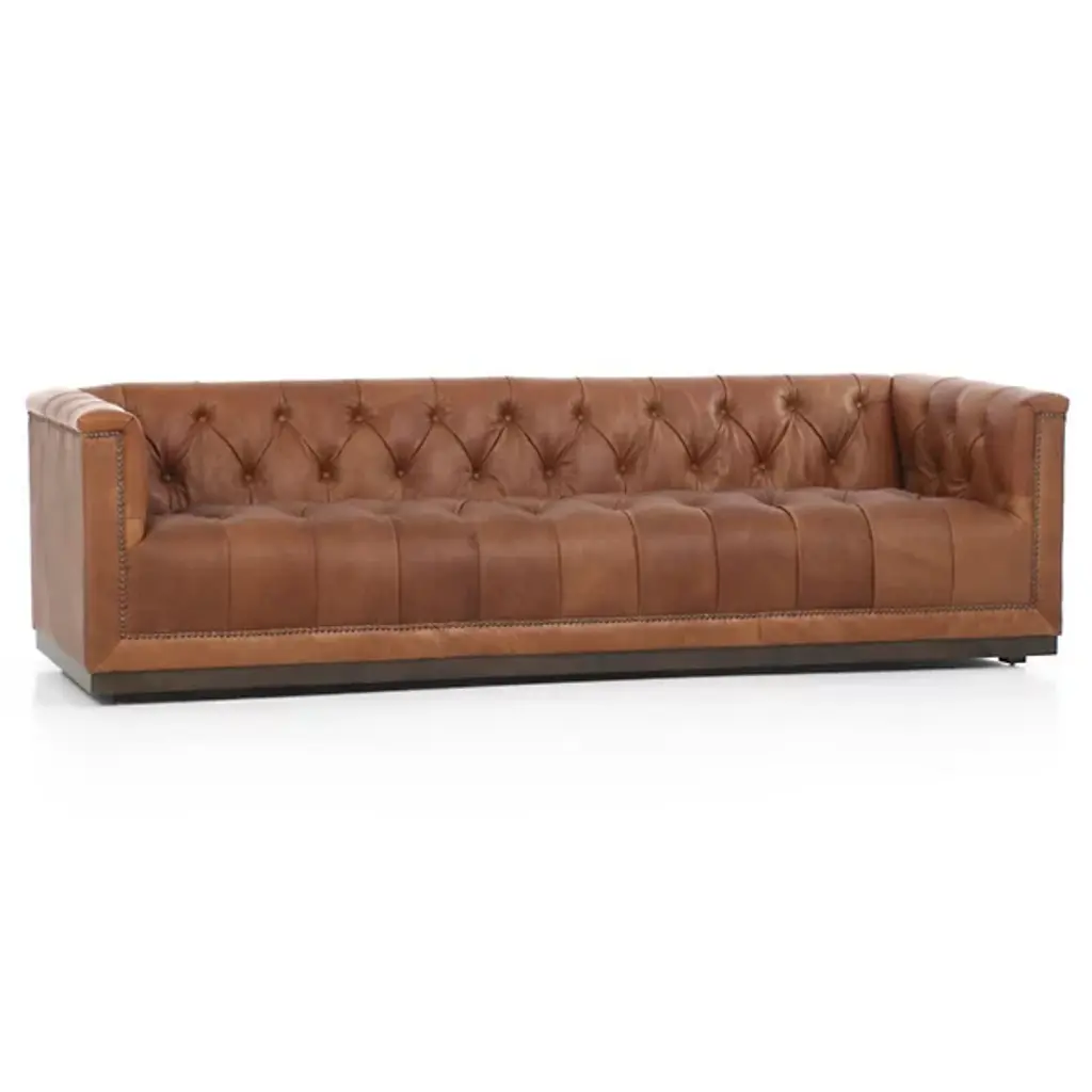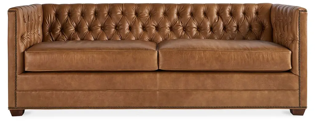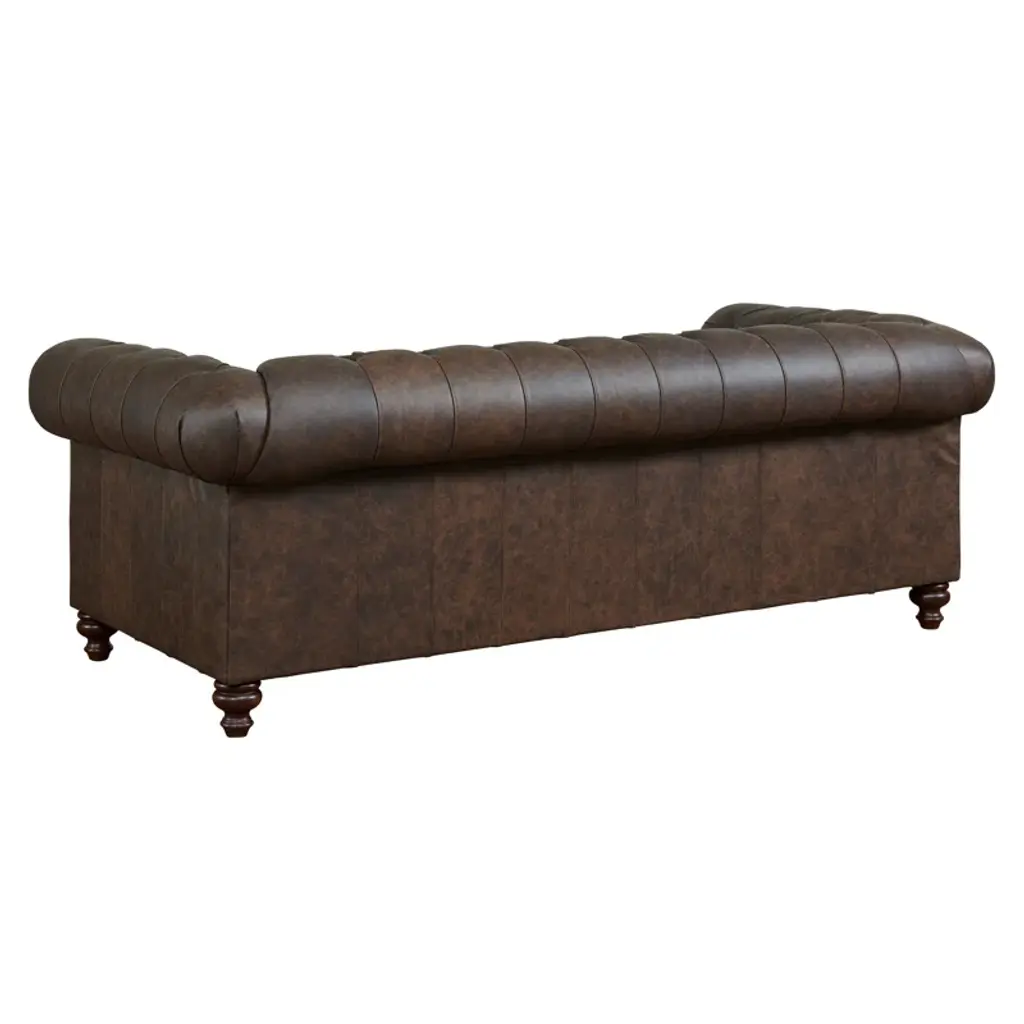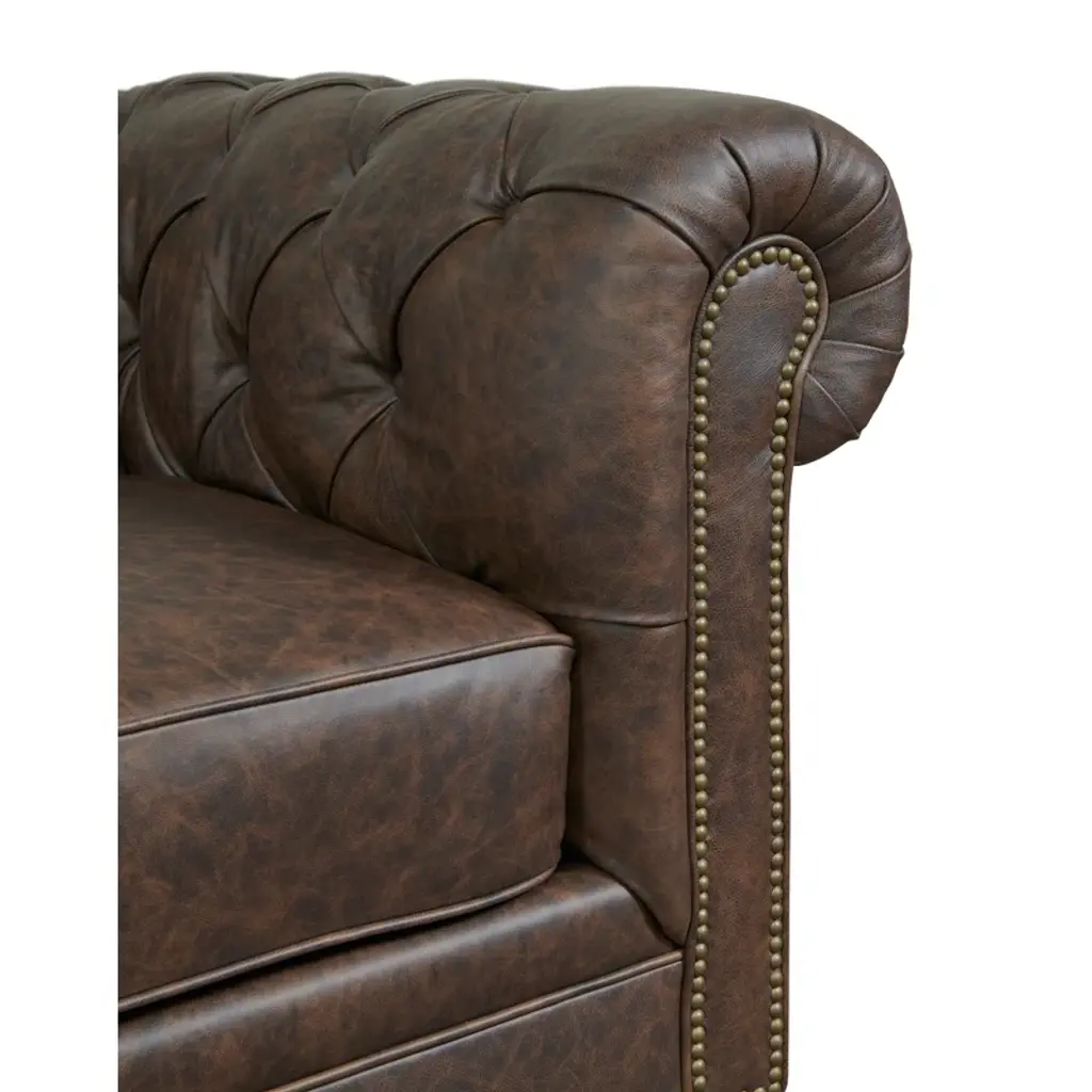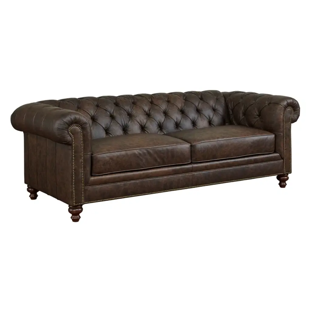 This chesterfield sofa is constructed of 100% genuine top grain Leather. The sofa is an an iconic design pairing bold lines with luxurios comfort. The elegantly rolled arms, individually placed nailhead trim, and long contiuous frame support an amply cushioned seat and back. Handbuilt by skilled craftsmen in the mountains of North Carolina, this sofa uses the top building features such as sinuous springs support and mortise & tenon joinery to create a sofa that lasts over the years.