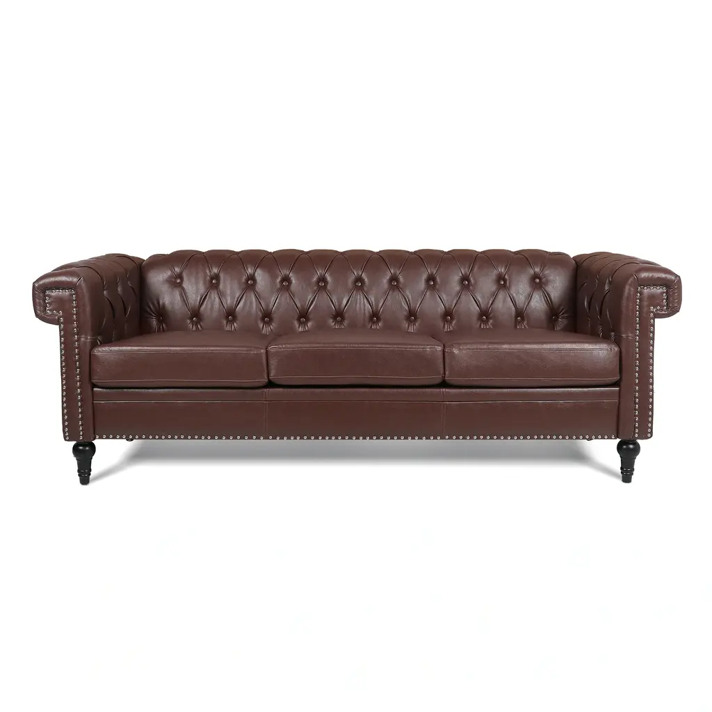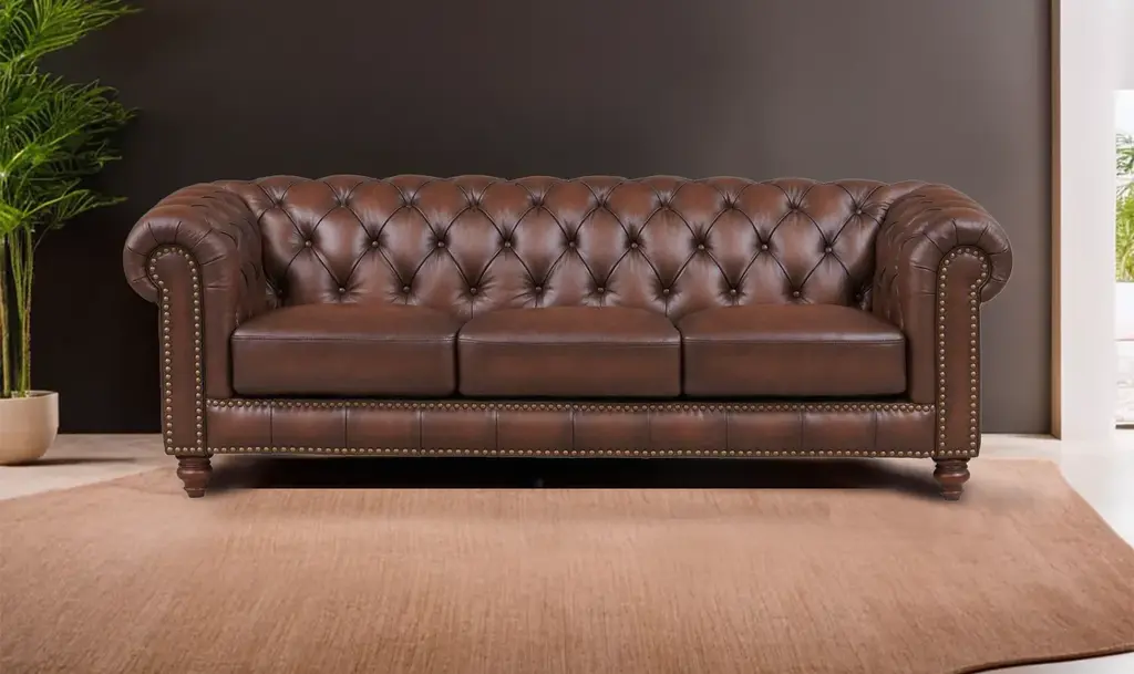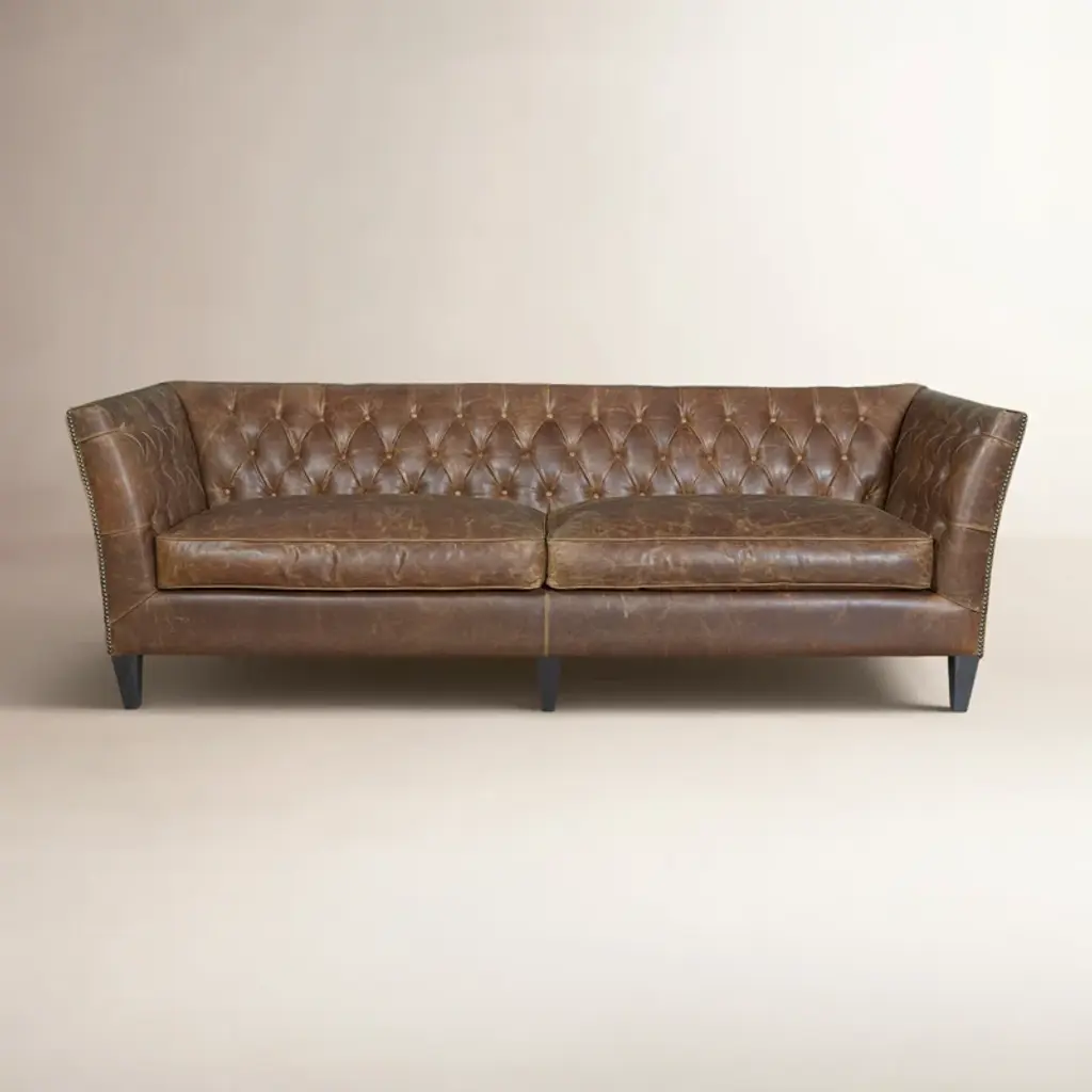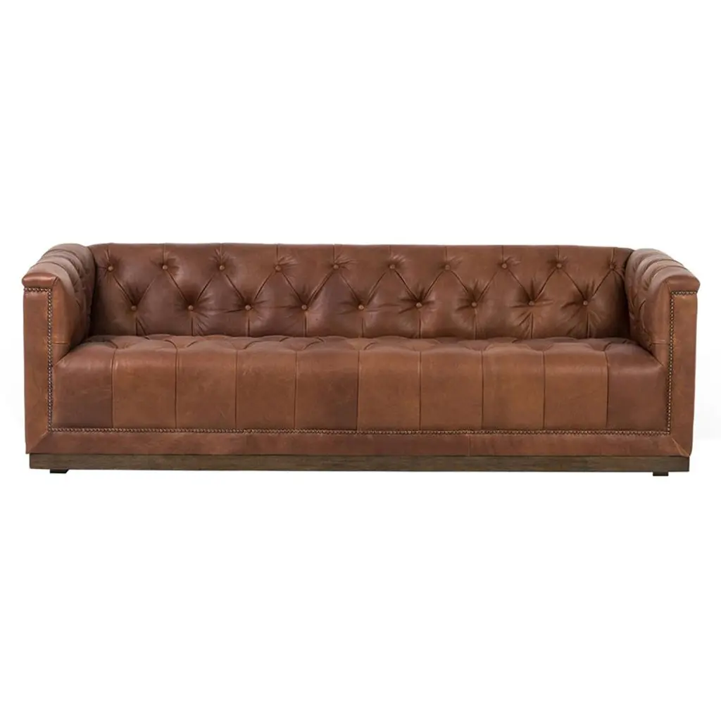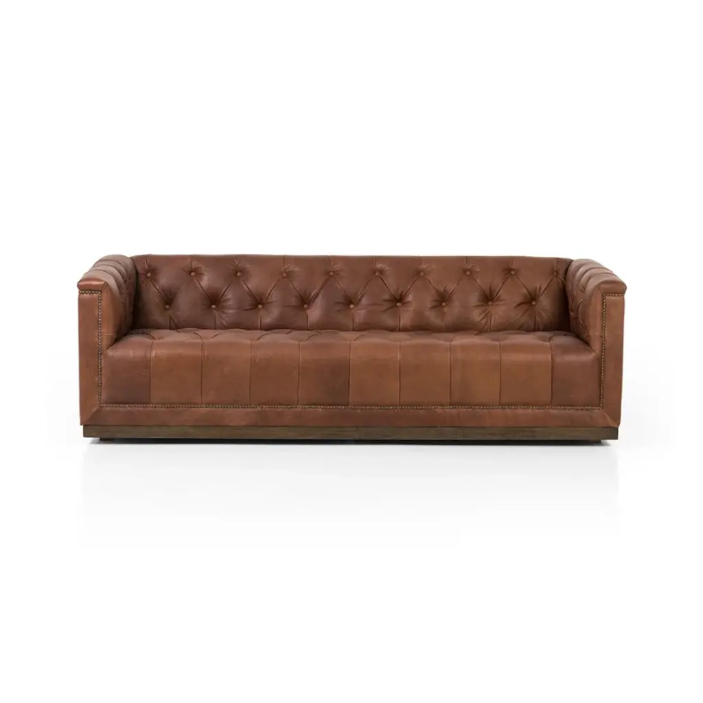 This chesterfield sofa is constructed of 100% genuine top grain Leather. The sofa is an an iconic design pairing bold lines with luxurios comfort. The elegantly rolled arms, individually placed nailhead trim, and long contiuous frame support an amply cushioned seat and back. Handbuilt by skilled craftsmen in the mountains of North Carolina, this sofa uses the top building features such as sinuous springs support and mortise & tenon joinery to create a sofa that lasts over the years.