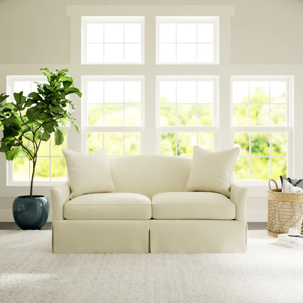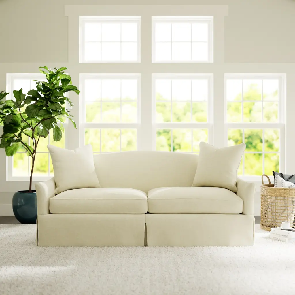 The Florian Sofa's gently curved back and arms pair with it's dressmaker skirt to create a piece that is elegant and timeless. Maintain it's quiet elegance with a neutral fabric, or throw caution to the wind and add a pop to your space with a funky color, texture, or pattern. Ships In 8-10 Weeks Dressmaker skirt Two 21" square throw pillows Tight back Two loose seat cushions As Shown Fabric: Rayburn Oatmeal, McQueen Blue with Affinity White Welt and Lois Select Tape Blue Skirt Trim (lifestyle) As Shown Finish: Antique Walnut If you choose to purchase COM, once you have placed your order a customer service rep will contact you regarding where to send your fabric. Please note that current lead time is 17-19 weeks once your fabric arrives at the factory, and if unused fabric is under 1.5 yards, it cannot be sent back to you.This product can be special ordered in additional fabrics, leathers, and cushion fillings. Click here to email us for for additional information about special ordering.This image is for illustrative purposes only. The colors shown are accurate within the constraints of lighting, photography, and the color accuracy of your screen.