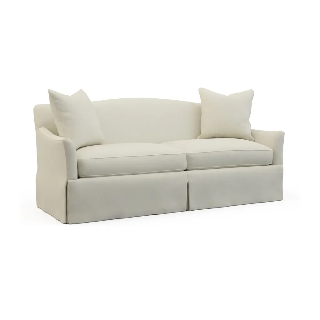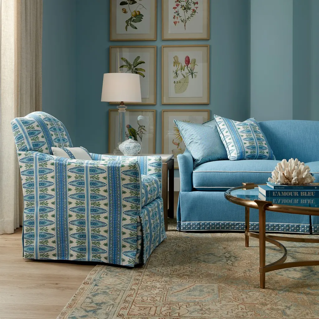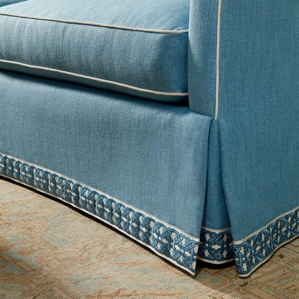 The Florian Sofa's gently curved back and arms pair with it's dressmaker skirt to create a piece that is elegant and timeless. Maintain it's quiet elegance with a neutral fabric, or throw caution to the wind and add a pop to your space with a funky color, texture, or pattern. Ships In 8-10 Weeks Dressmaker skirt Two 21" square throw pillows Tight back Two loose seat cushions As Shown Fabric: Rayburn Oatmeal, McQueen Blue with Affinity White Welt and Lois Select Tape Blue Skirt Trim (lifestyle) As Shown Finish: Antique Walnut If you choose to purchase COM, once you have placed your order a customer service rep will contact you regarding where to send your fabric. Please note that current lead time is 17-19 weeks once your fabric arrives at the factory, and if unused fabric is under 1.5 yards, it cannot be sent back to you.This product can be special ordered in additional fabrics, leathers, and cushion fillings. Click here to email us for for additional information about special ordering.This image is for illustrative purposes only. The colors shown are accurate within the constraints of lighting, photography, and the color accuracy of your screen.