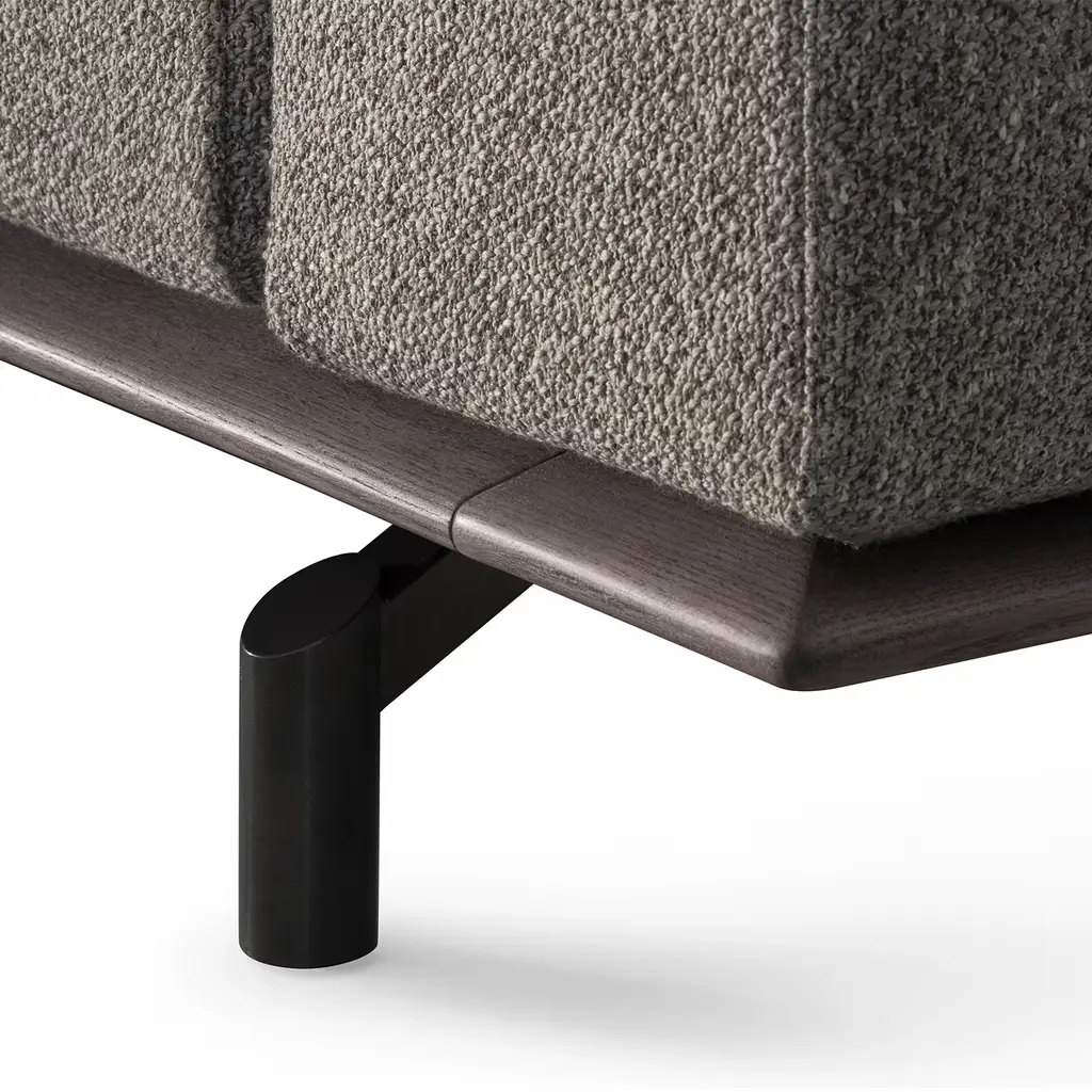 Its poplar plywood frame is completely removable and houses a generous amount of polyurethane foam upholstery of different densities, which is finally sealed by a removable cover to ensure impeccable hygiene. The almond-stained solid ash wood base is supported by charcoal grey lacquered metal legs. Please contact the Concierge for available finishing variants.