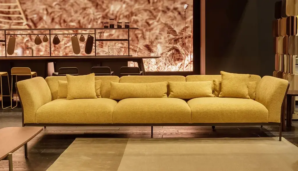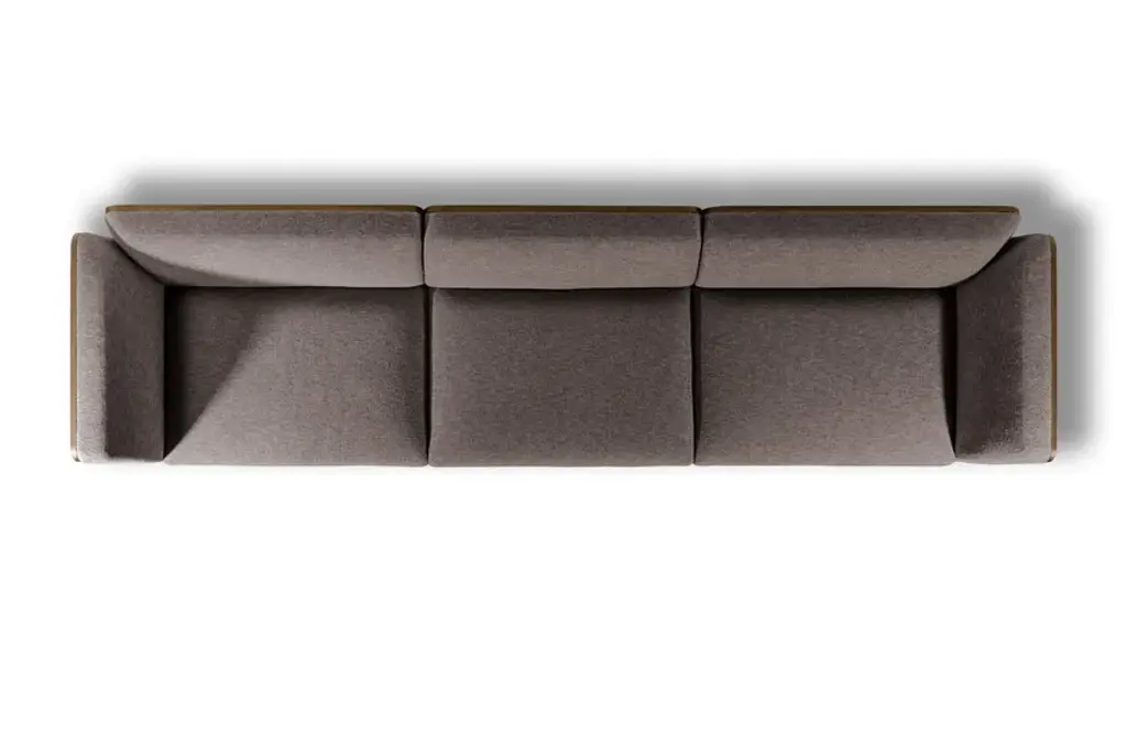 Fold is a 3 seater sofa with wooden seat, the standard finish of the wood is natural oak. On request, other essences and customized colors on RAL color are available. Steel structure and polypropylene feet. Fabric upholstery. The sofa is available in 2 different seat depths.Fold a sofa with two faces: the soft one for the seat and the architectural one for the backrest and armrests. Raised from the floor thanks to a tubular metal base with shaped legs, its wooden body appears even more solid and light despite its consistency. Like a sheet of paper, the wooden sides bend, contrasting the apparent rigidity of the material, to accommodate the ergonomic sinuosity of the upholstery.The family consists of 7 variants: a three-seater sofa with two different depths (82 and 100 cm), a two-seater sofa with two different depths (82 and 100 cm), an armchair with a depth of 82 cm, an armchair with a depth of 100 cm and an asymmetrical dormeuse with a depth of 100 cm. The characteristic fold of the wooden shell determines not only its name, but also the technological and ergonomic research for its realisation.