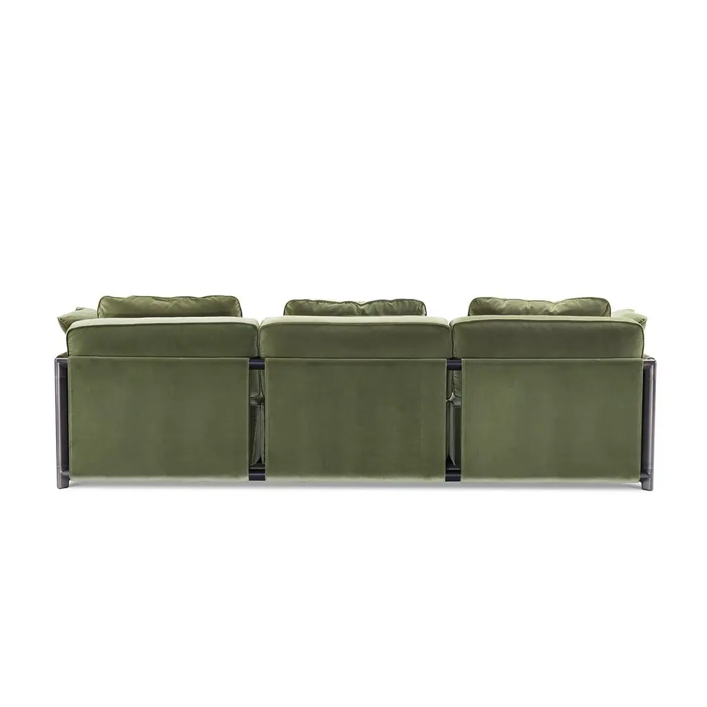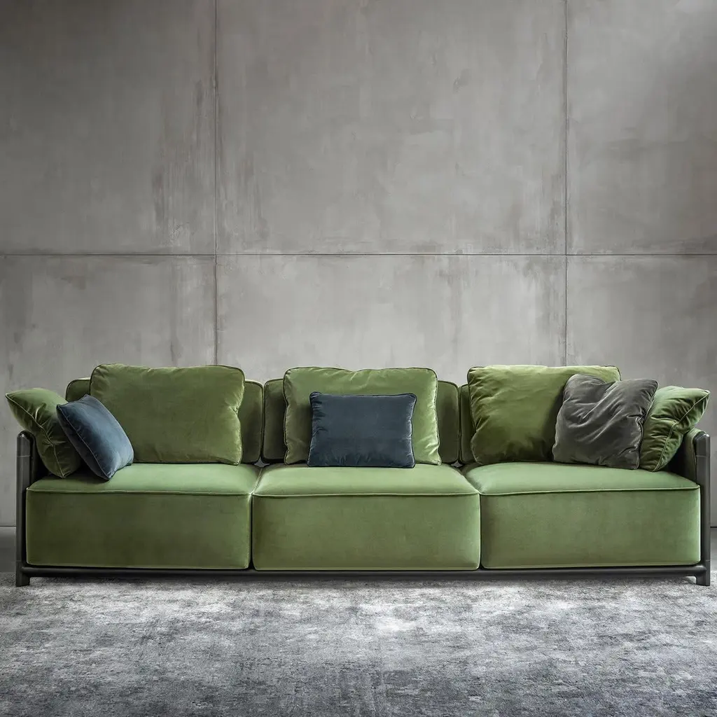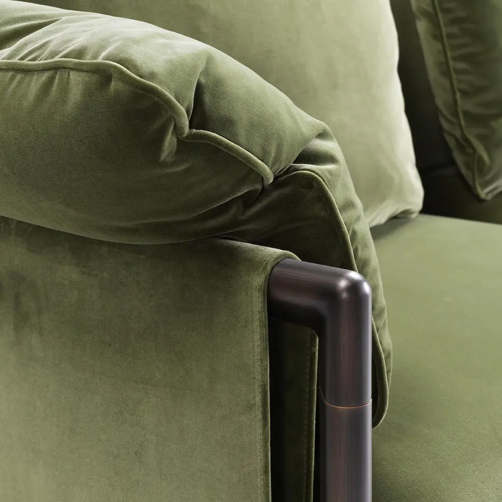 Plush volumes featuring a rich padding and a classy, olive-green fabric upholstery lend this sofa its pampering feel still not compromising on elegance. Also offered in other color options to best fit in any color palette, it invites you to enjoy moments of pure relaxation in the company of a good read or of friends for chilled conversations while having a cup of coffee. A solid, linear frame completes its design.